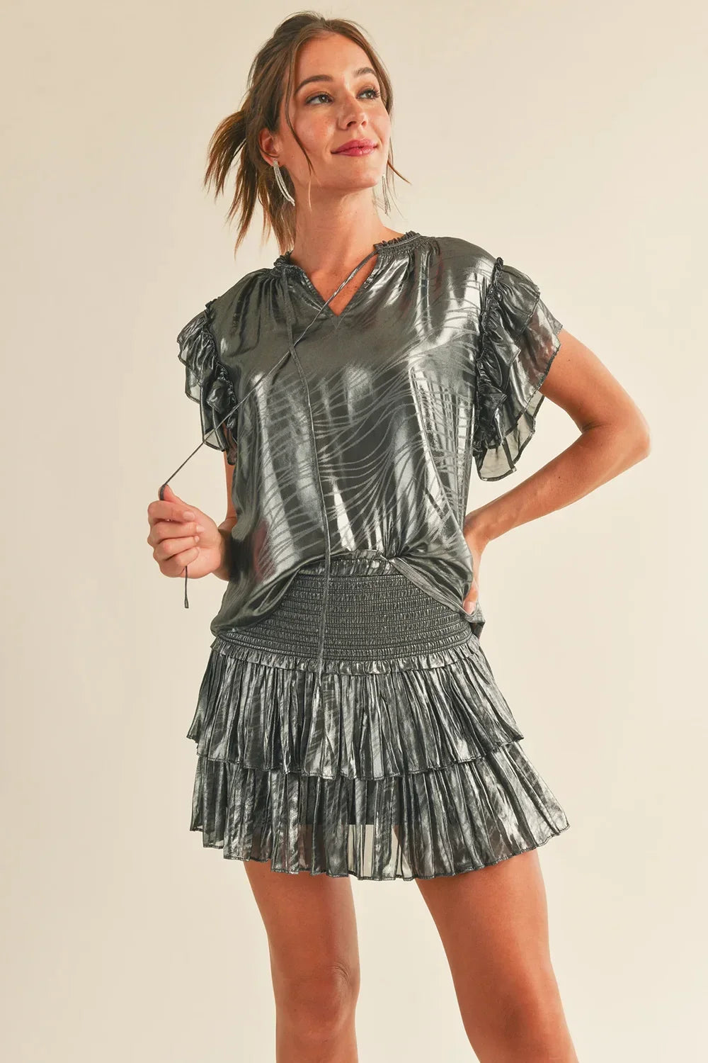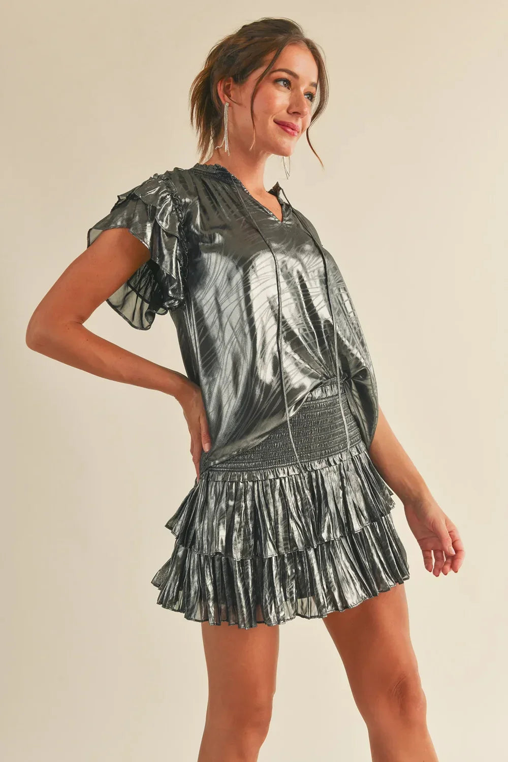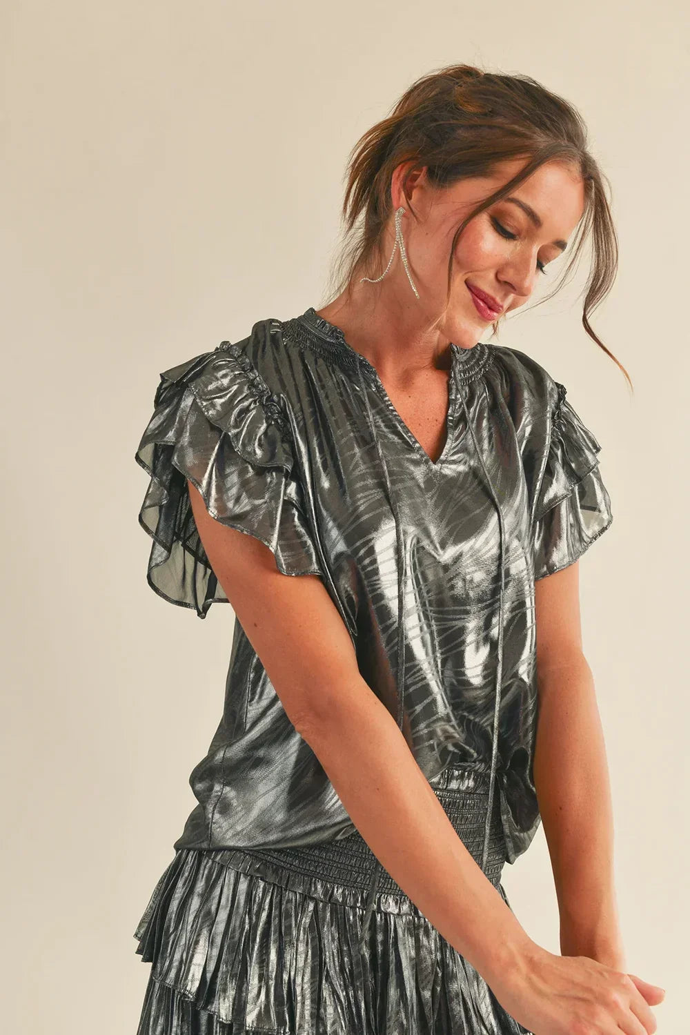 🖤 Features: Metallic crinkled fabric, ruffle cap sleeves, V-neckline with tie detail, elastic smocked waistband, cropped silhouette, textured metallic finish, statement sleeves, party-ready style, comfortable fit, true to size fit