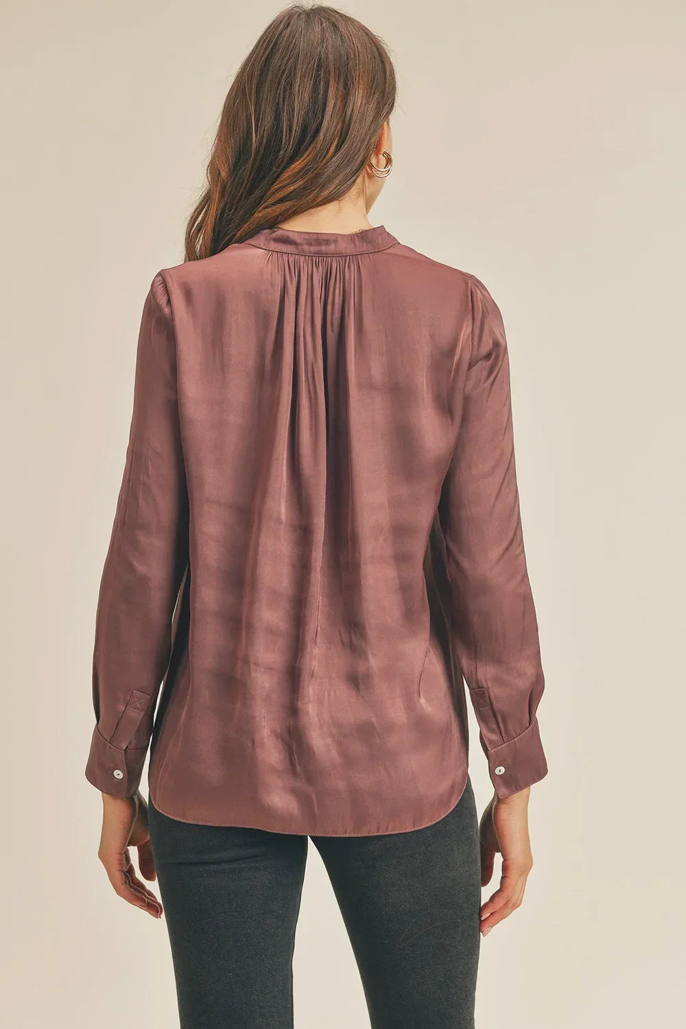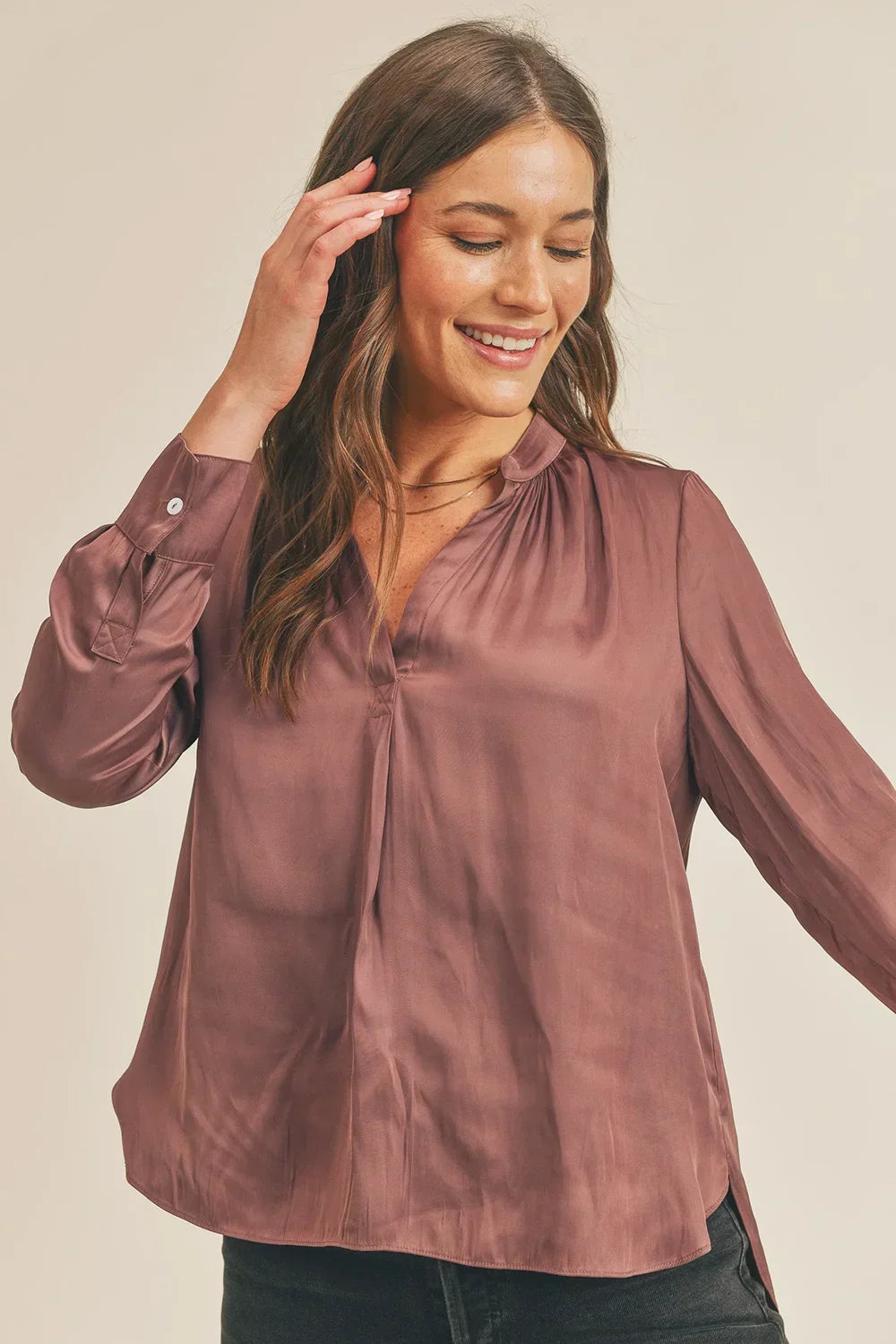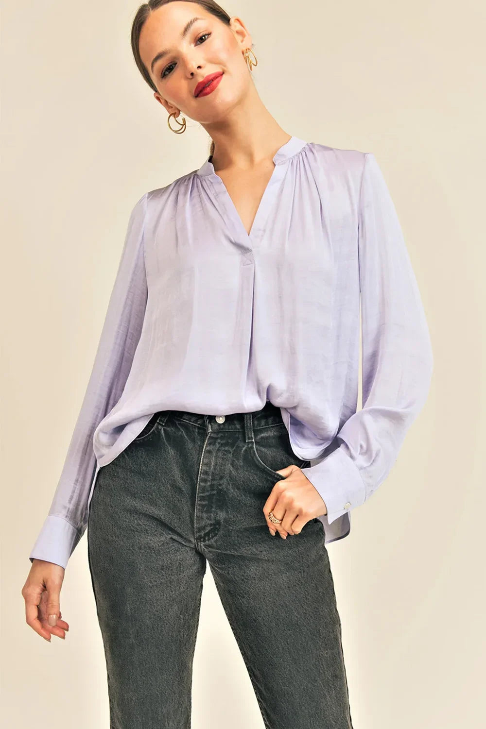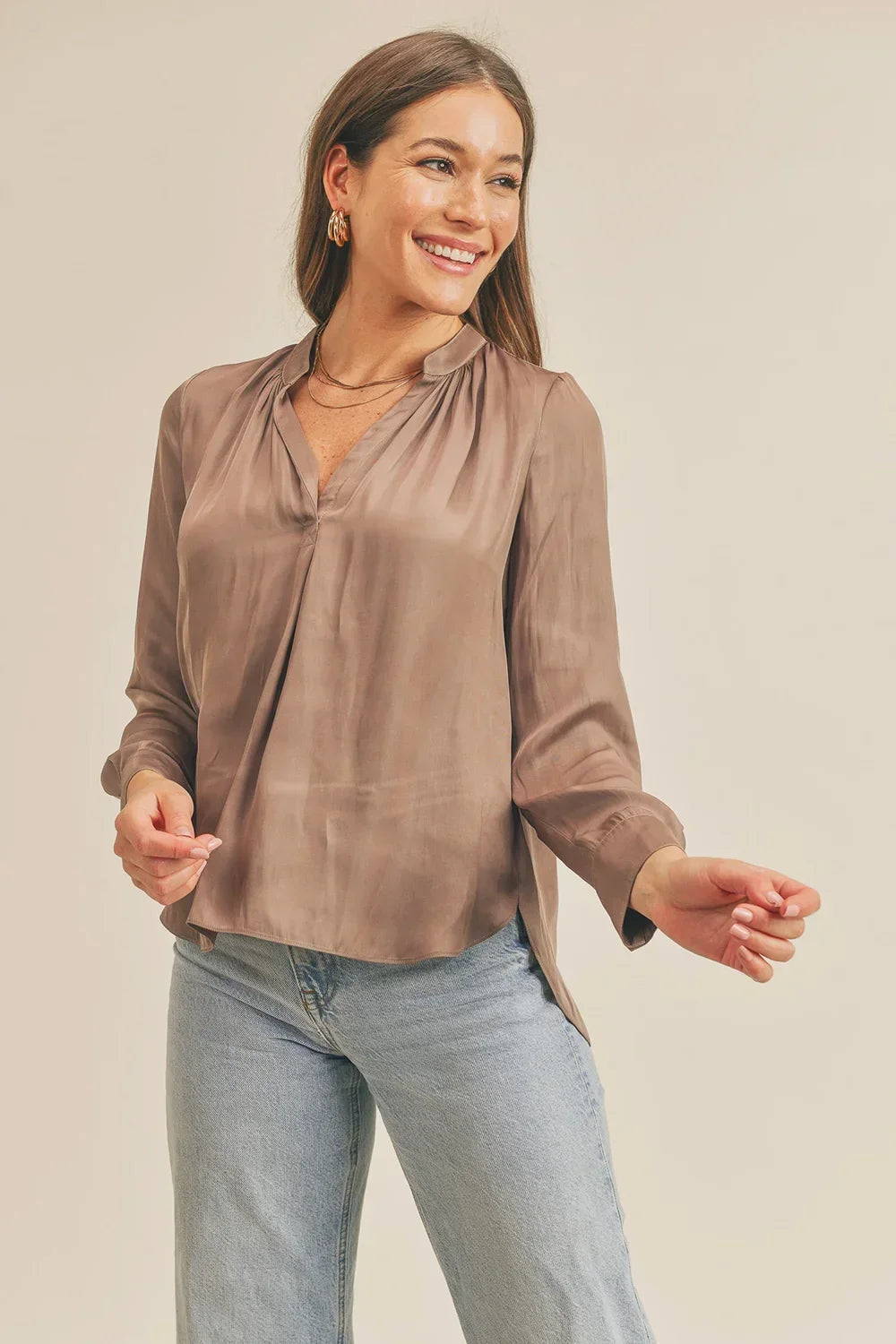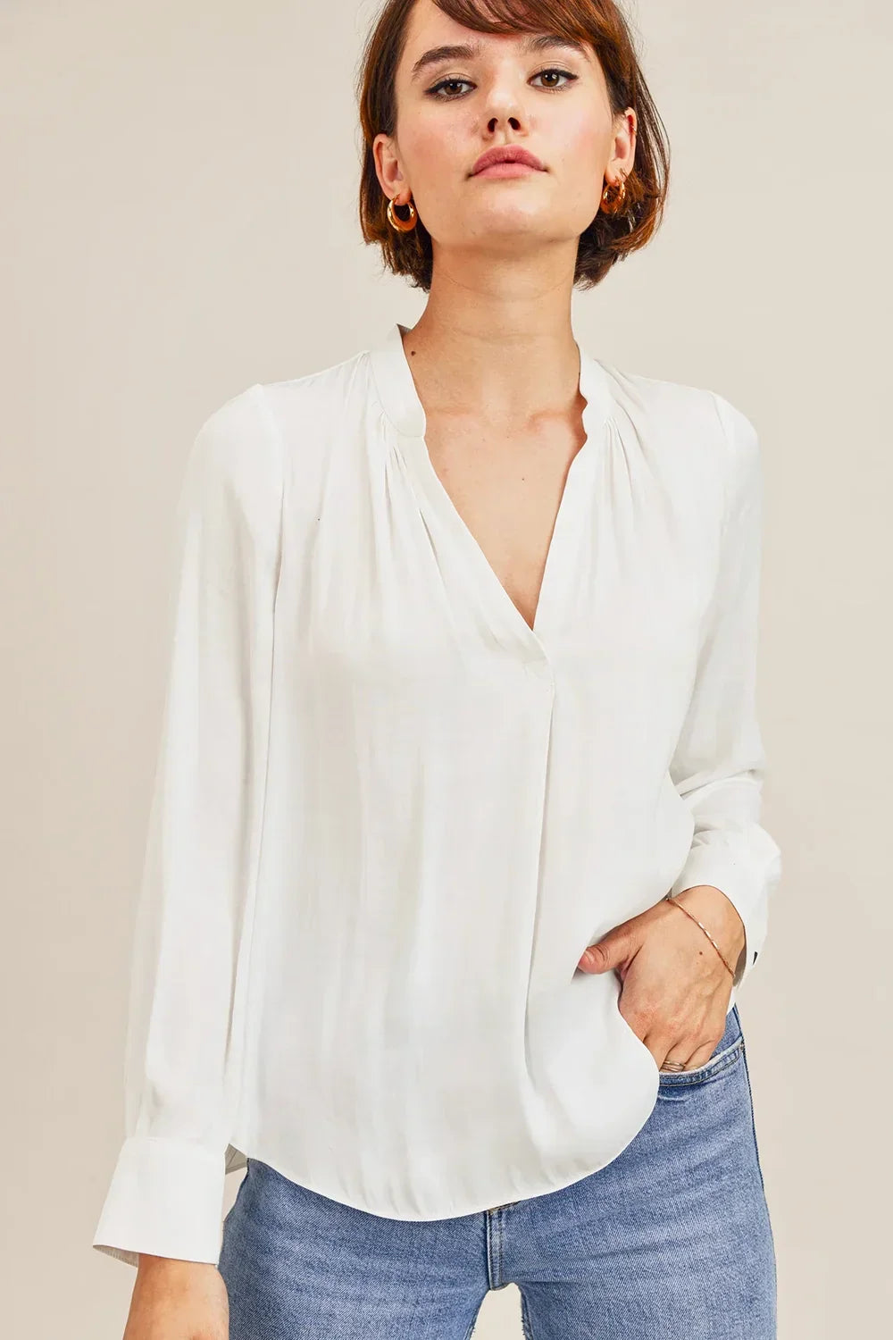 Gathered Shoulder V-Neck Long Sleeve Flowing Blouse