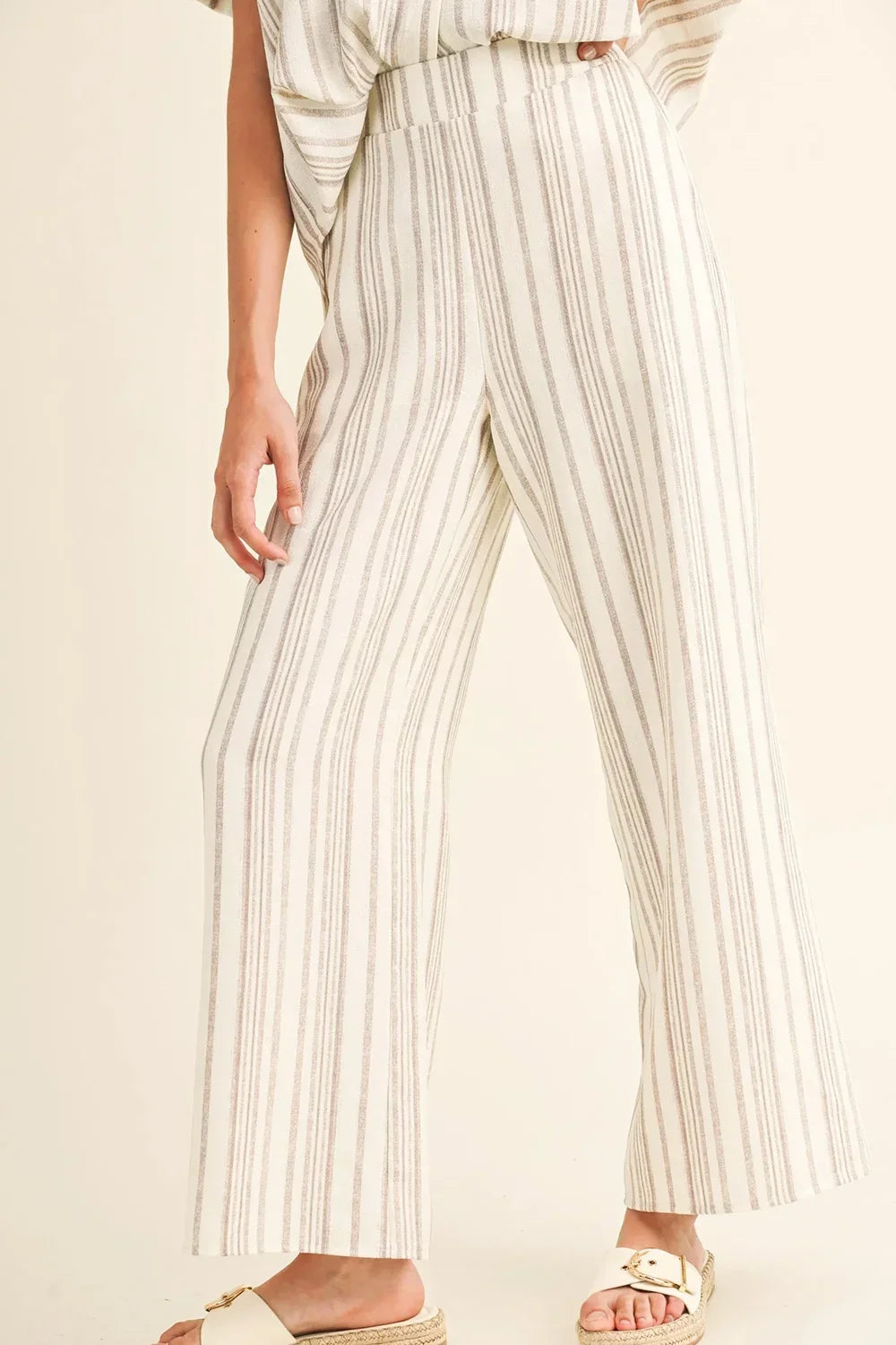 Stay effortlessly chic and beautifully comfortable with our stunning Linen Striped Two Piece Set. This gorgeous women's matching set features a classic neutral stripe pattern in soft cream and taupe tones, perfect for boutique owners seeking that timeless minimalist aesthetic their customers absolutely love. Designed for the confident woman who appreciates versatile coordinated pieces, this linen shirt and wide leg pants combo transitions seamlessly from casual weekend vibes to polished vacation looks with its clean lines and sophisticated charm.