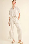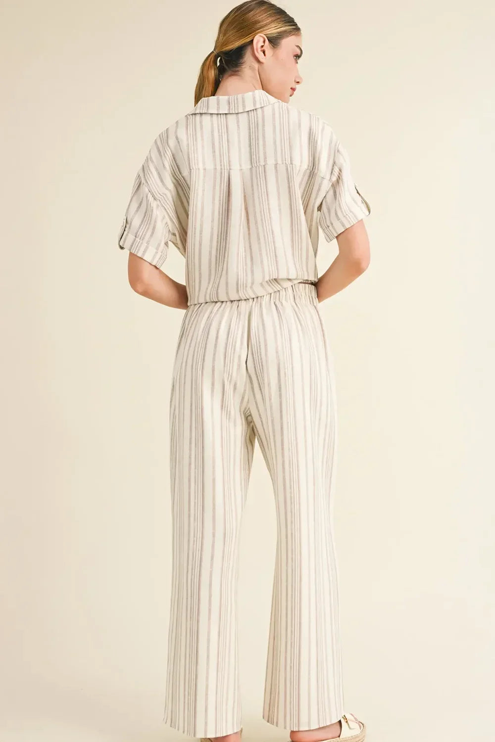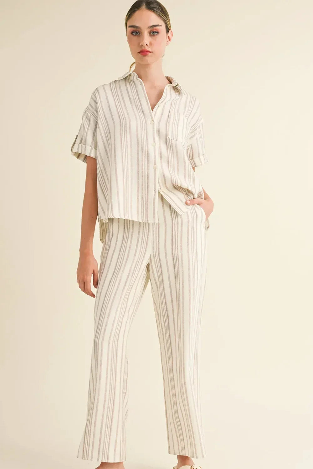 Linen Striped Button Down Short Sleeve Shirt and Wide Leg Pants Two Piece Set