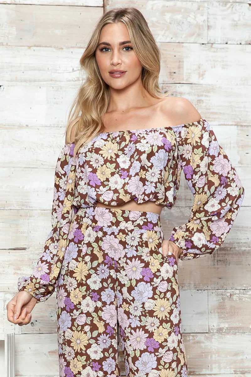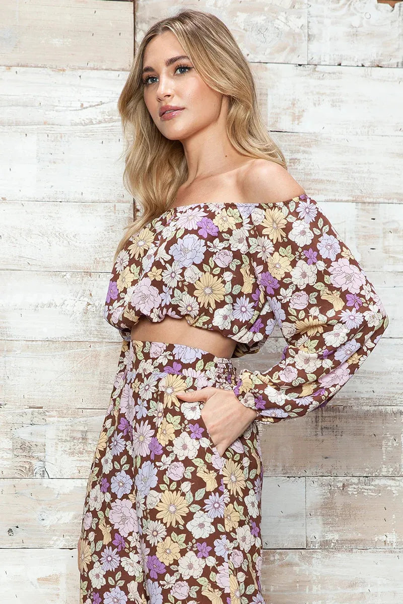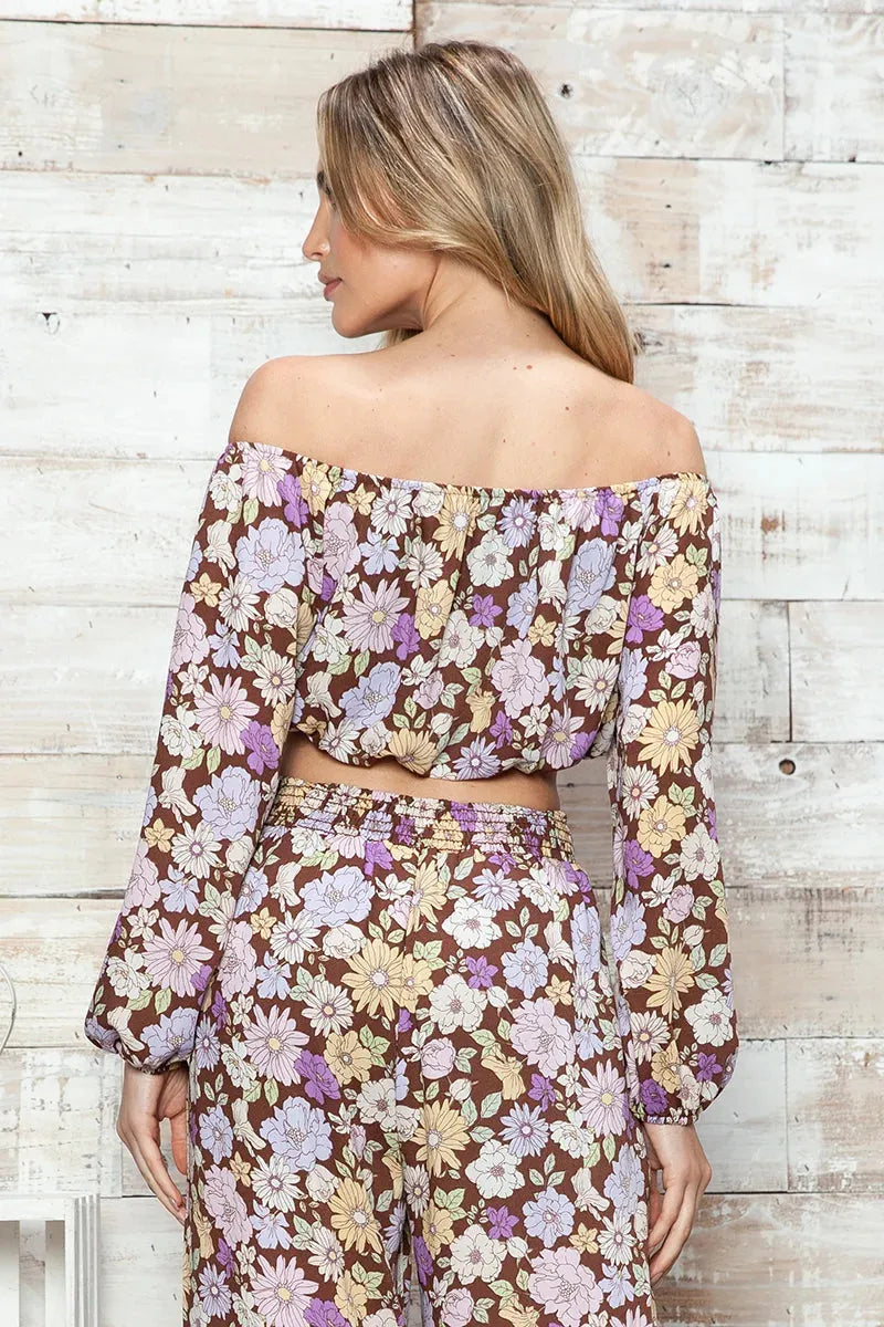 Add a vintage-inspired touch to your boutique collection with our Retro Floral Crop Top. This charming piece features a rich chocolate brown background adorned with dreamy lavender, purple, and buttery yellow blooms that create an eye-catching aesthetic your fashion-forward customers will adore. The flattering off-shoulder design with billowy sleeves offers that perfect blend of sweet nostalgia and contemporary style.