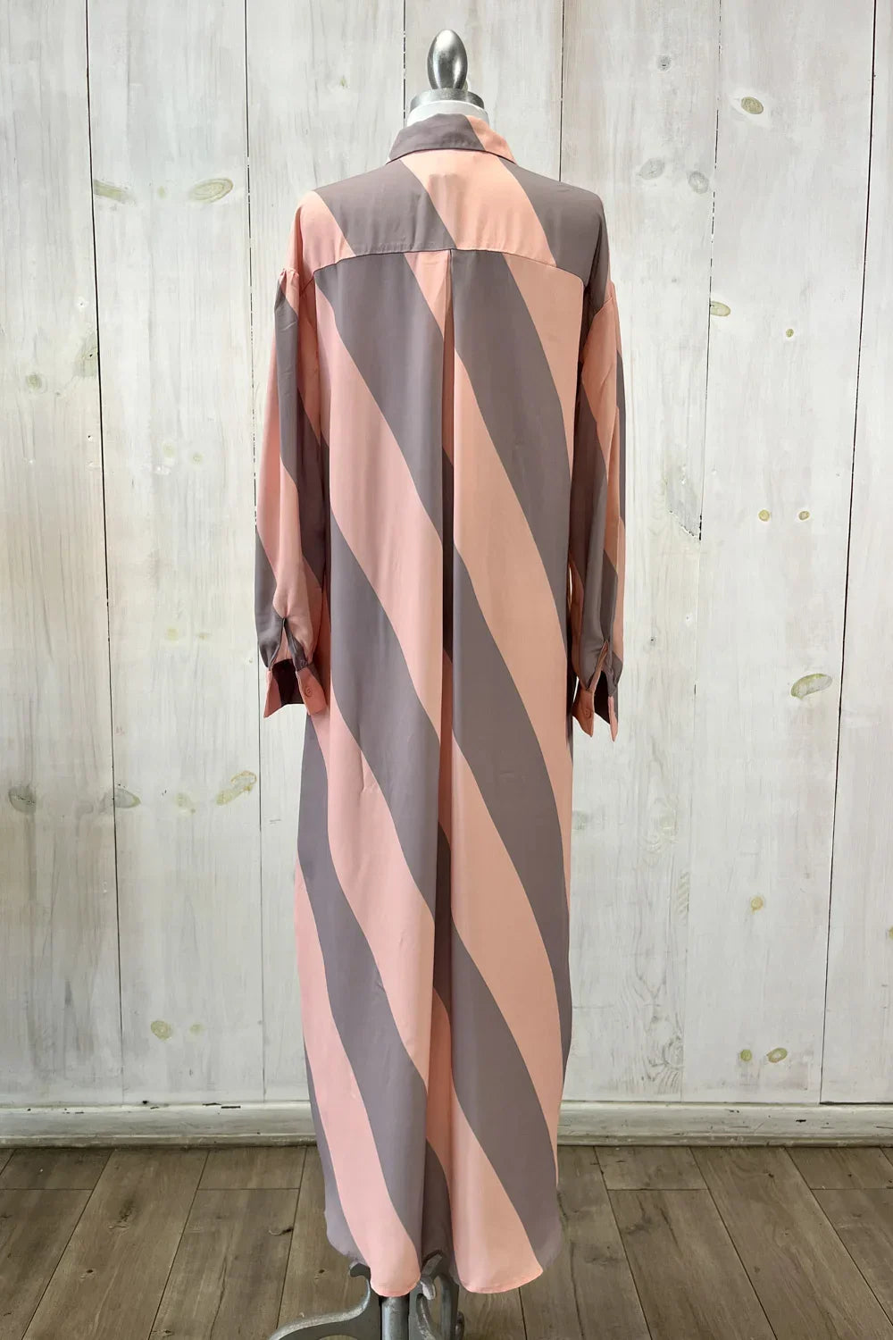 🖤 Features: Eye-catching diagonal stripe pattern, soft neutral color palette of peach, taupe, and gray tones, classic collared neckline, full button-front closure for versatile styling, long sleeves with button cuffs, flowy maxi length, lightweight breathable fabric, relaxed comfortable fit, side slits for ease of movement, versatile shirt dress design, can be worn open or closed, timeless silhouette, unlined for maximum comfort