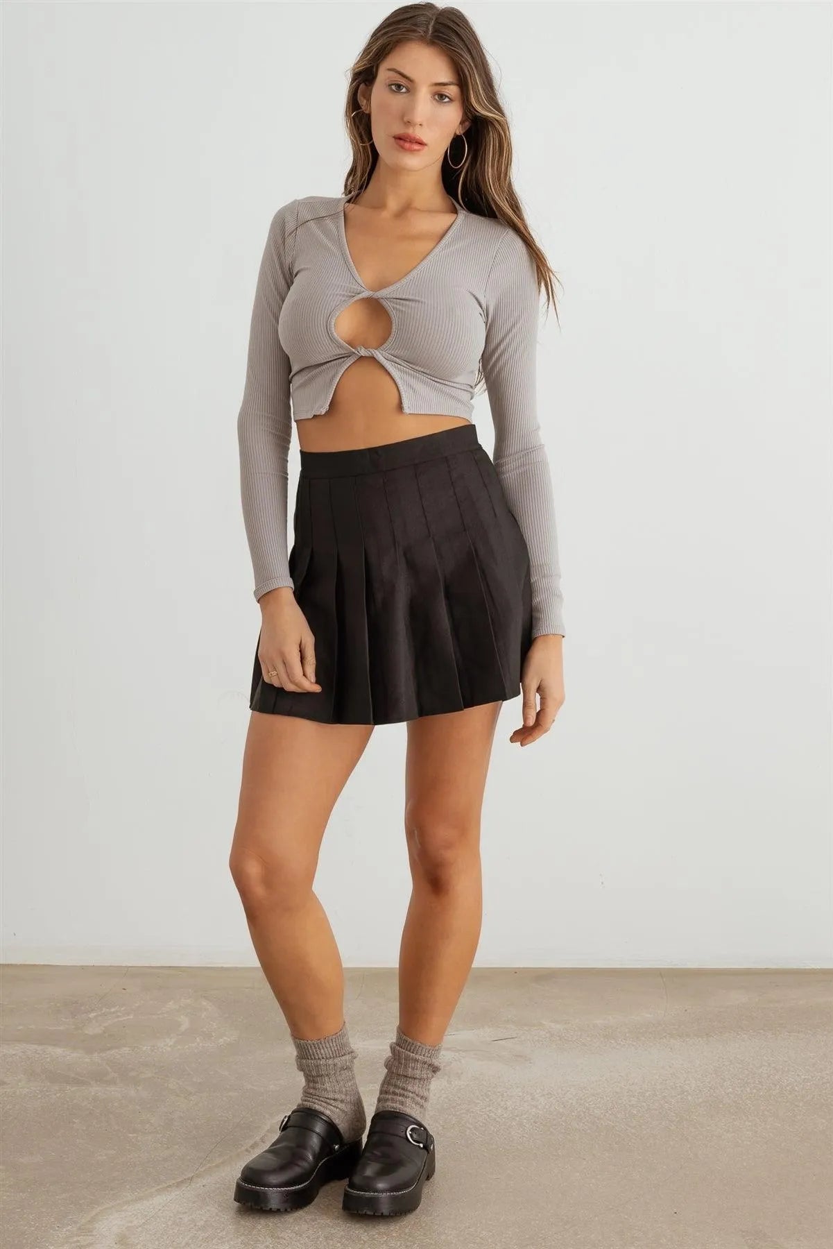 🖤 Item Features: Off-white, ribbed, long sleeves, round neckline, front twist & cut-out details, cropped length top, semi-stretchy, not see through, unlined, casual, cute, stylish, trendy, cute