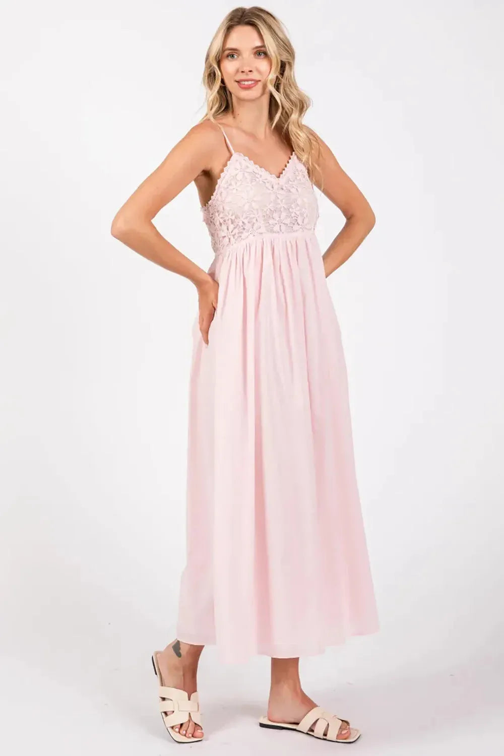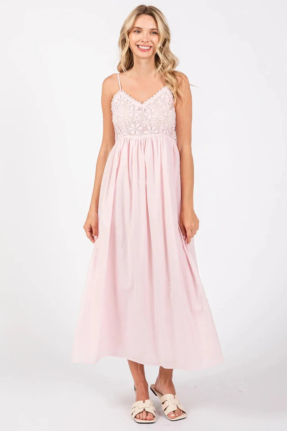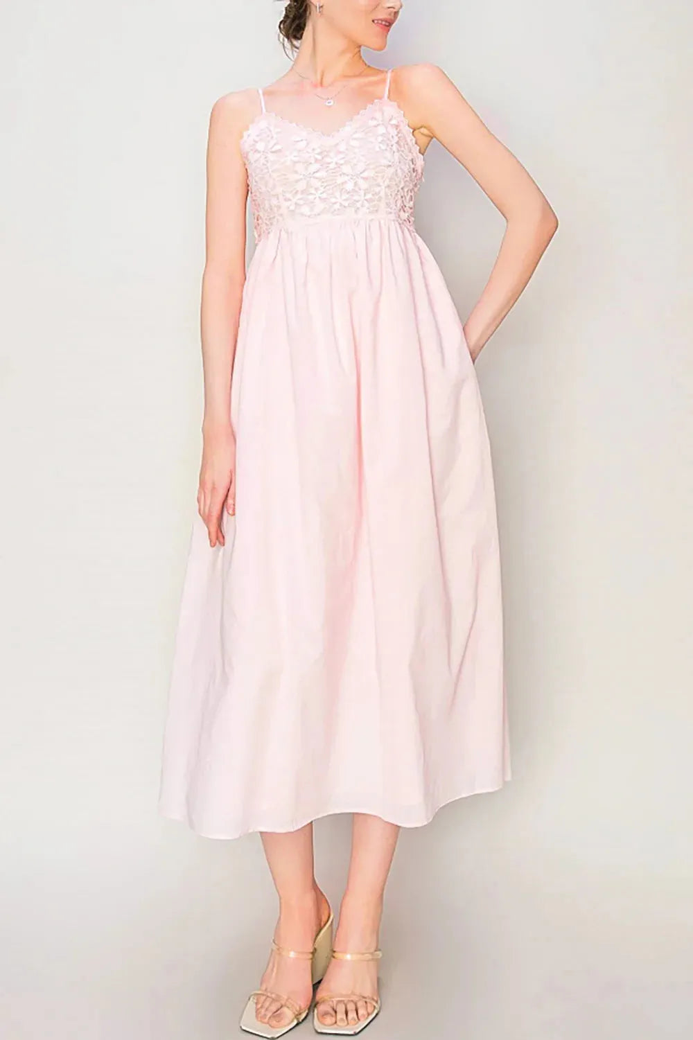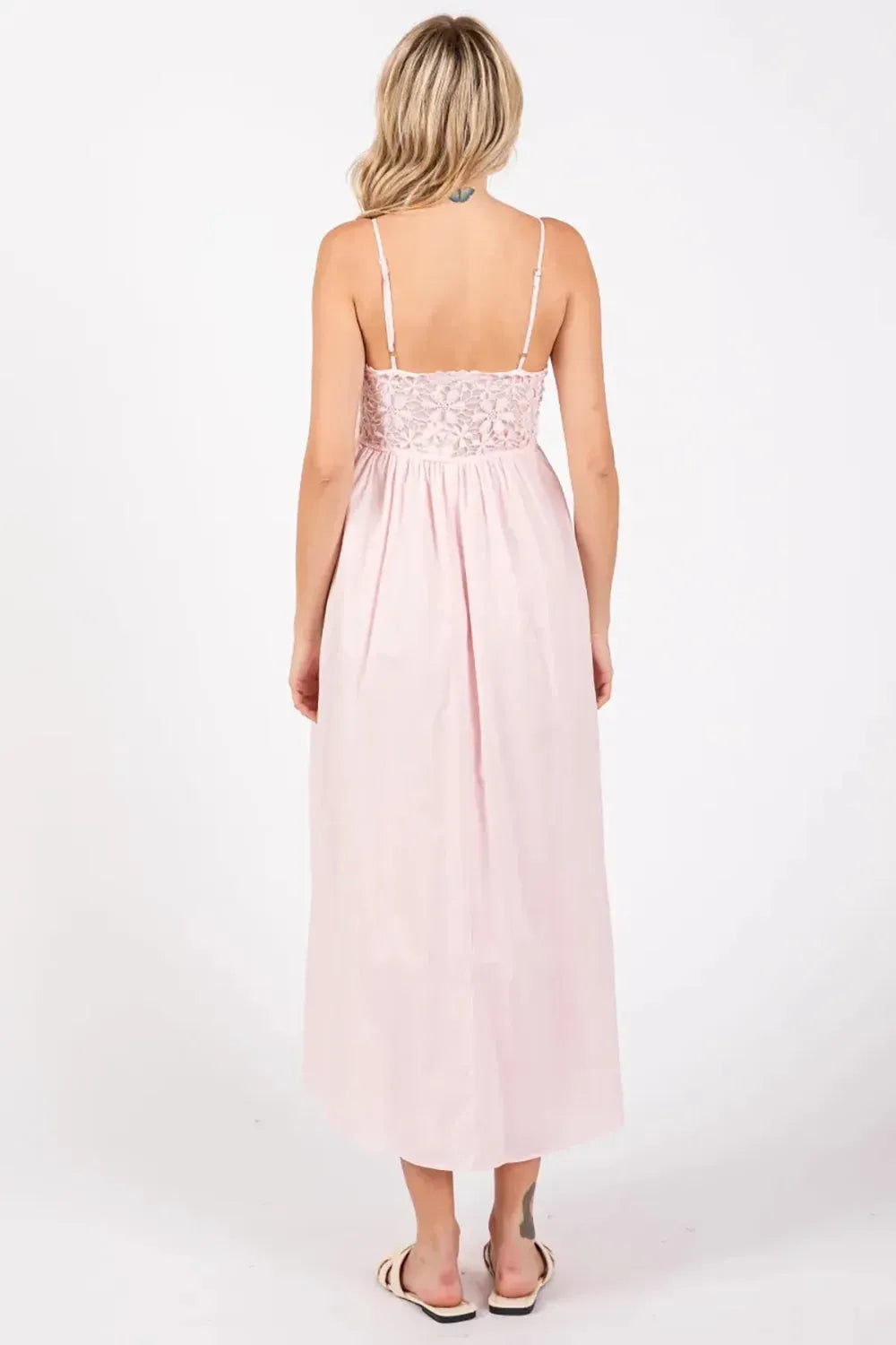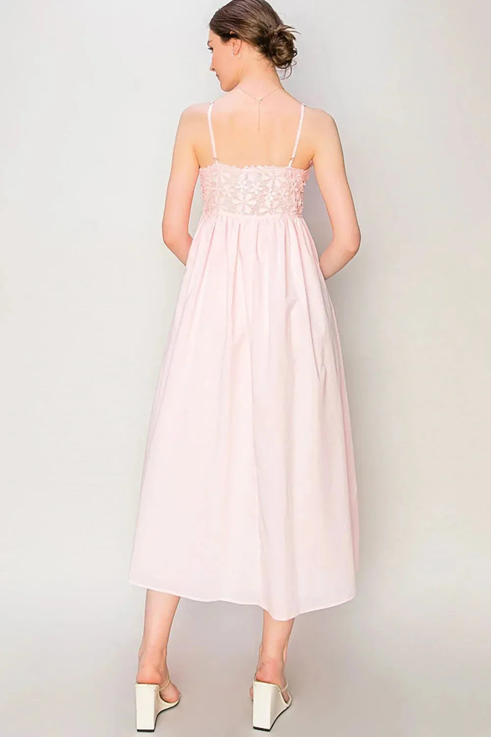 Romantic Blush Lace Spaghetti Straps Bodice Cotton Midi Dress
