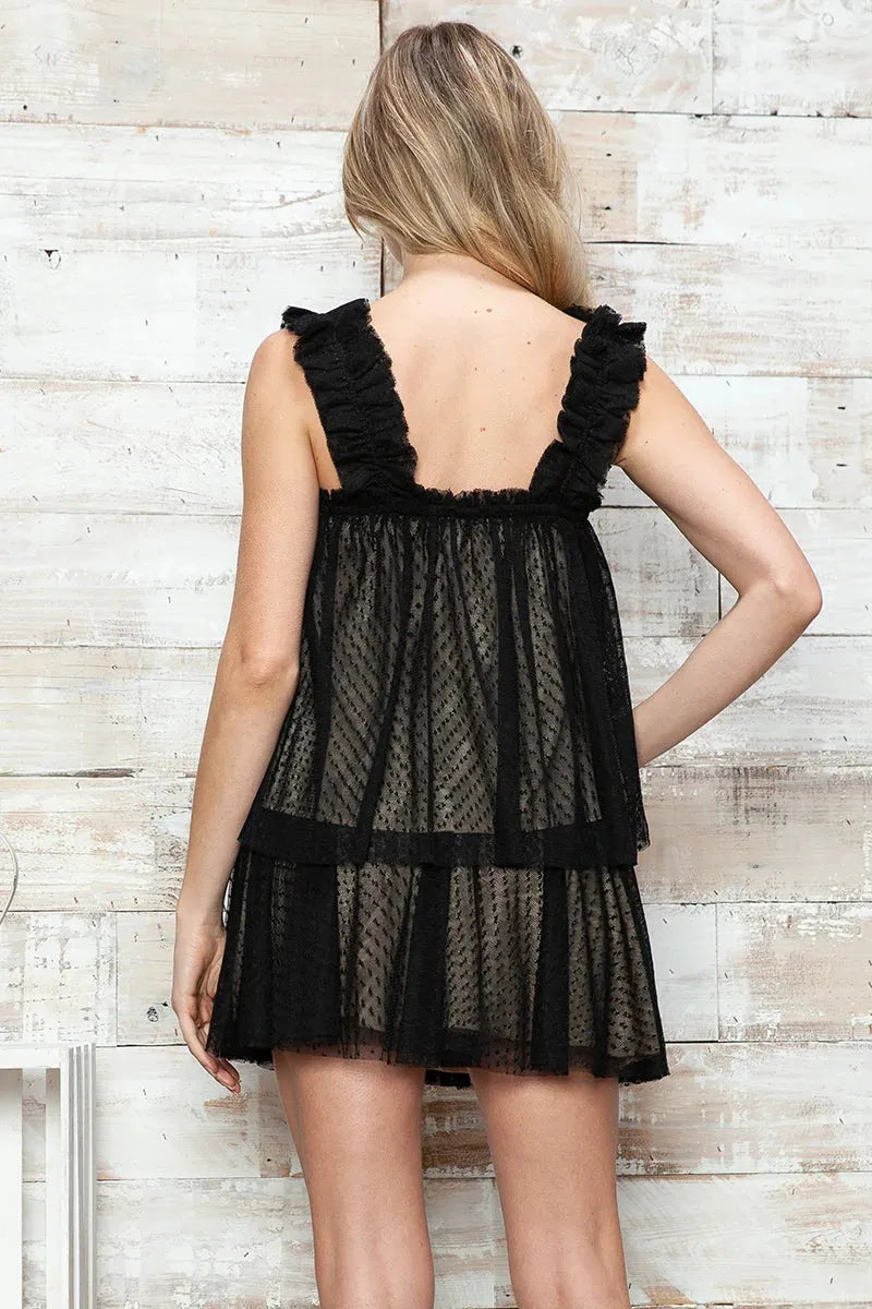 🖤 Features: Two-piece separates, square neckline with ruffle detail, tiered skirt design, semi-sheer Swiss dot fabric, fully lined, open back detail, lightweight construction, comfortable fit, mix-and-match versatility