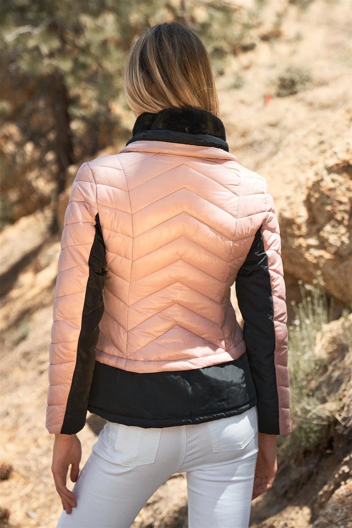 Be bold and brave the cold in our Rose & Black Chevron Quilted High Neck Double Zip Puffer Jacket! Keep warm and stylish in this trendy winter sports attire with fuzzy faux fur lining, chevron quilted padding, and black contrast details. Zip up and hit the slopes with confidence!