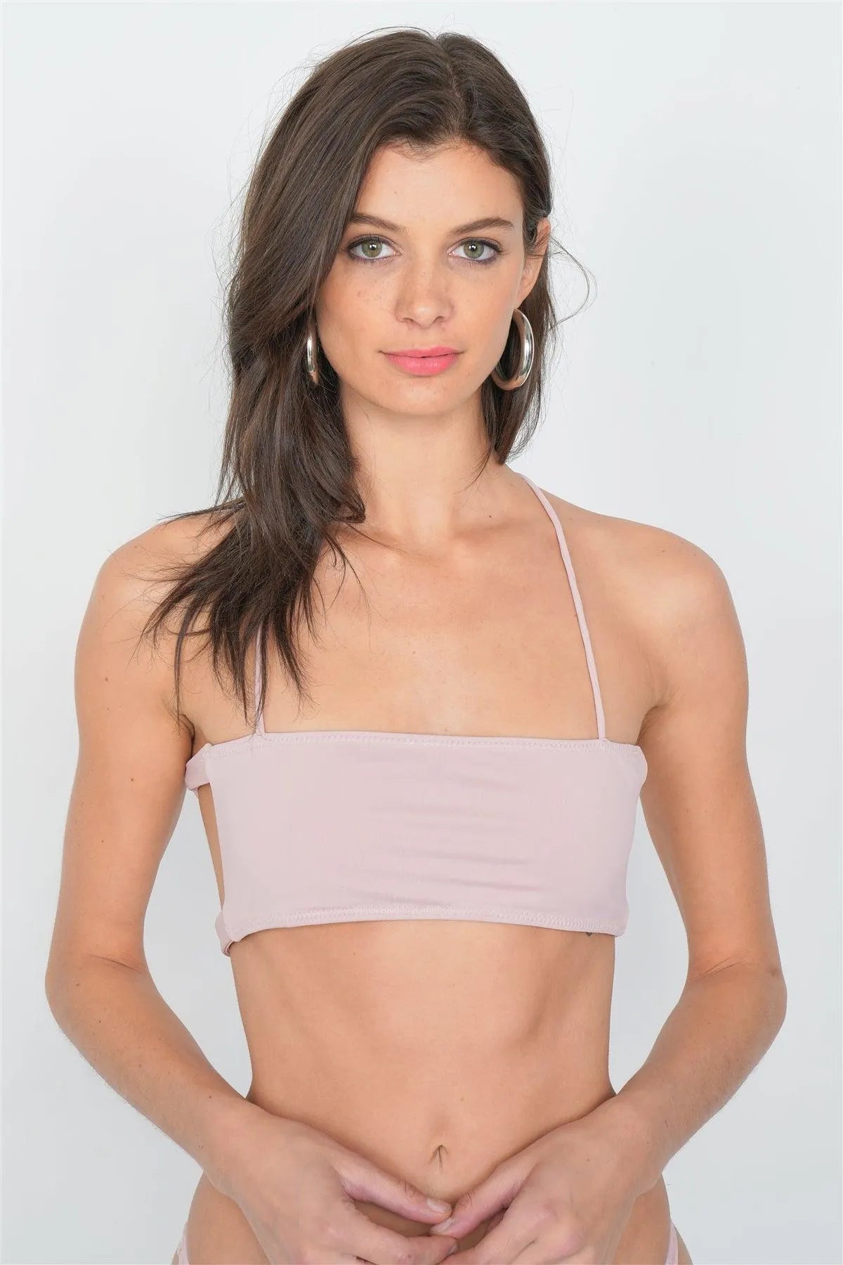 Bikini Top features: bandeau, solid, lace up front closure, criss-cross adjustable cami straps, side wire, crop length, mini, chic, stretchy, unlined.Size Small Top measurements: Length: 5"Model is 5'9 wearing a size Small ( Waist: 23.5", Bust: 32B, Hips: 36")Bikini Bottoms features: solid, high waist, cheeky, summer, solid, bodycon fit, bikini, unlined, super stretchy.Size Small Bottoms: Length: 8", Waist: 26"Item comes pre-packed with hang tagsTrue to SizeAlso available in Black and Sage