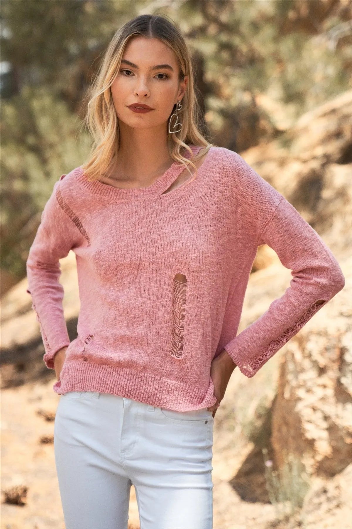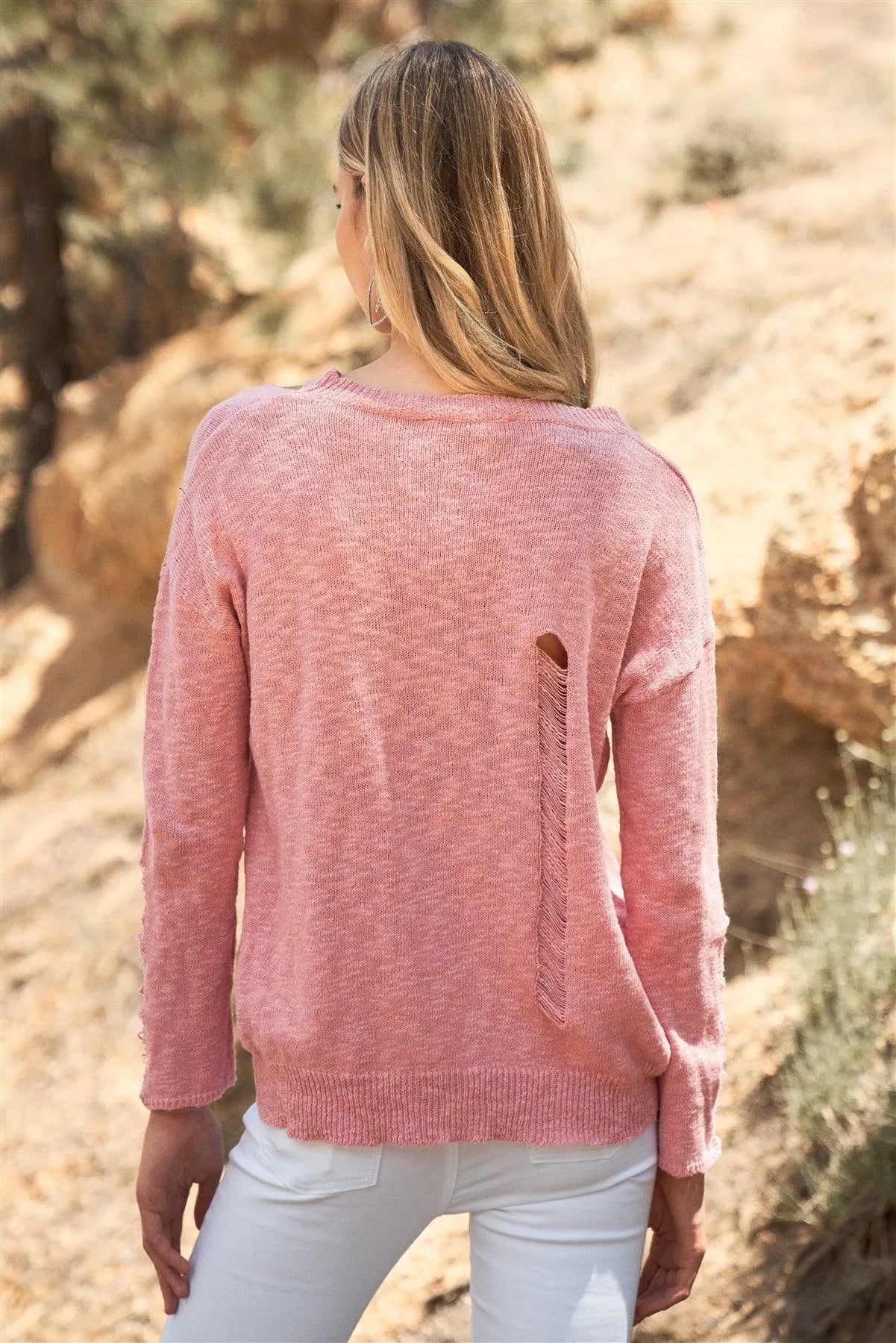 Rose Pink Knit Ruined Detail Long Sleeve Distressed Sweater Top