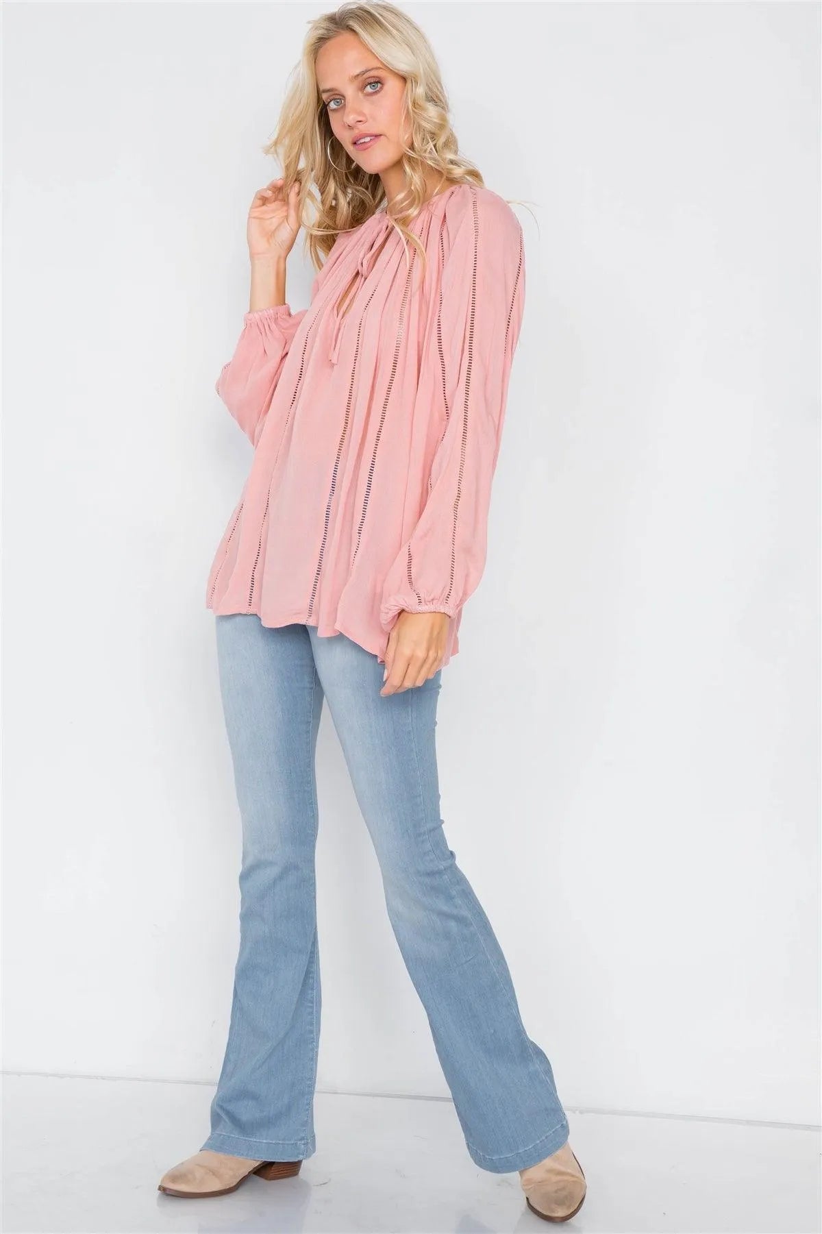 Marsala Pink White Crochet Lace Trim Boho Relaxed Fit Long Sleeve Pullover TopVendor:White Birch
