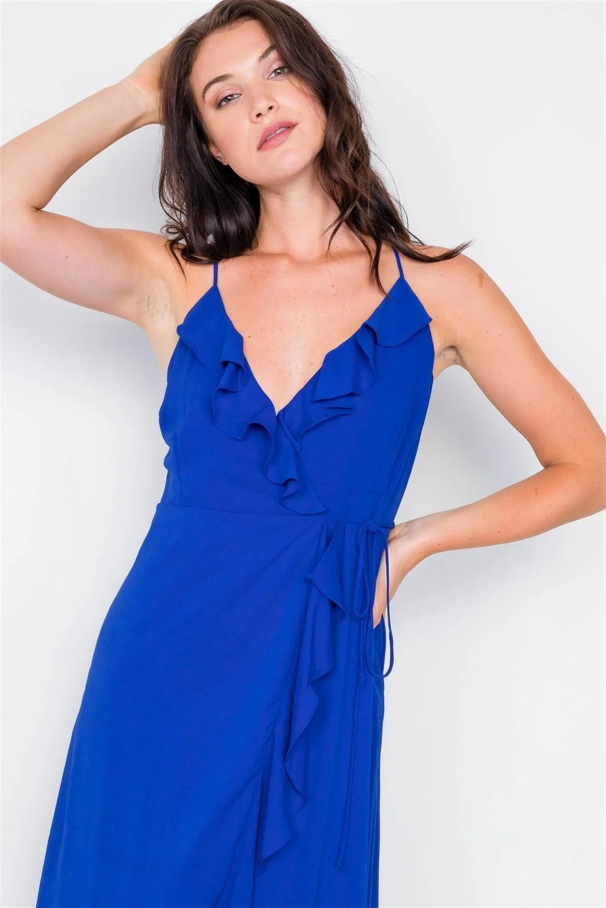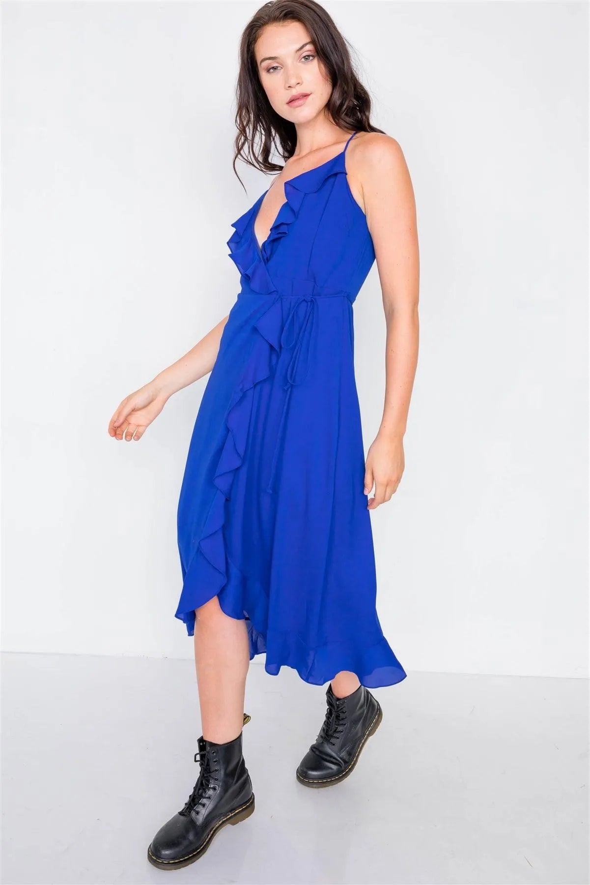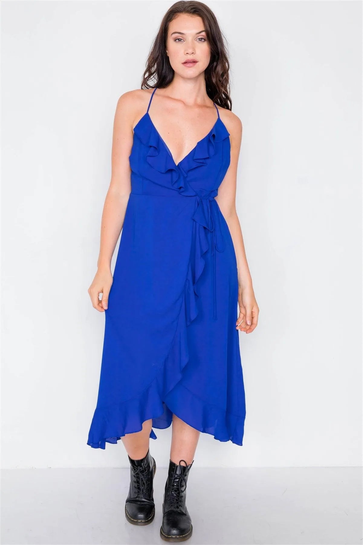 Royal Blue Flounce Cami Solid Midi Wrap Dress / 2-2-2