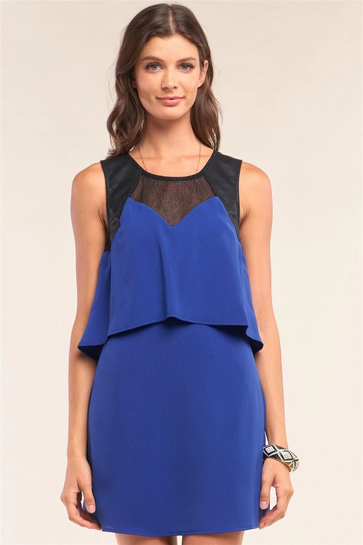Royal Blue Sleeveless Layered Vegan Leather Detail Mini Dress /1-3-2