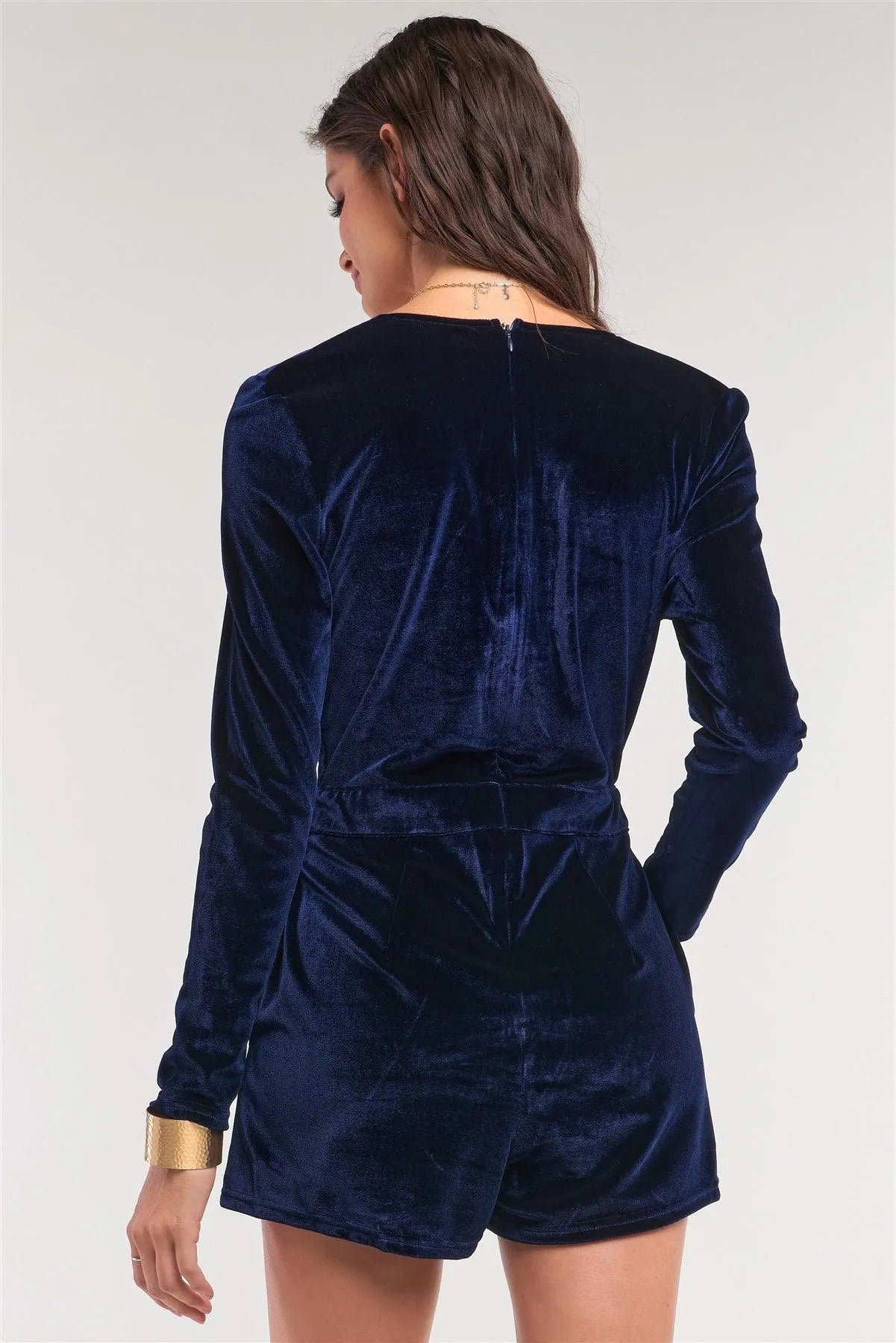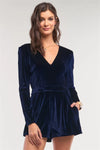 Royal Blue Velvet Long Sleeve Plunging Neckline Fitted Romper /2-2-1