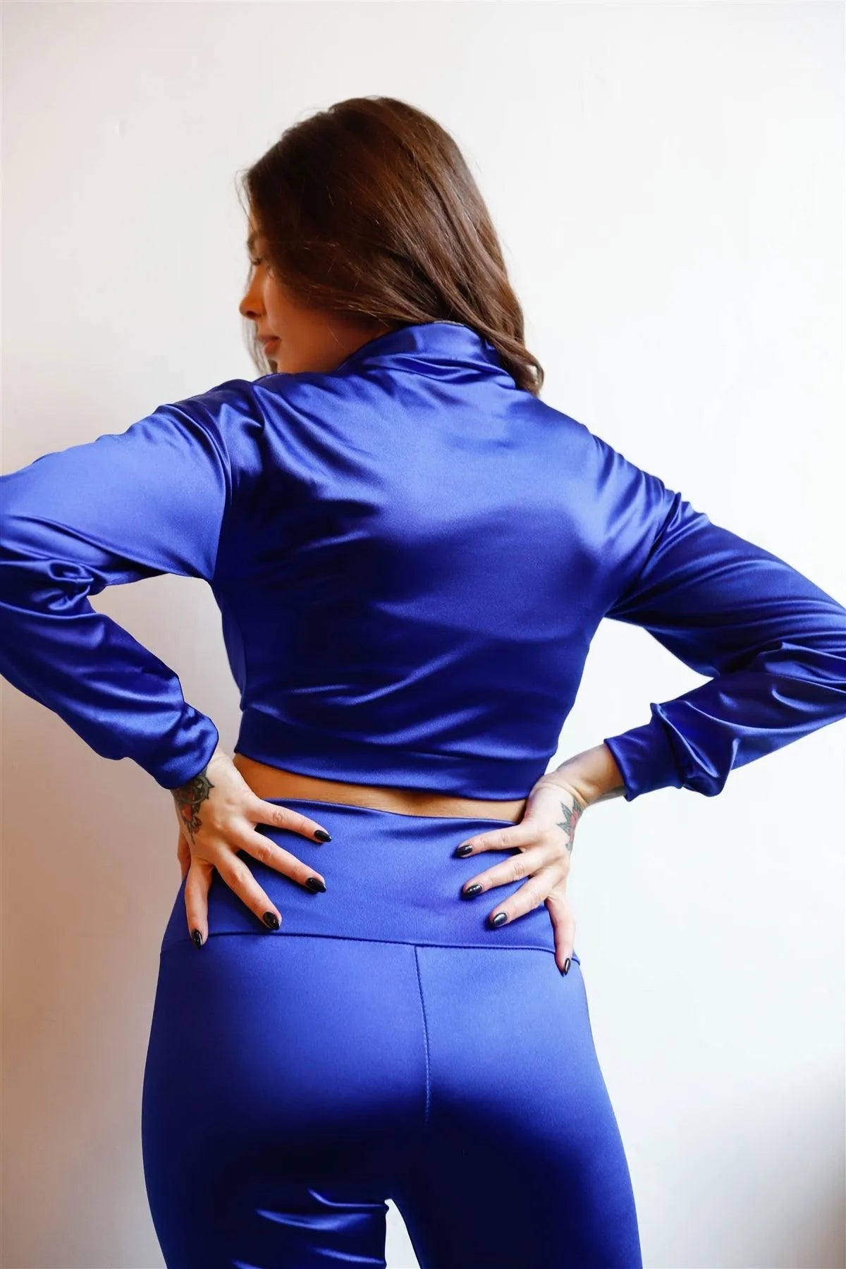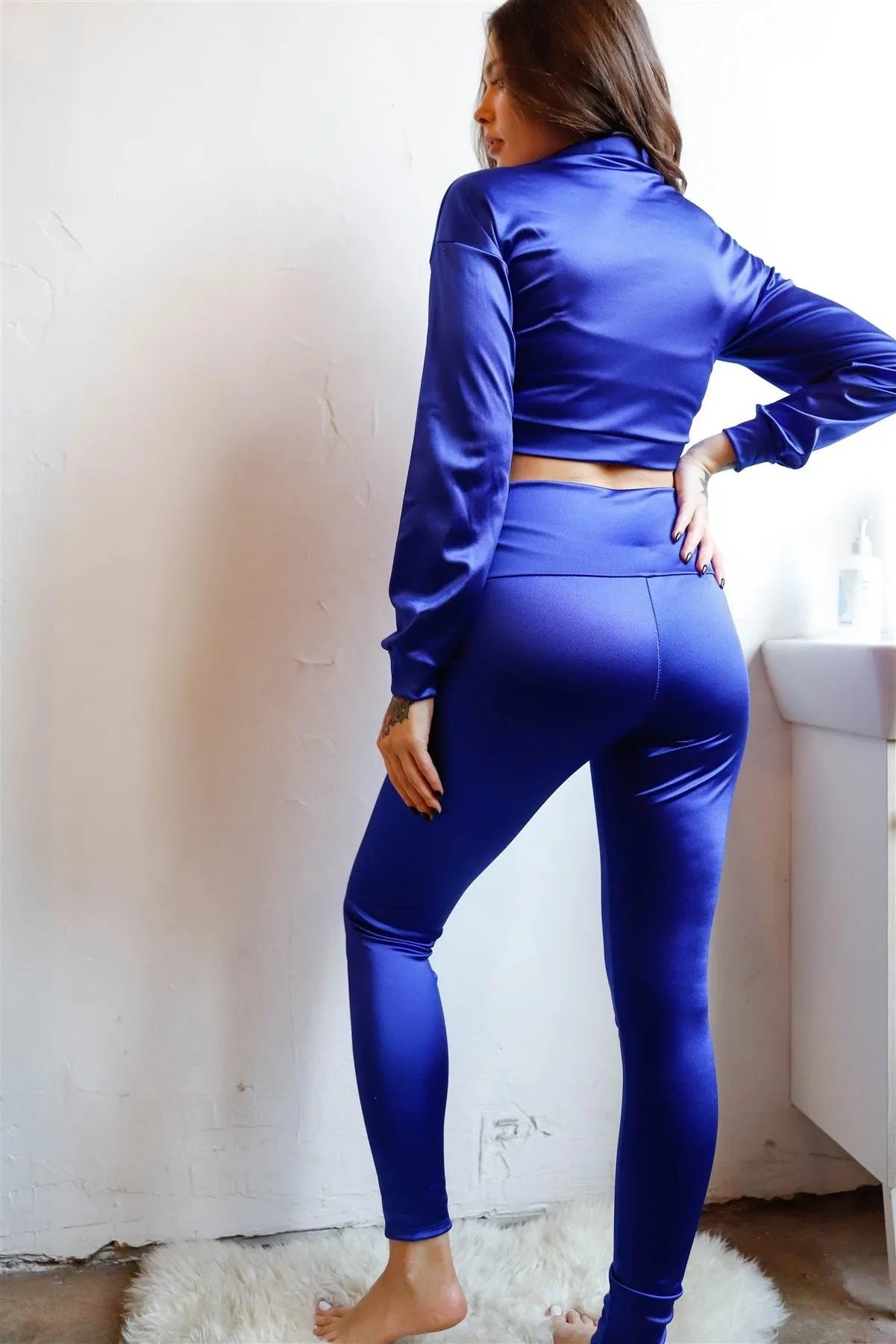 🖤 Item features: Royal blue, solid color, shine material, half zip up front mock neckline, cropped length, cuffed long sleeves, dropped shoulders, cuffed hem, high waist fitted leggings, full length, stretchy, slim fit, not see through, activewear, casual, trendy, must have, street style.