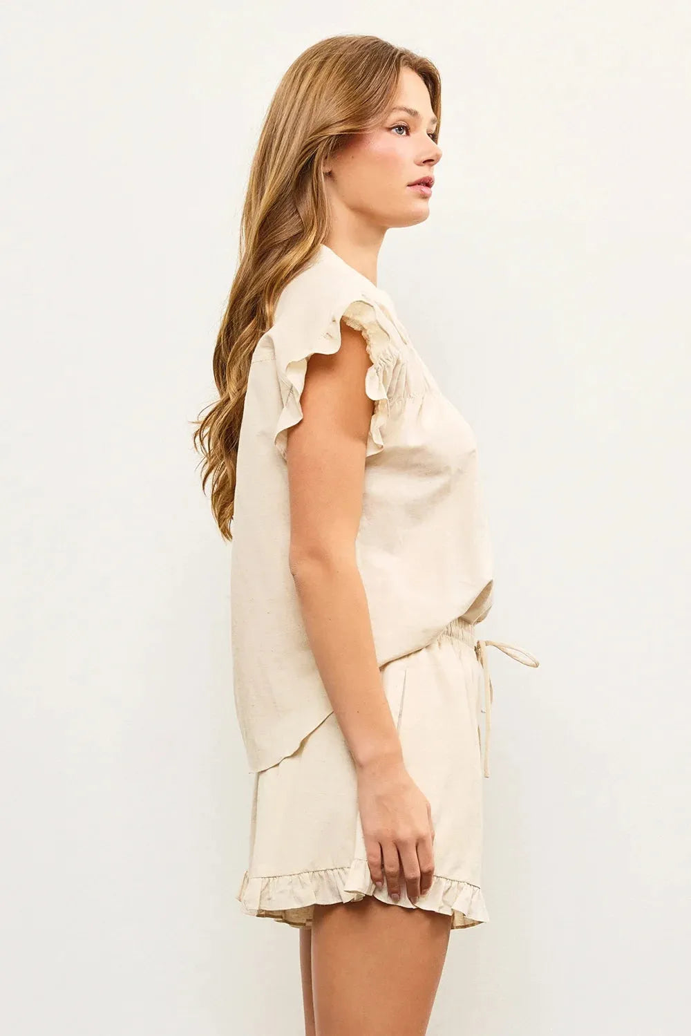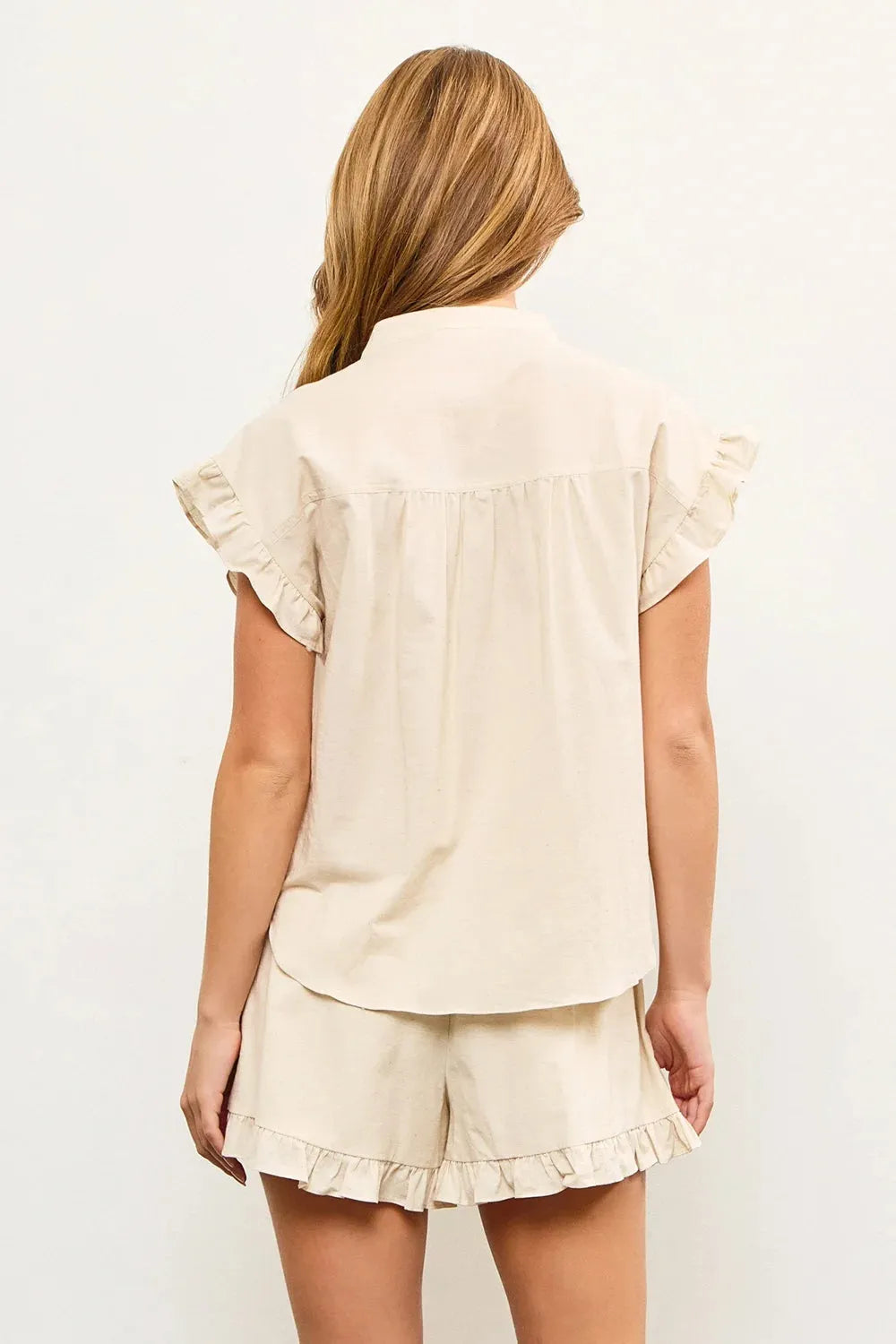 🖤 Features: Mandarin collar, button-front closure, flutter ruffle sleeves, smocked chest panel, lightweight breathable fabric, relaxed silhouette, available in white and cream