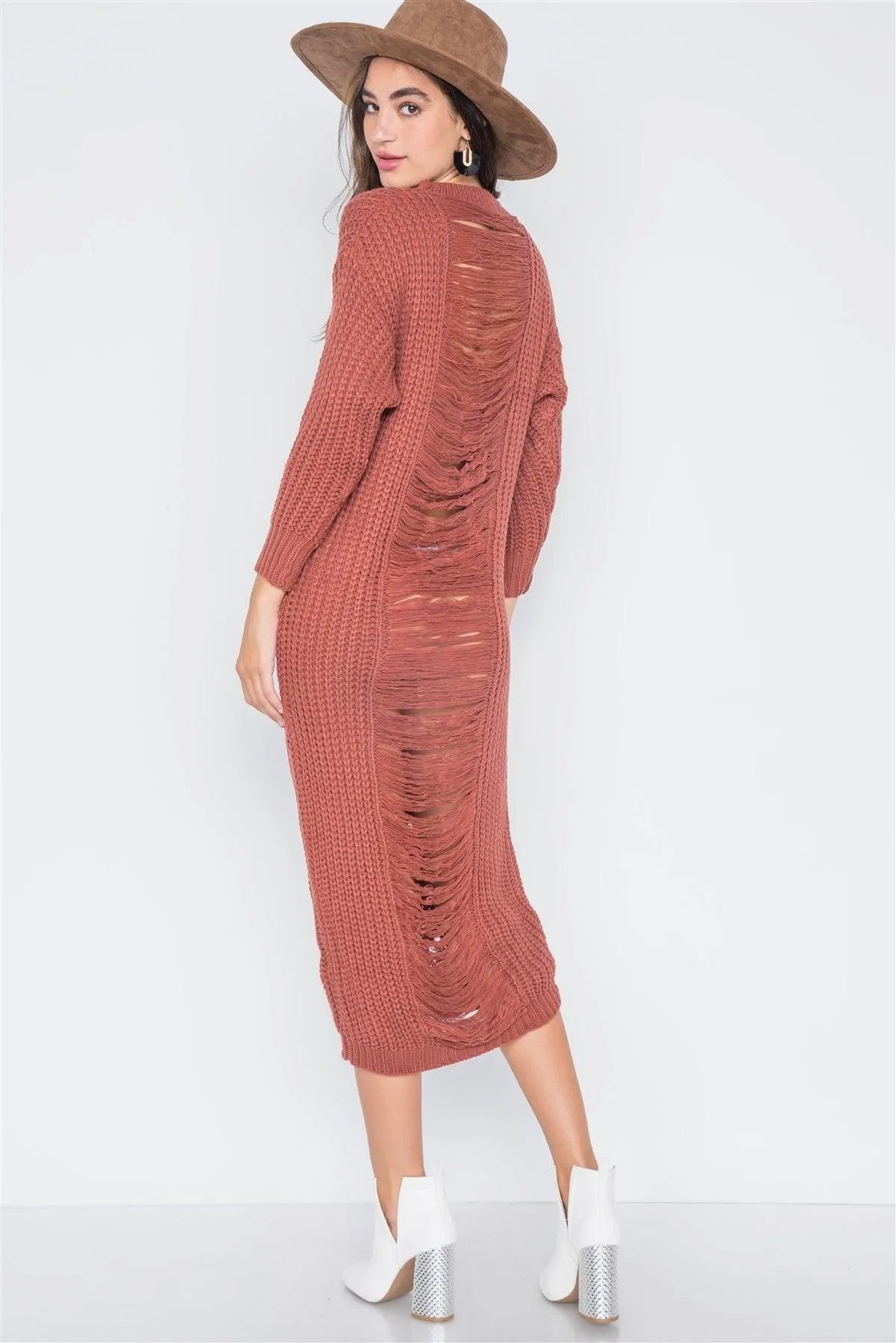 Sweater Dress features: long sleeves, round neck, distressed detailing at back, chunky knit, dropped shoulders, midi length, slightly sheerModel is 5'9 wearing a size Small (Waist: 24", Bust: 32A, Hips: 34")Size Small Item Measurements: Length: 52", Bust: 36", Sleeves: 38"True to size