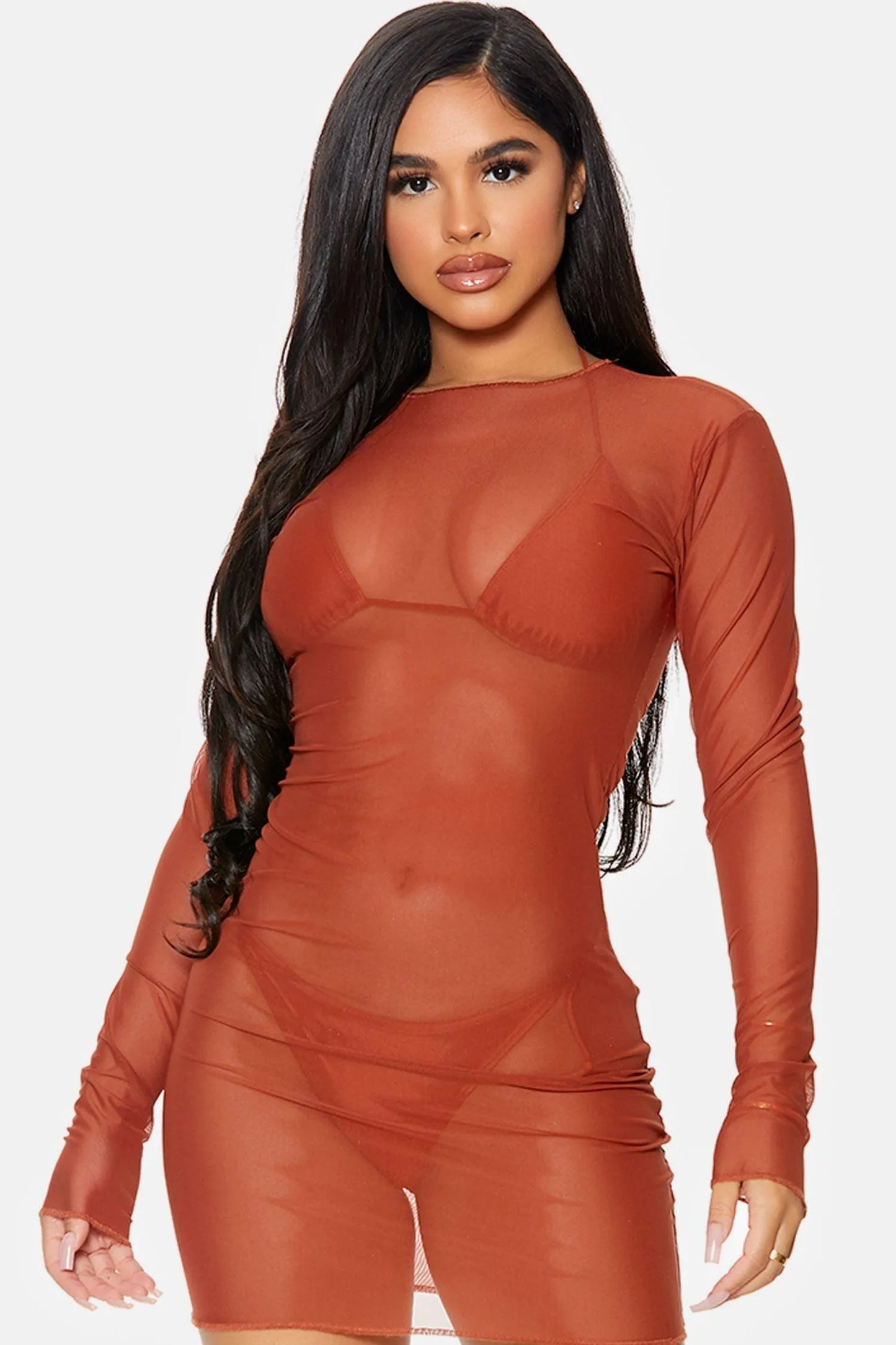 Rust Cover Me Long Sleeve Mesh Sheer Pool Swimwear Coverup Mini Dress
