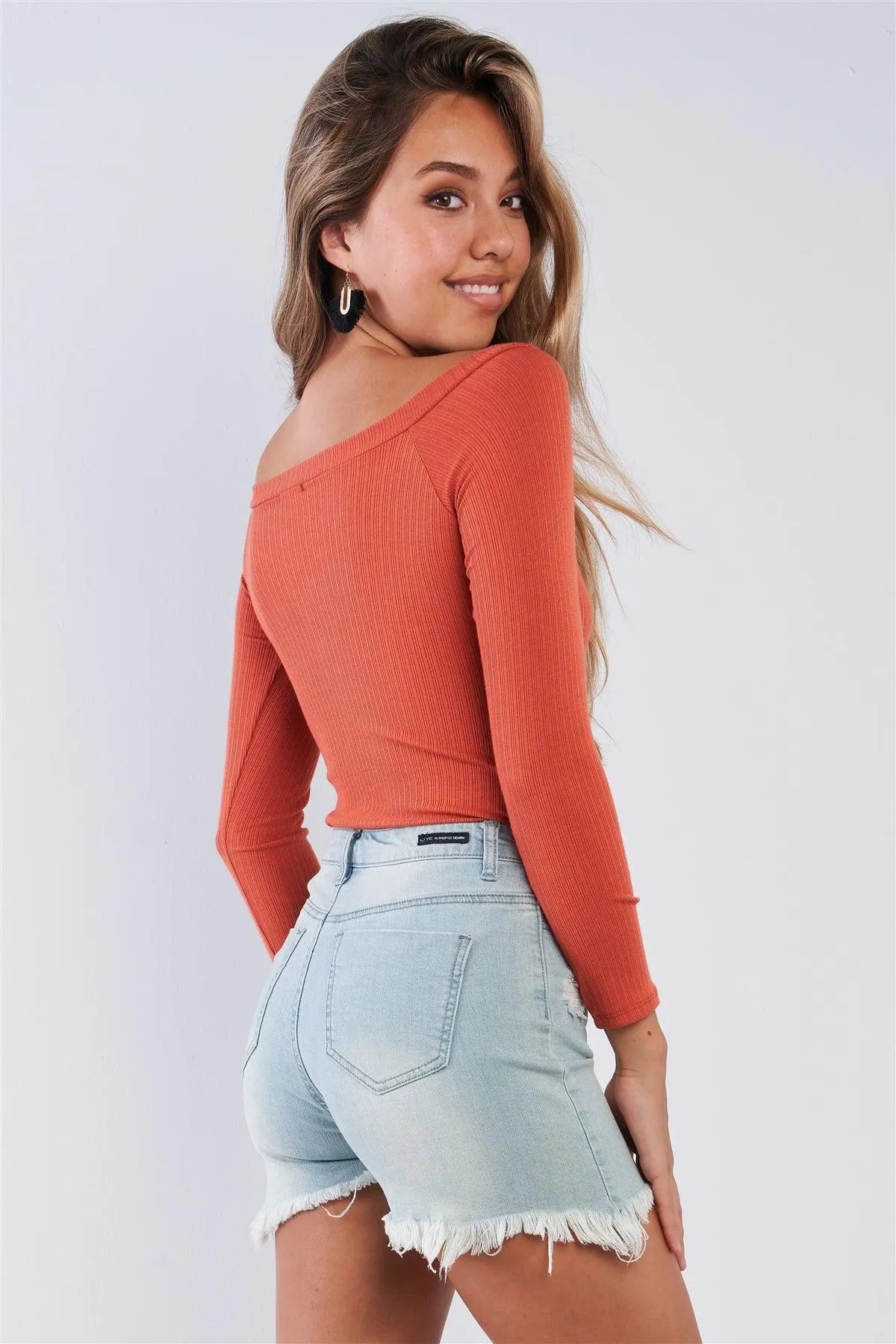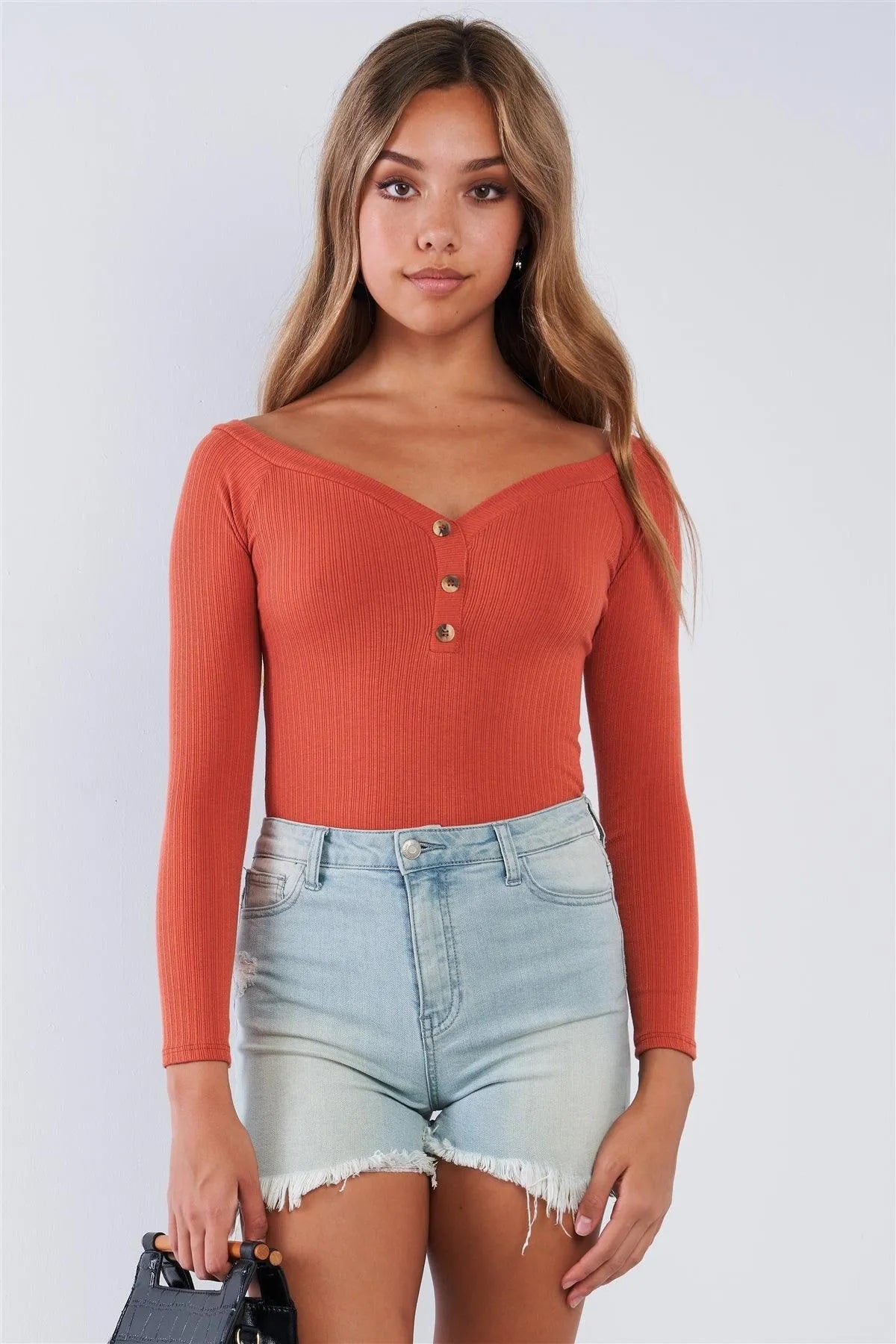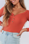 Rust Orange Ribbed Long Sleeve Bodysuit V-neck With Button Detail /3-2-1