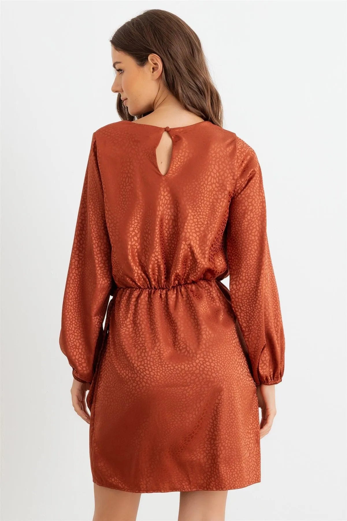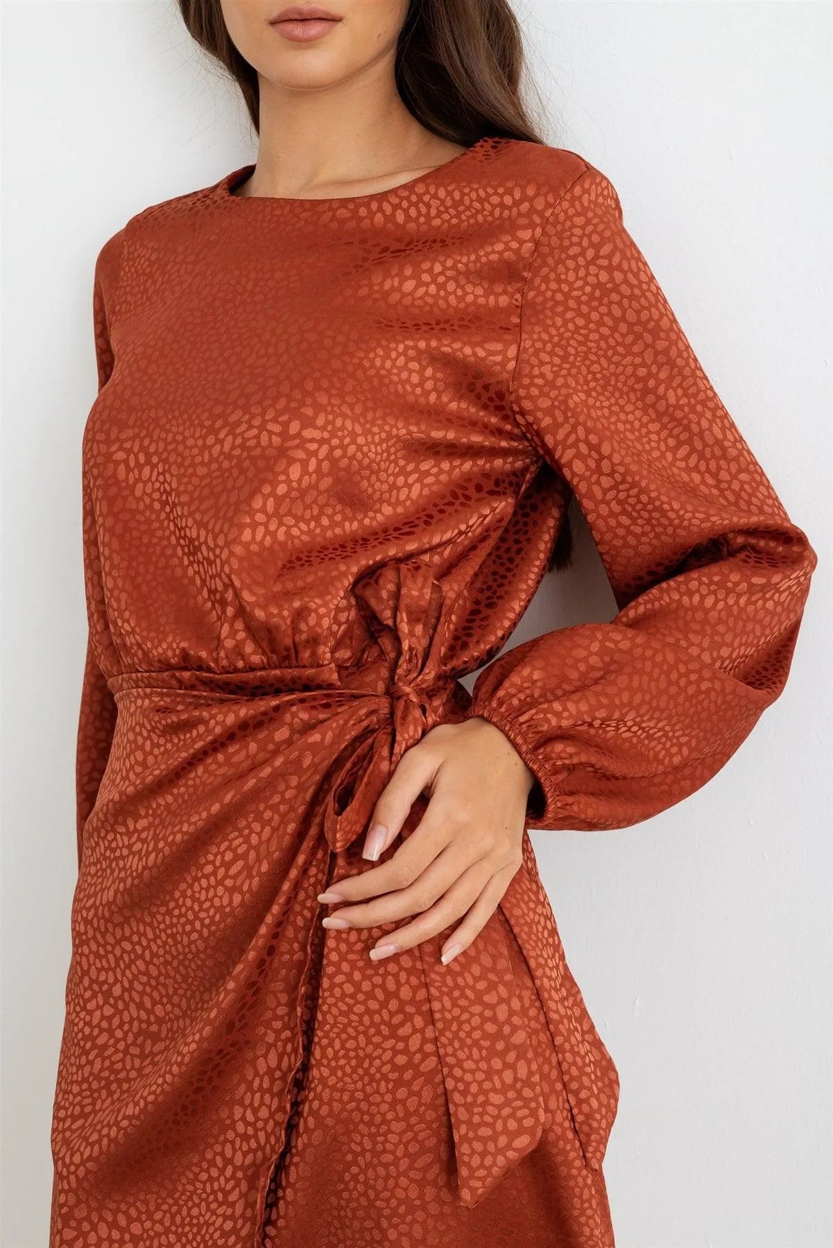 Rust Printed Satin Wrap Hem Long Sleeve Mini Dress /3-2-2