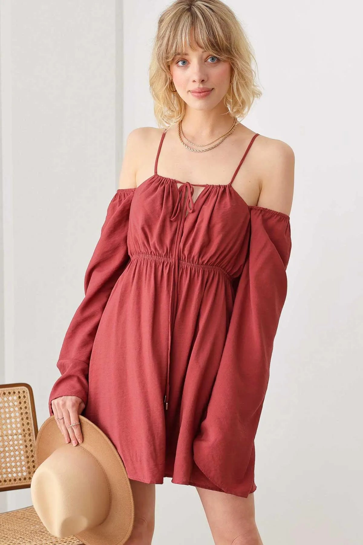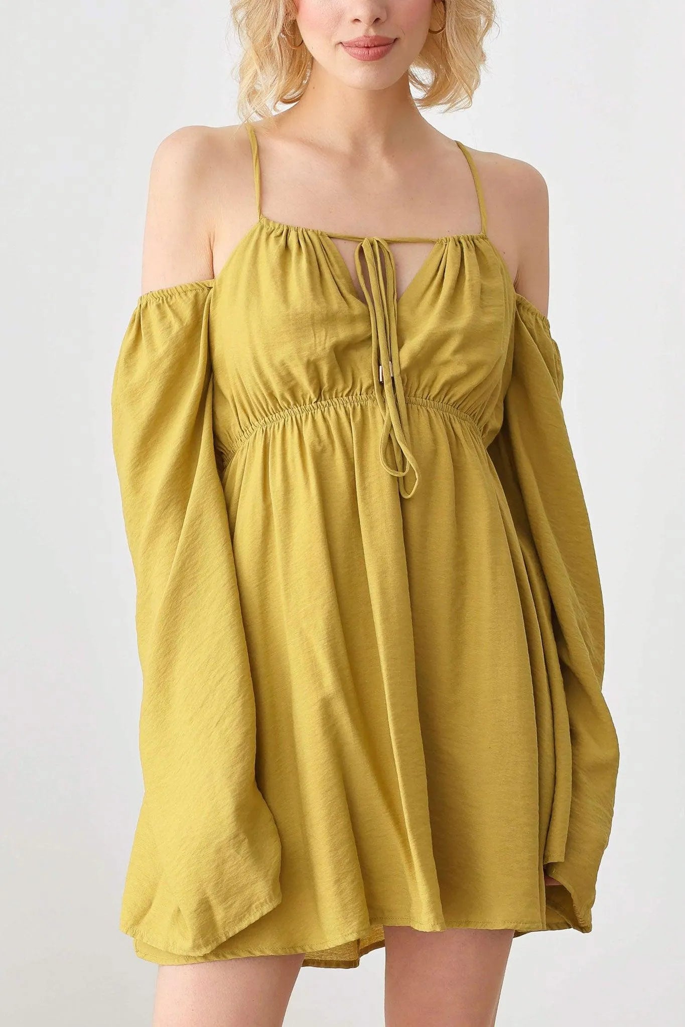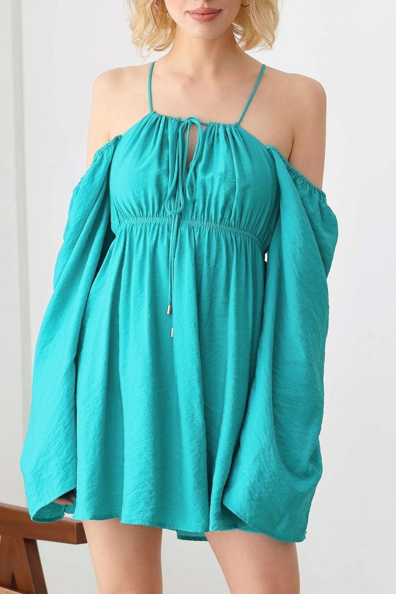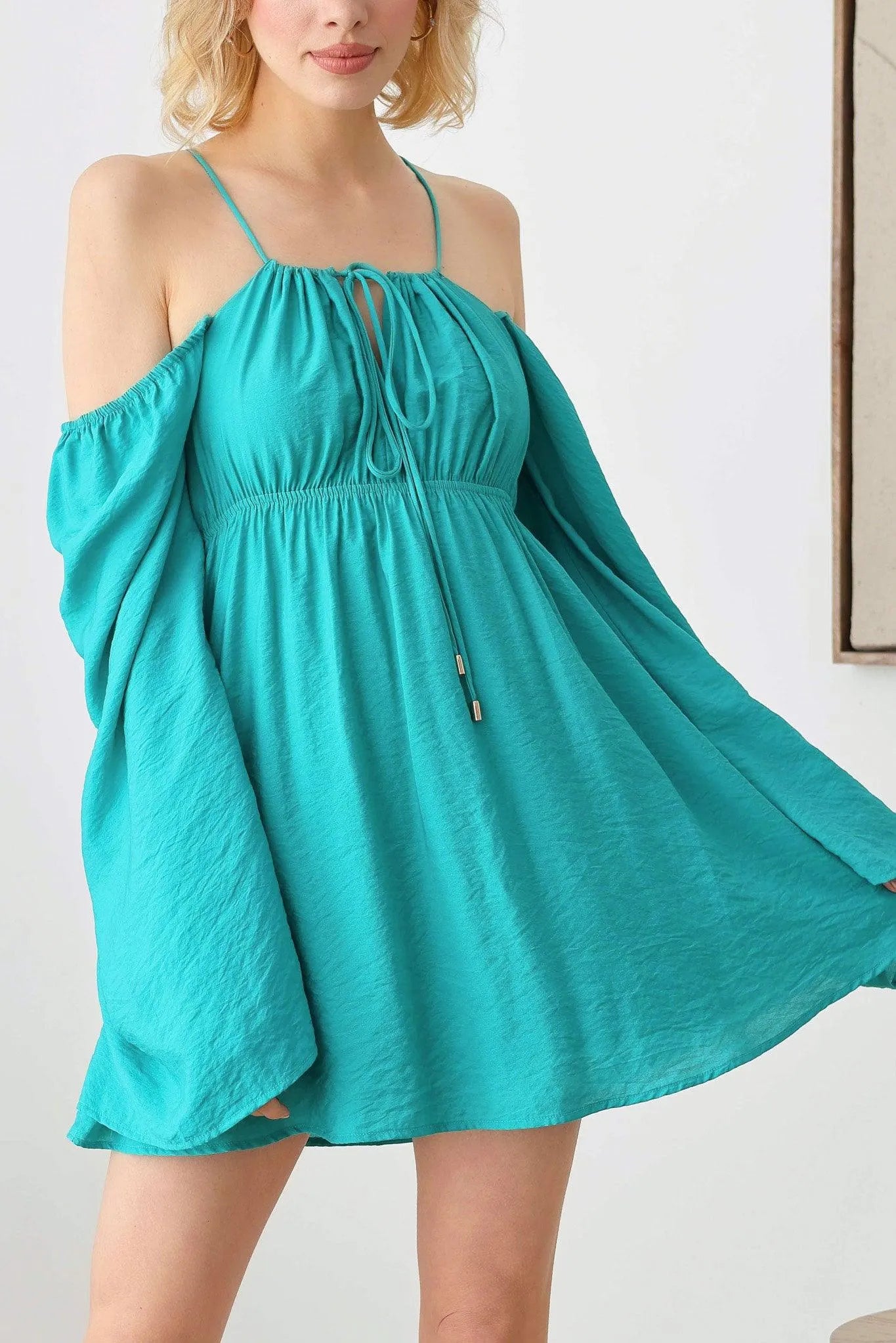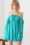 🖤 Item Features: boho, solid color, lightweight woven fabric, A-line silhouette, smocked bust, drawstring halter neck, adjustable spaghetti straps, front tie, puff long sleeves, mini length summer, beach dress, music festival, romantic chic.