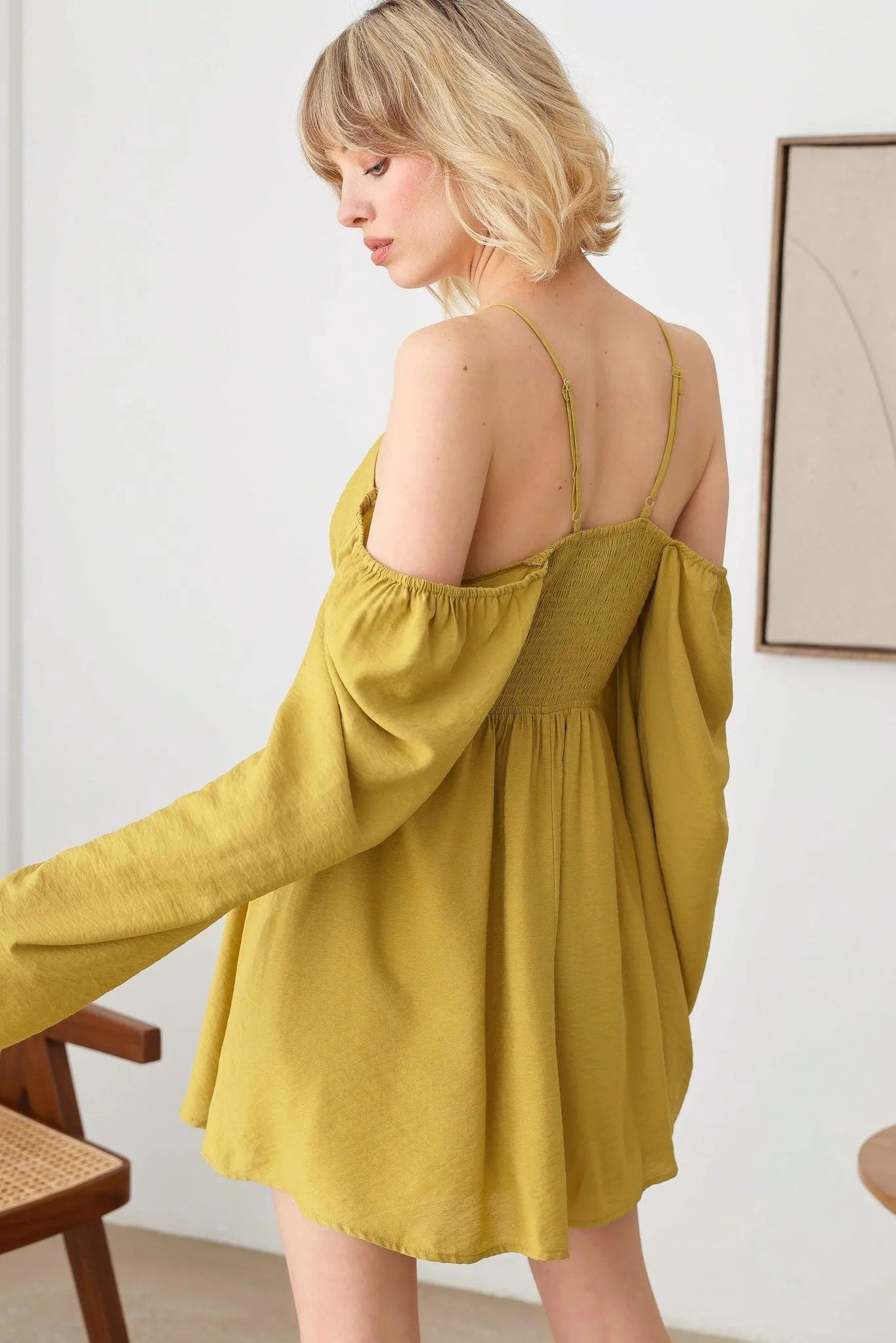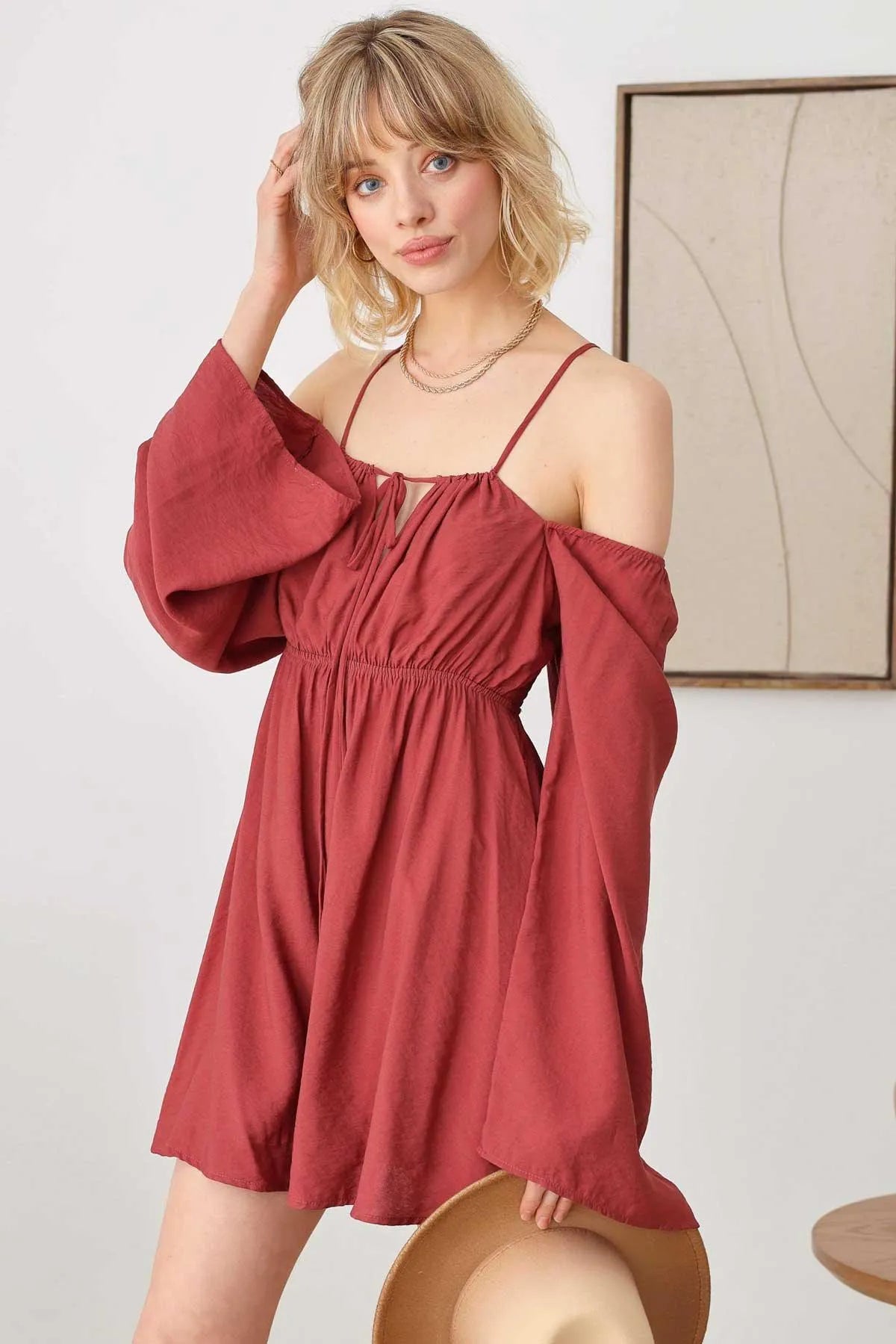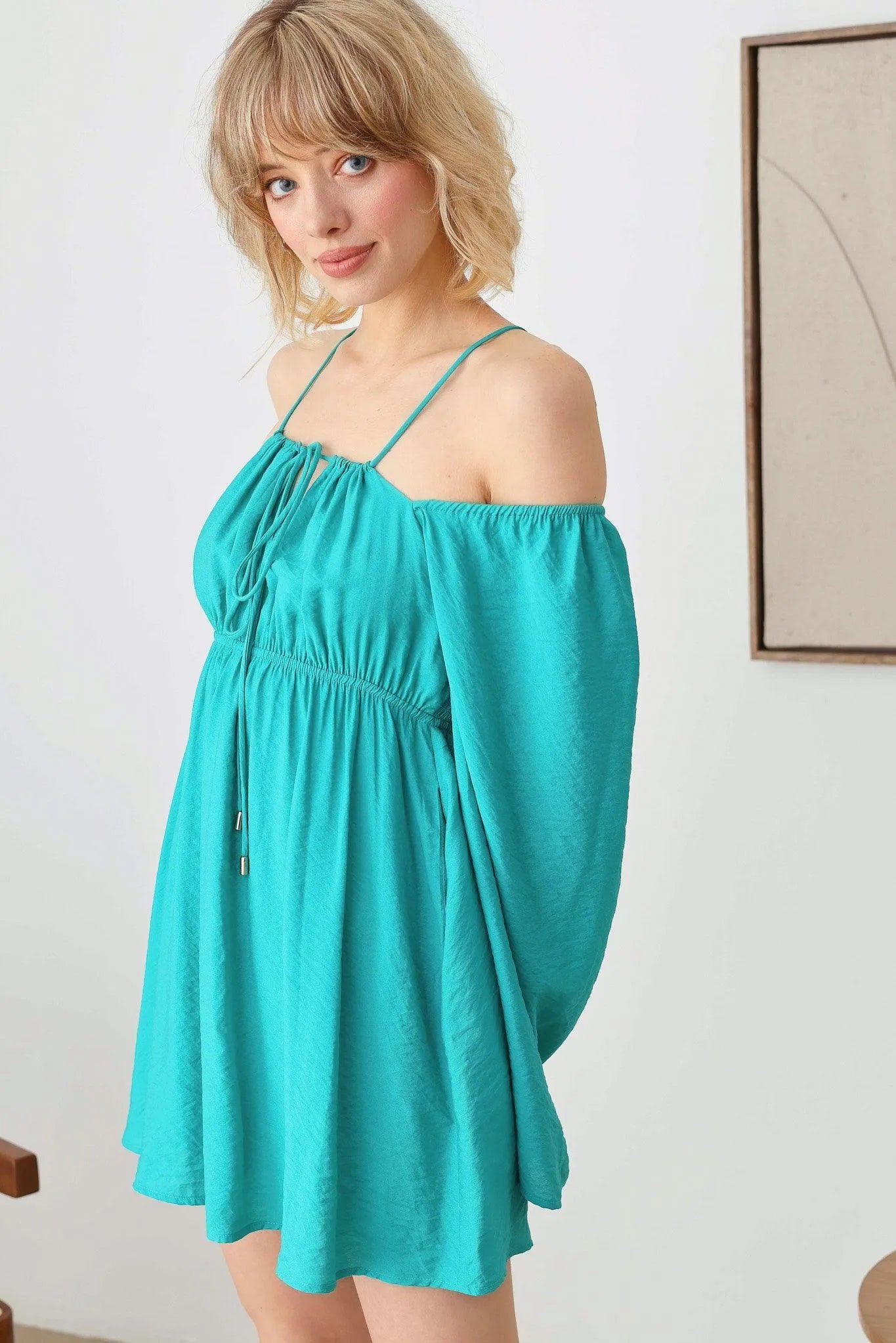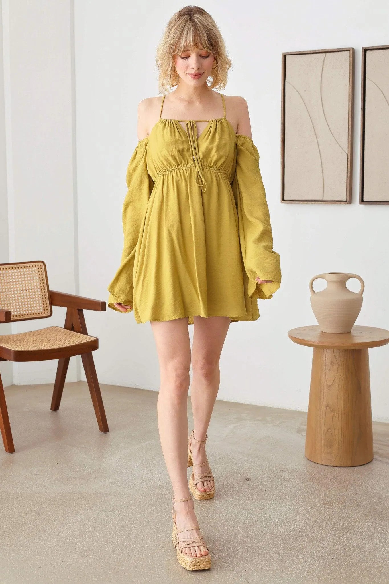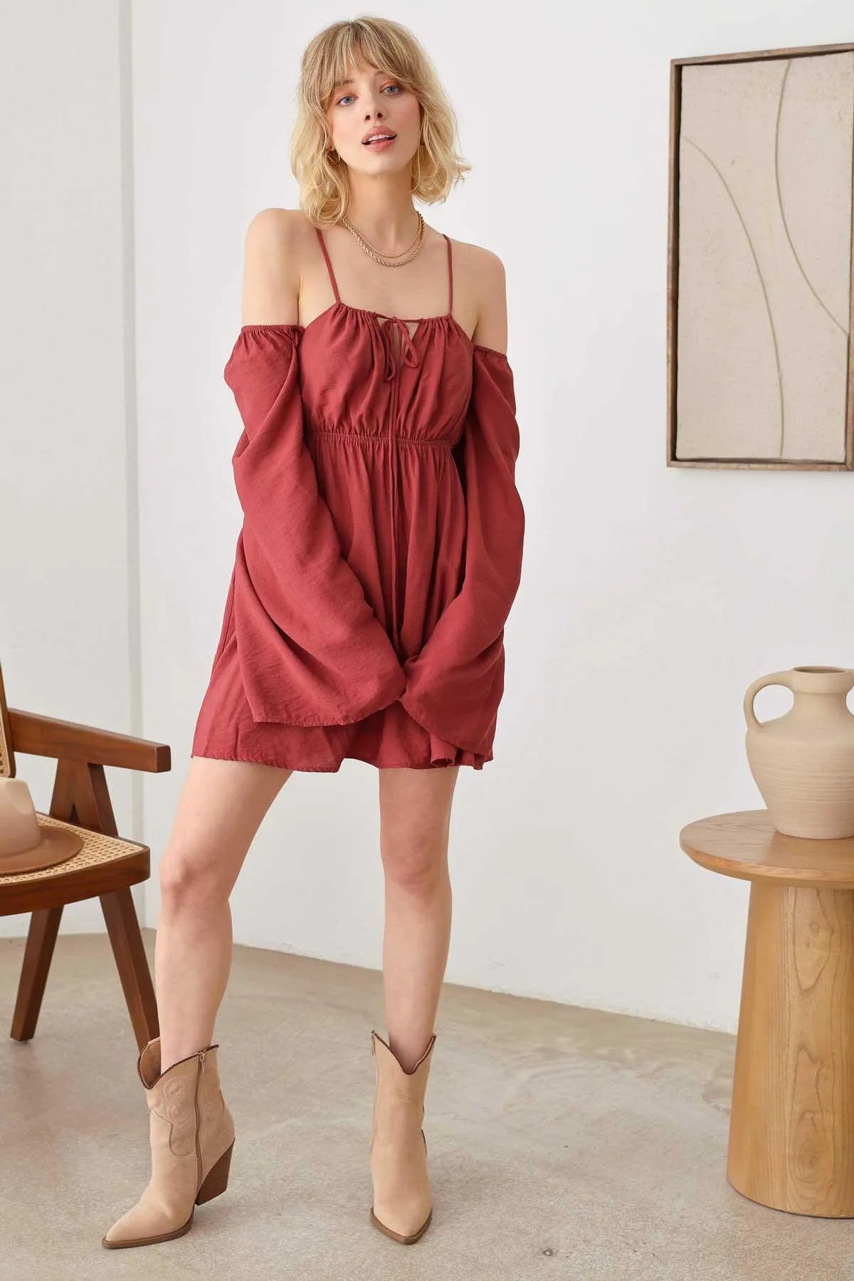 🖤 Item Features: boho, solid color, lightweight woven fabric, A-line silhouette, smocked bust, drawstring halter neck, adjustable spaghetti straps, front tie, puff long sleeves, mini length summer, beach dress, music festival, romantic chic.