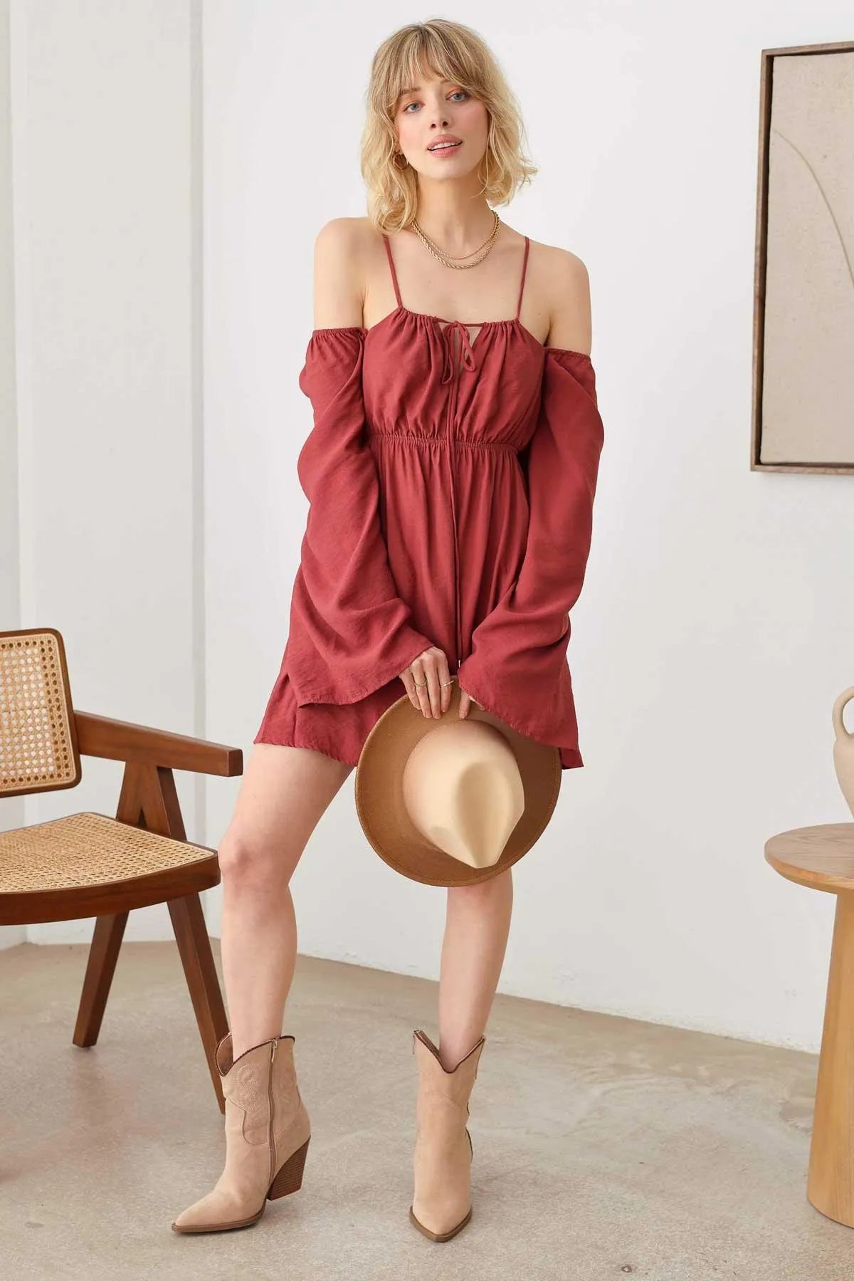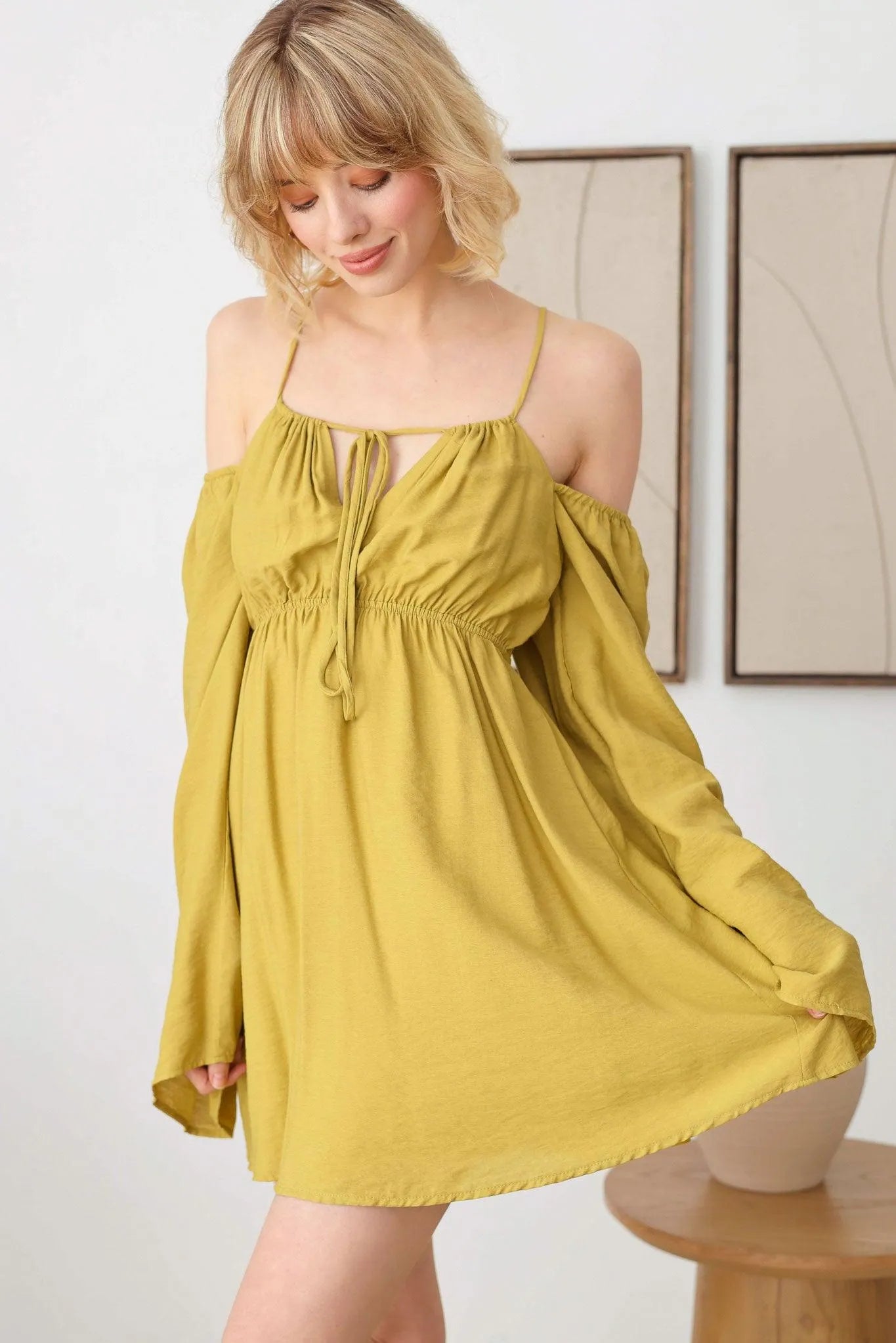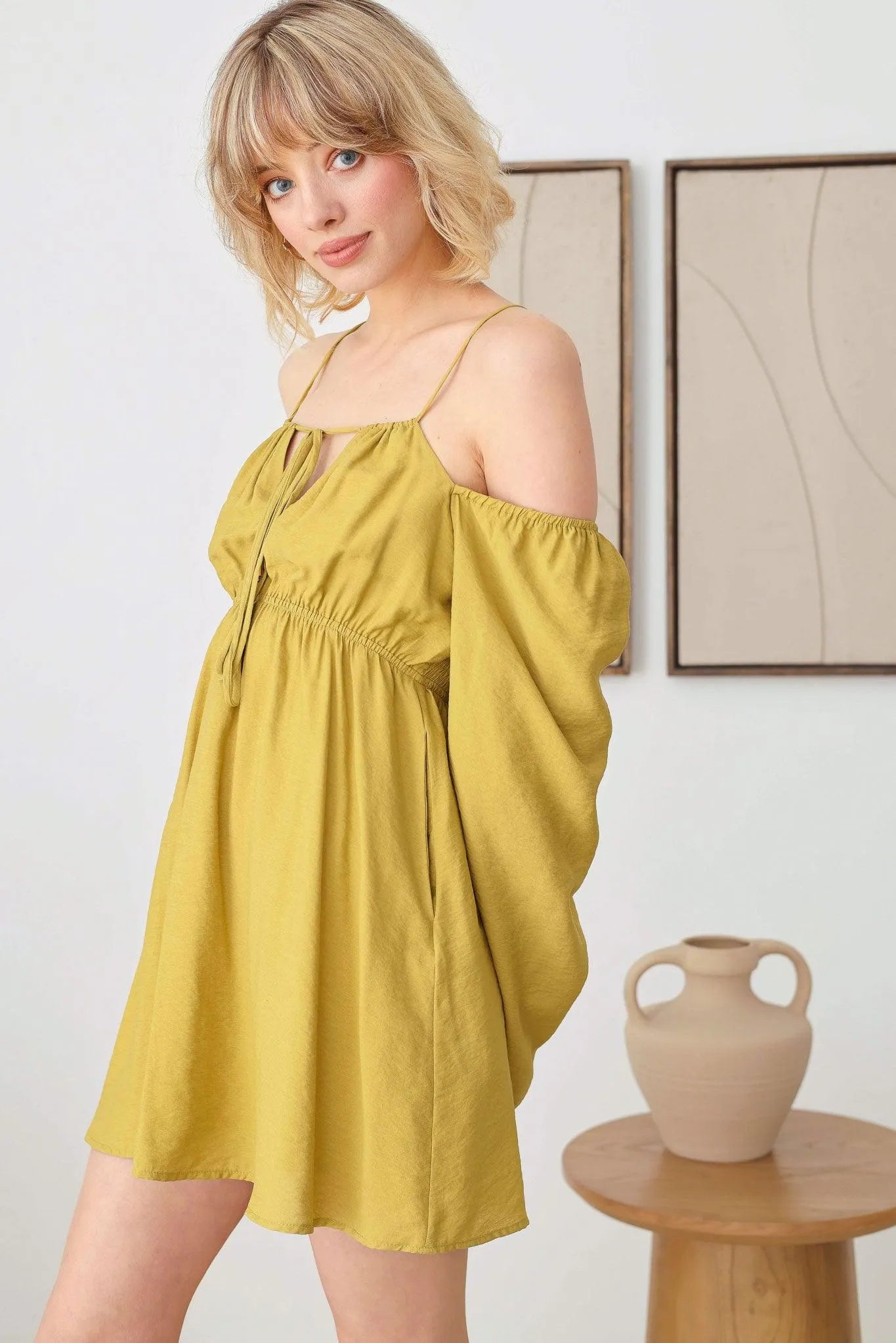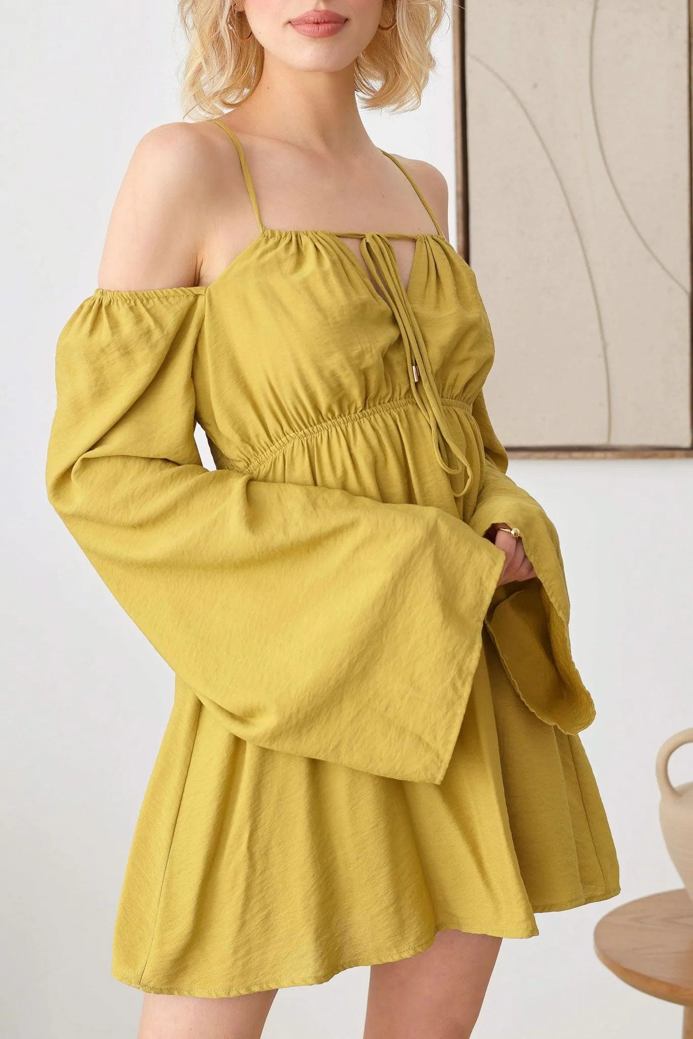 🖤 Item Features: boho, solid color, lightweight woven fabric, A-line silhouette, smocked bust, drawstring halter neck, adjustable spaghetti straps, front tie, puff long sleeves, mini length summer, beach dress, music festival, romantic chic.