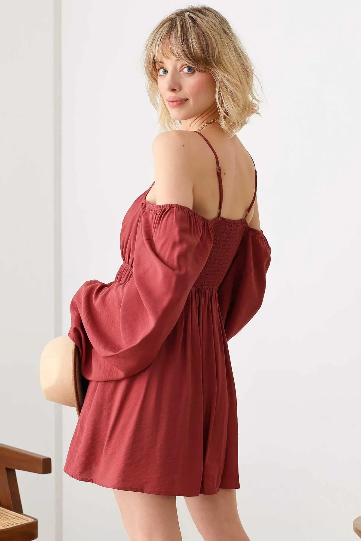 Rust Brown Ribbed Knit Balloon Sleeves Button-Front V-Neck Mini DressVendor:GILLI