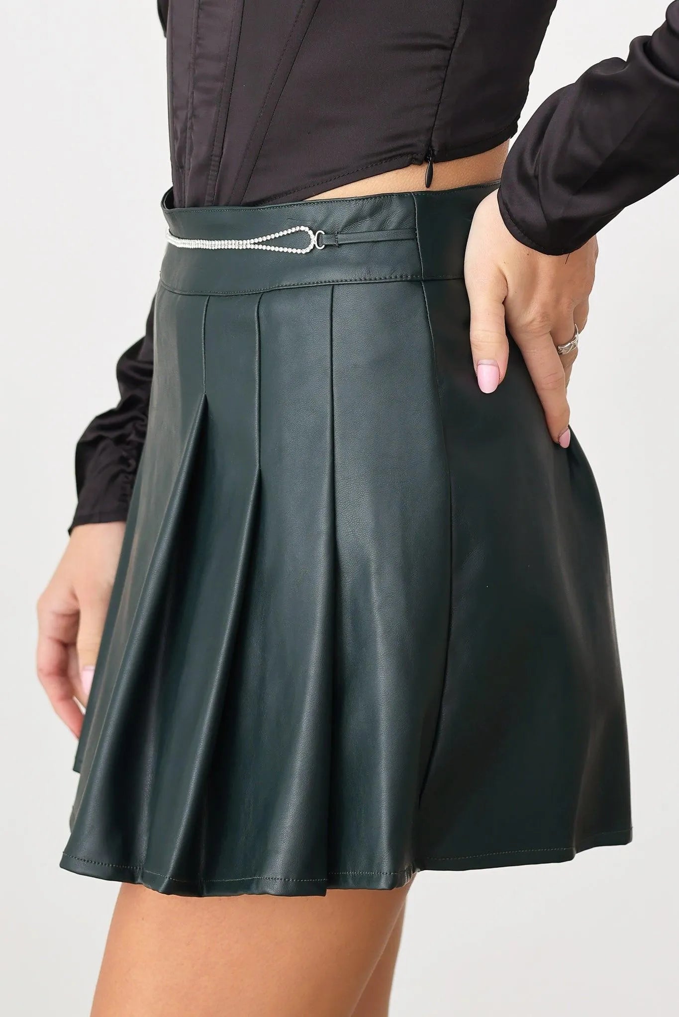 Faux Leather Front Chain Embellished Belt Pleated Skort