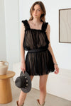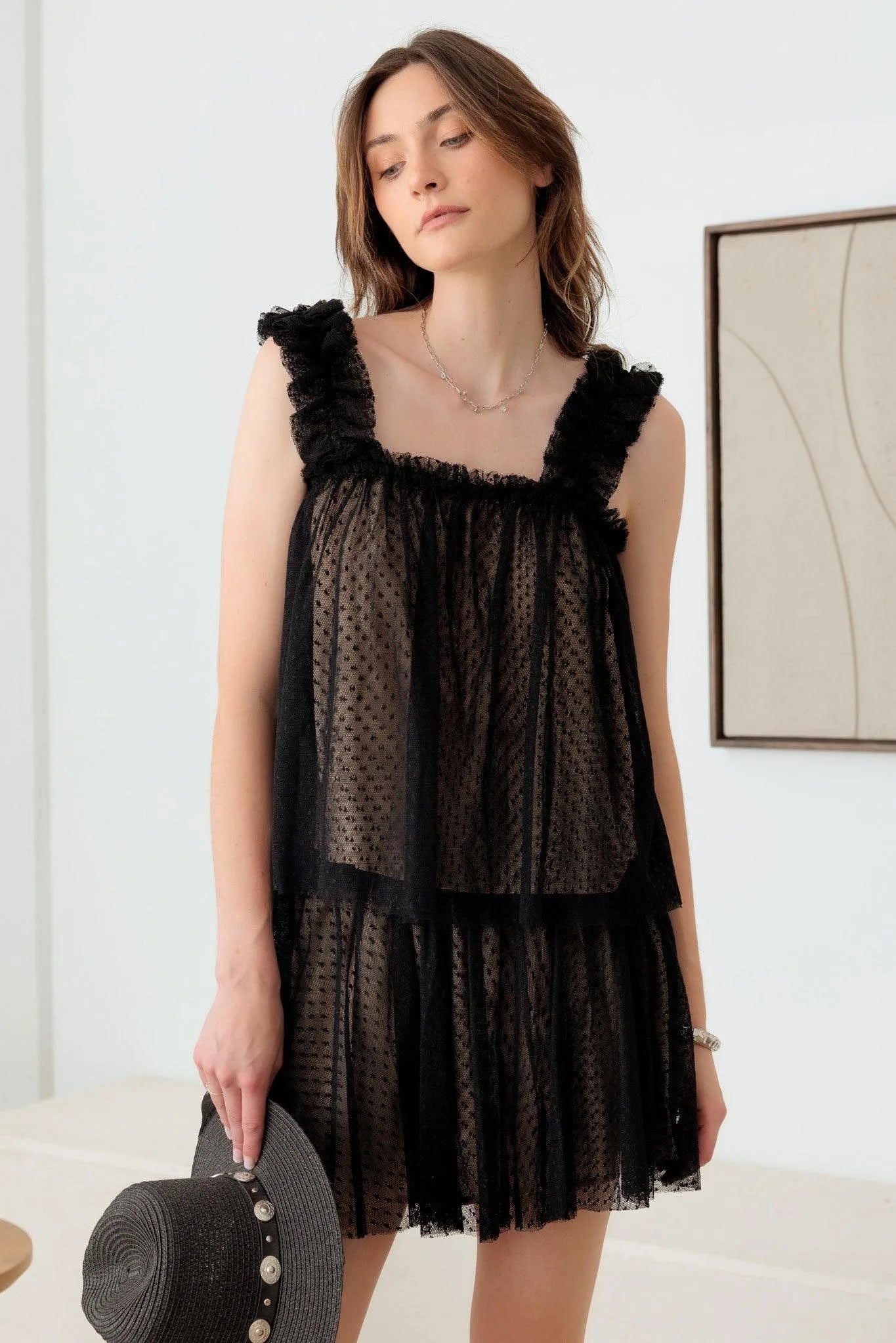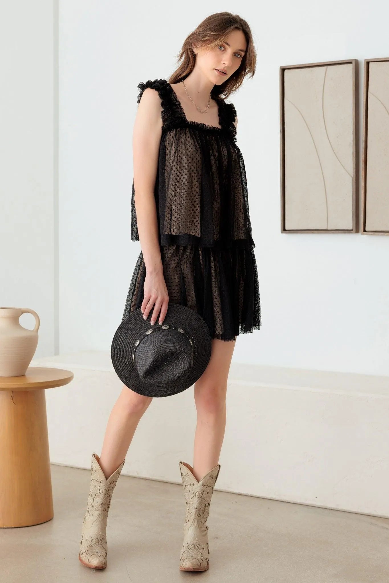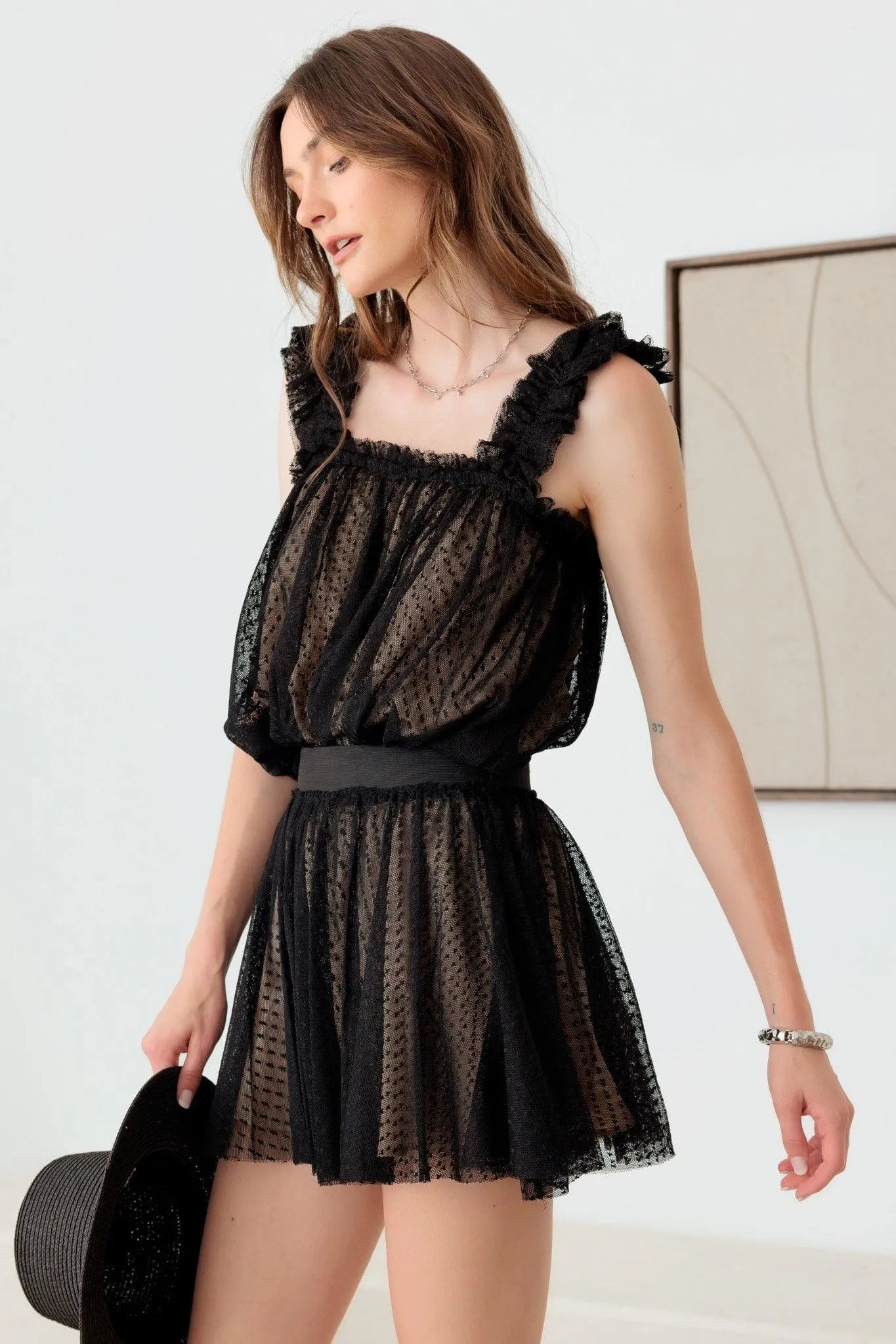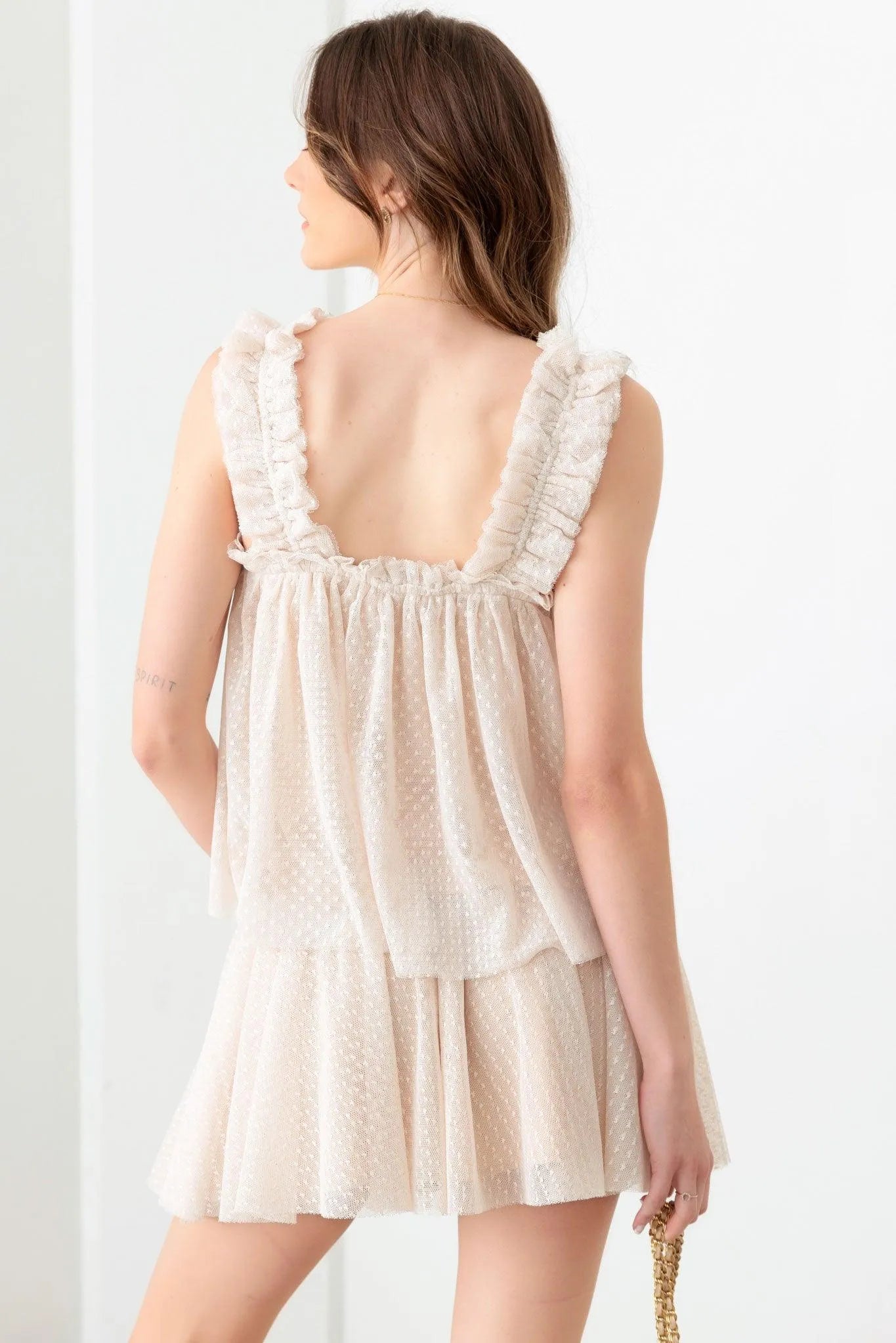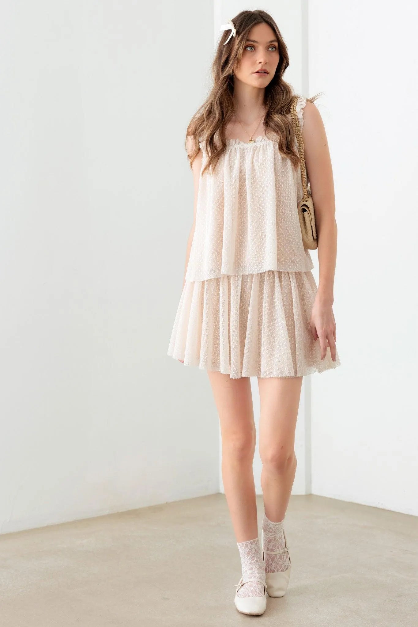 Romantic Swiss Dot Ruffled Square Neck Two-Piece Mini Skirt SetVendor:Mustard Seed