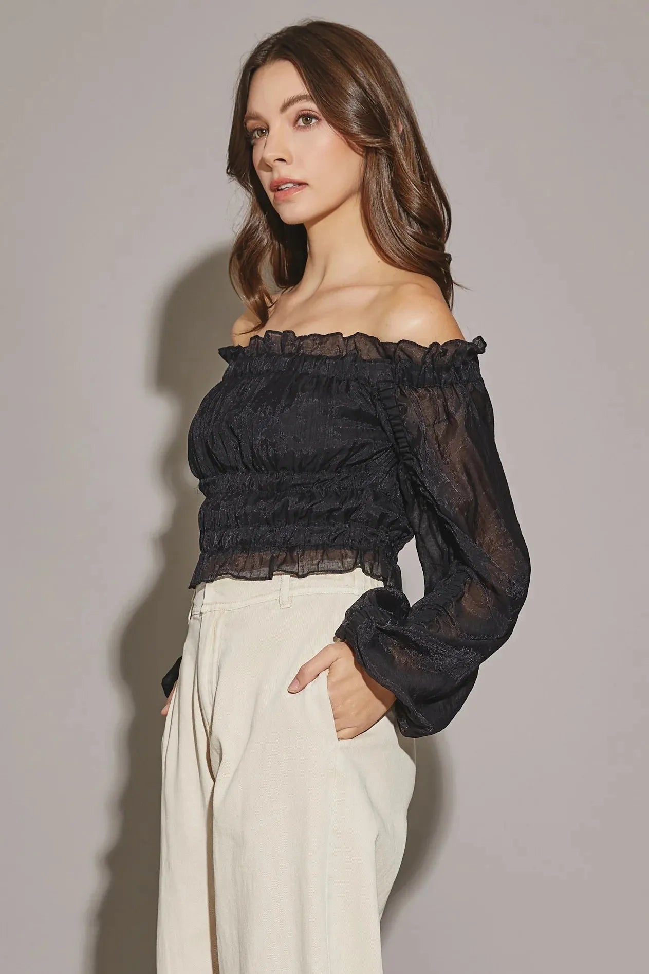 Elevate your everyday style with our Off The Shoulder Shirring Crop Blouse. This elegant piece features a flattering off the shoulder neckline and shirring detailing, creating a sophisticated and exclusive look. Made with high-quality materials, this blouse is perfect for any occasion and will quickly become a staple in your wardrobe. Indulge in luxury fashion with this must-have blouse.