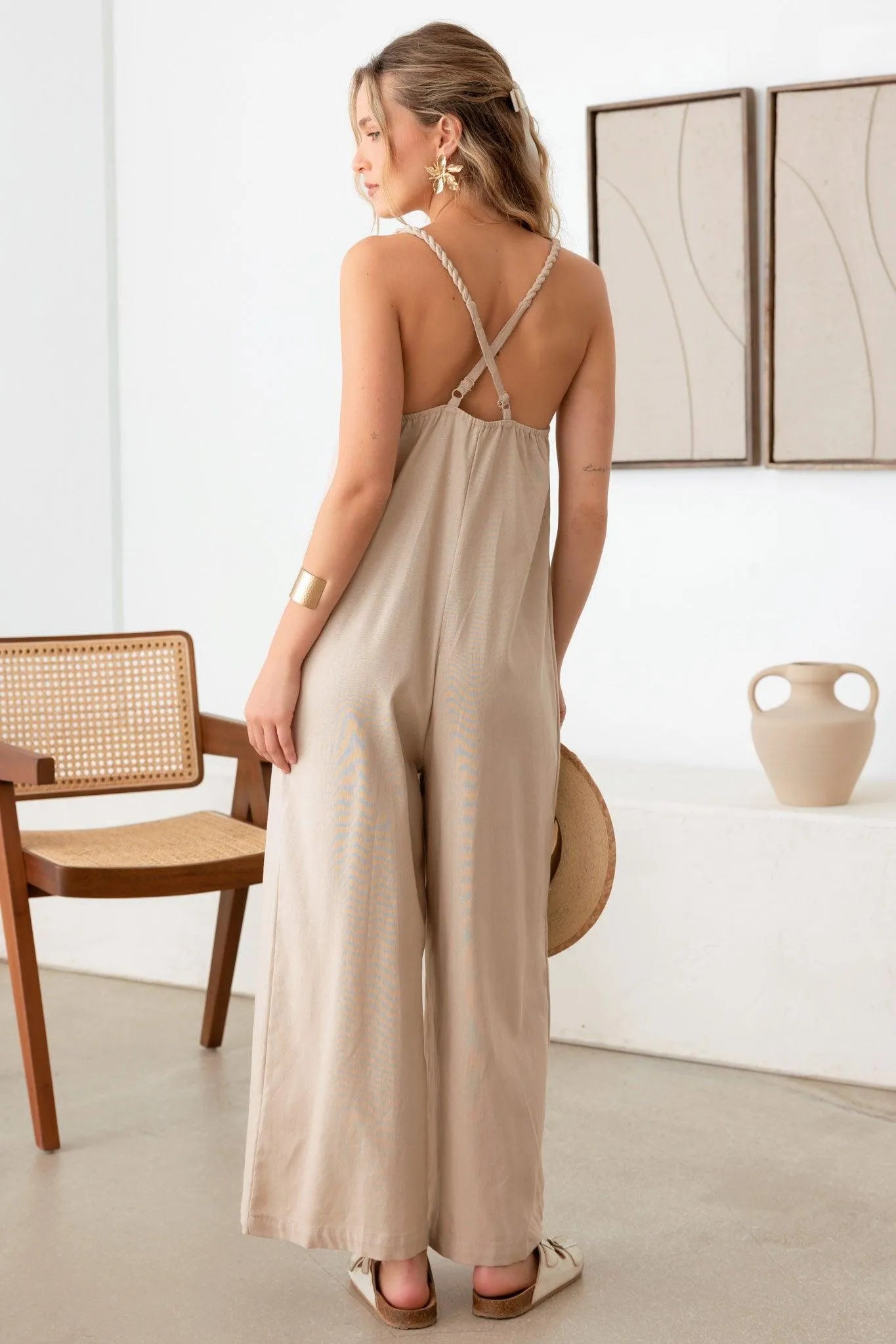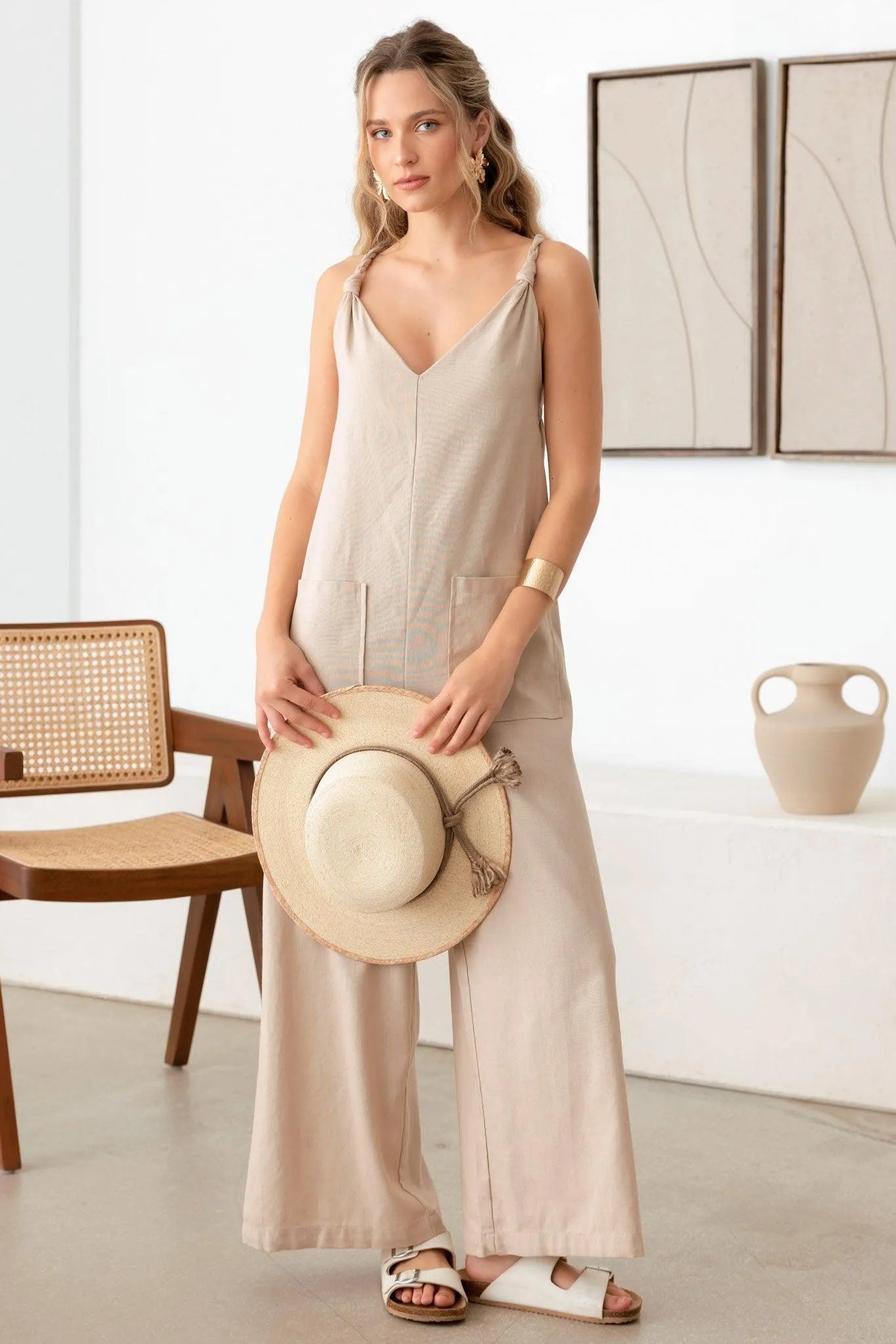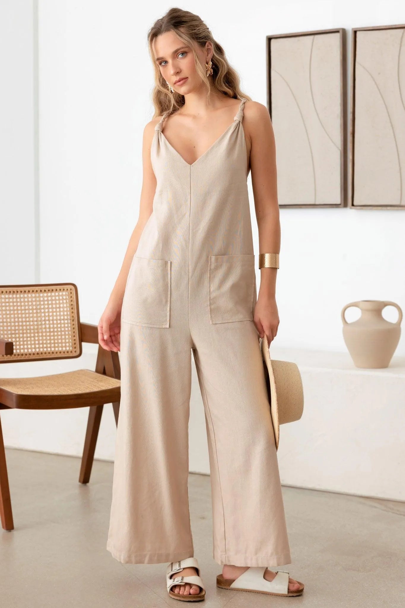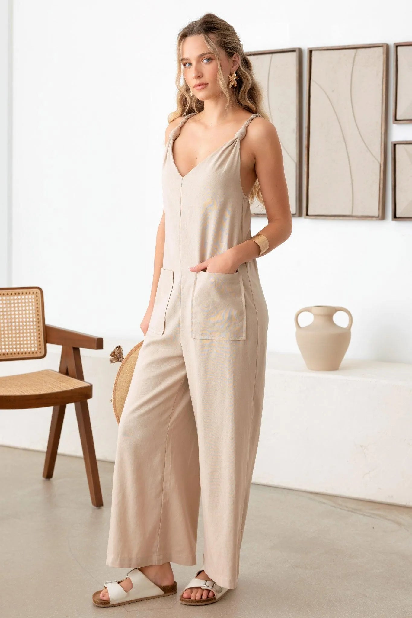 women jumpsuit, solid color, sleeveless, linen, rope strap, v-neck, cozy, front big pocket, wide leg, adjustable cross strap, It's cute, trendy, and has fashionable vibe!