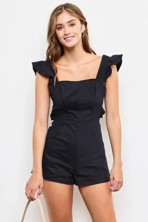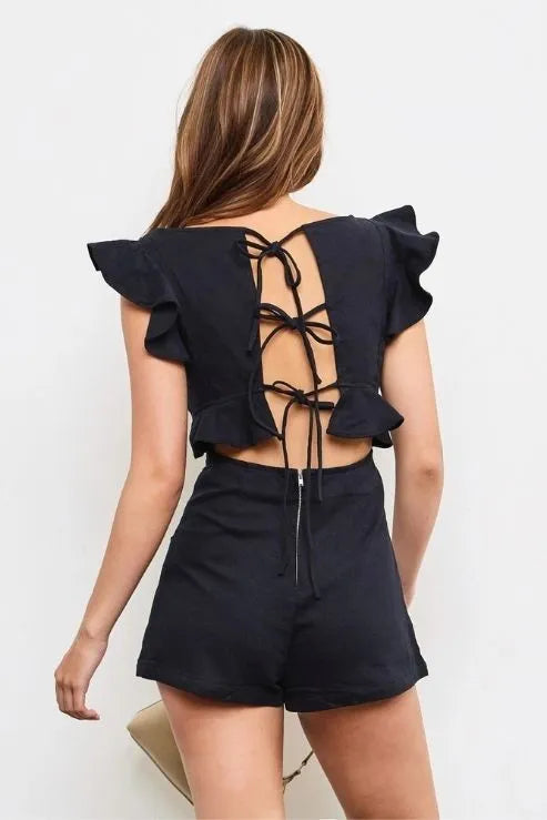 Ruffle Flutter Sleeve Tie-Back Black Romper