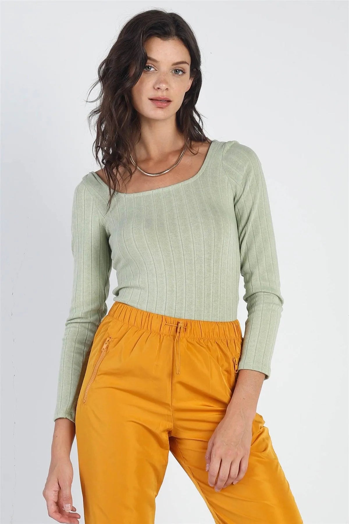 Sage Ribbed Square Neck Long Sleeve Bodysuit /3-2-1
