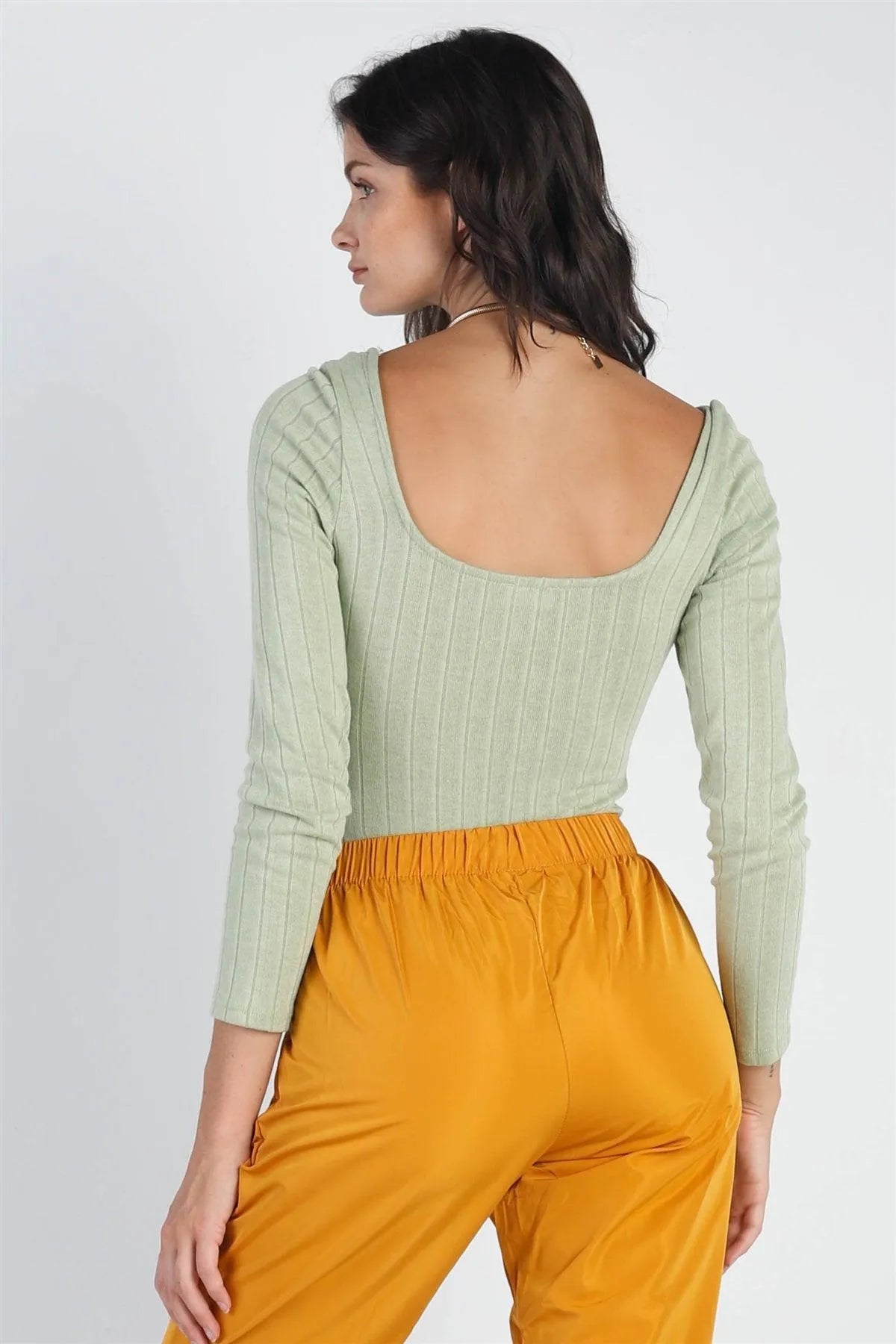 🖤 Item features: Sage, solid color, ribbed, square neck, long sleeves, thong double snap closure, non-sheer, semi-stretchy, unlined, casual, cute, girlish, trendy