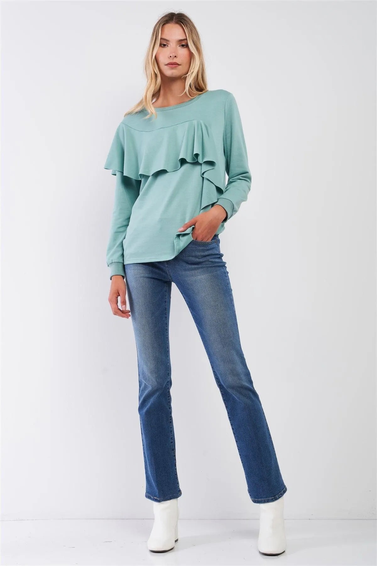 Sage Ruffled Crew Neck Long Sleeve Sweatshirt /2-2