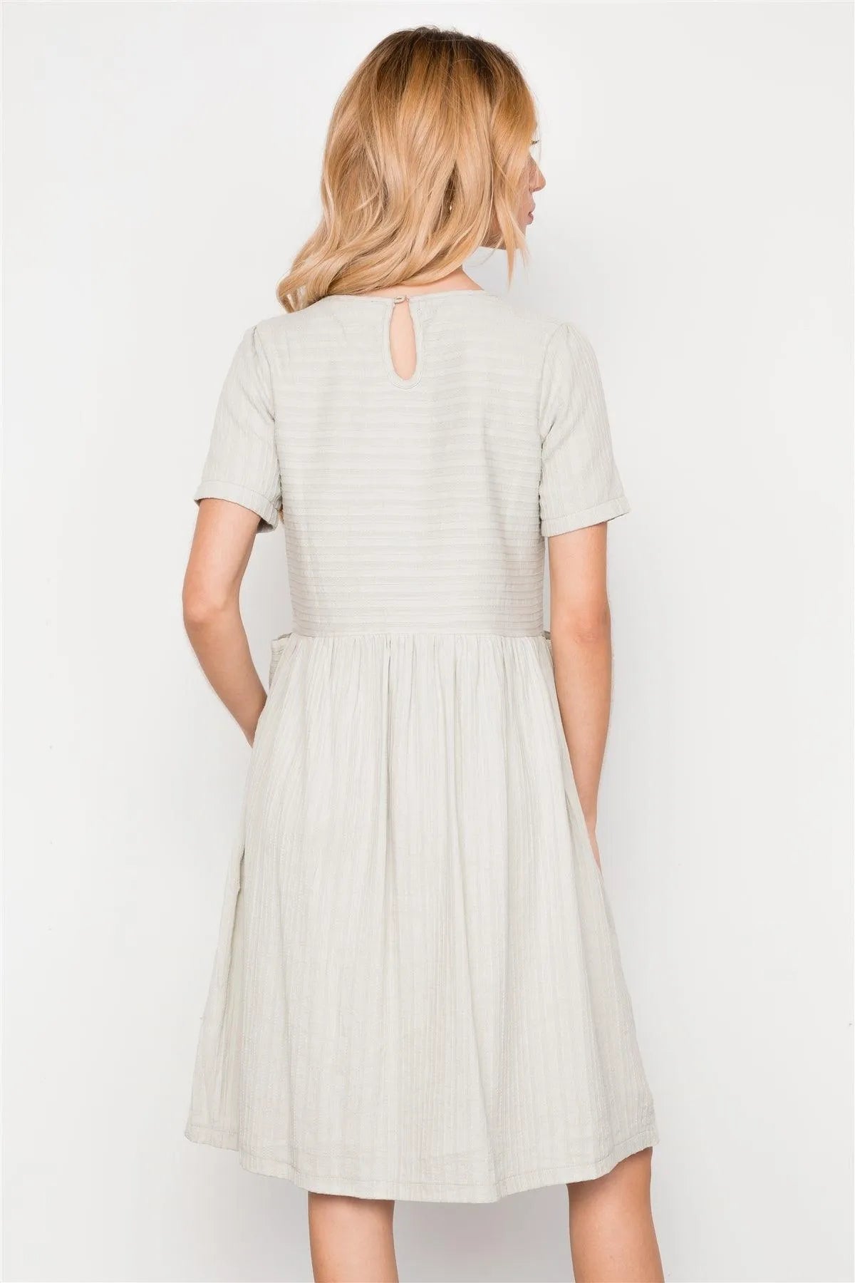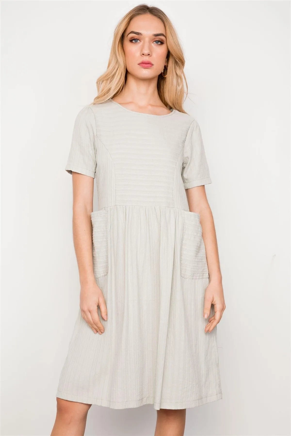 Dress features: short sleeve, midi length, lined, round neckline, back button closure, two front pocketsModel is 5'8 and wearing Small (Waist: 24", Bust: 32A, Hips: 34")Item Measurements: Length: 39", Bust: 36", Sleeve Length: 8"True to sizeAvailable in Mauve