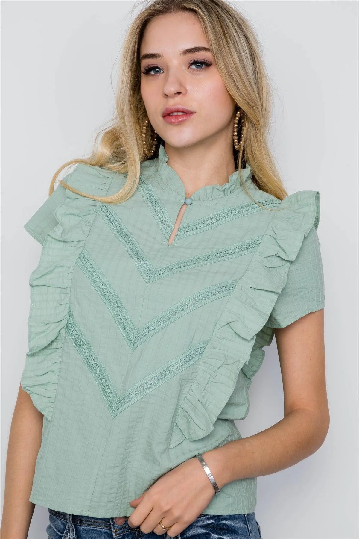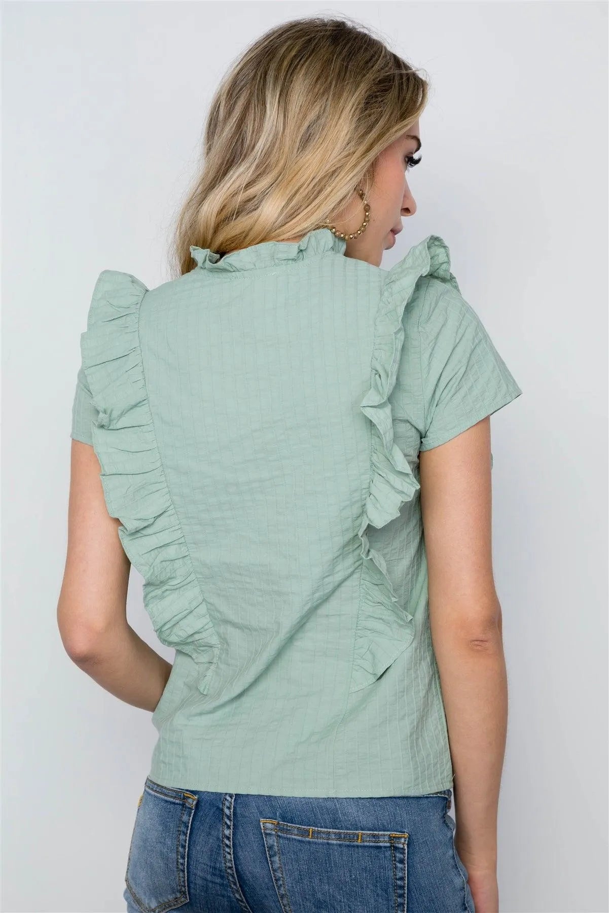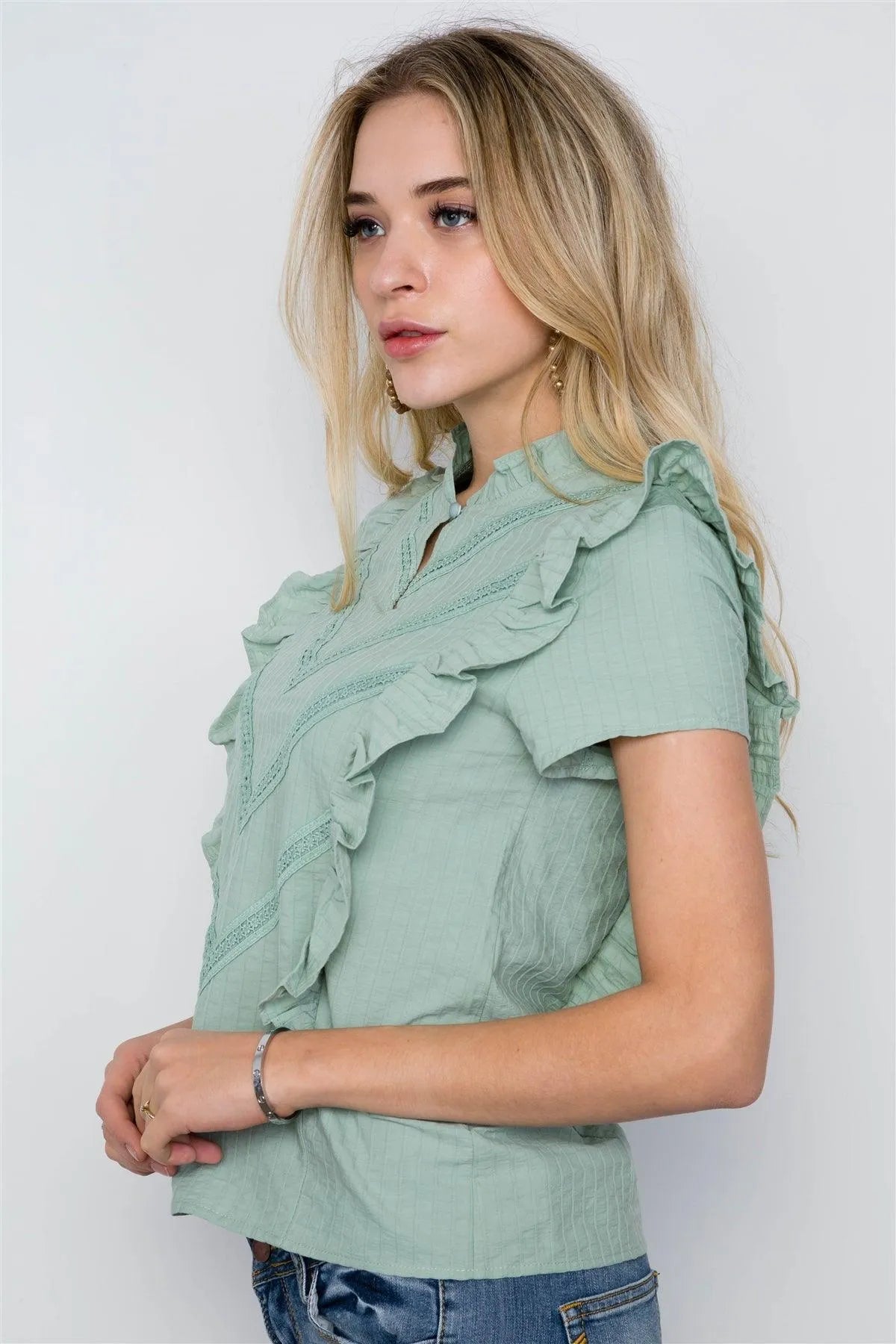 Sage Short Sleeve Ruffle Detail Boho Top / 2-2-2