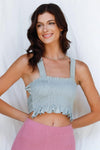 🖤 Item Features: Sage, solid color, smocked bodice, back criss-cross self-tie straps, sleeveless, ruffle hem, square neckline, cropped length, stretchy, non-sheer, unlined, casual, cute, elegant, girlish, trendy