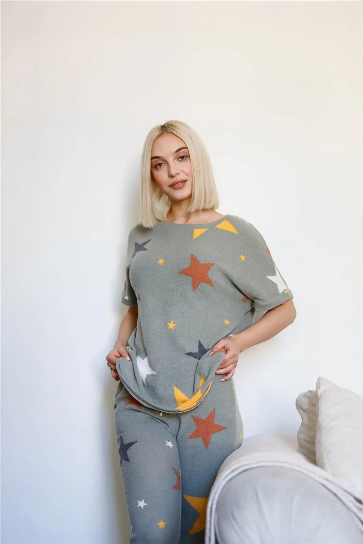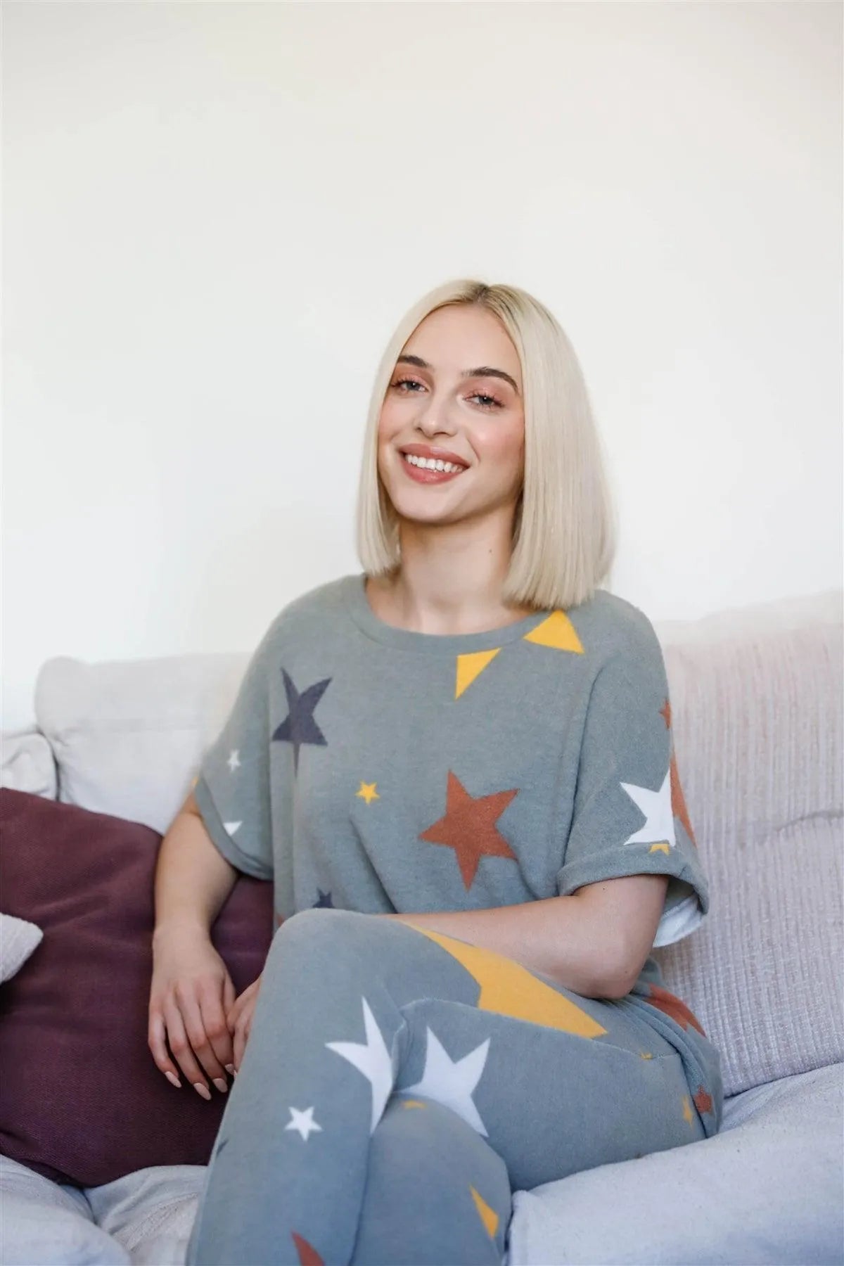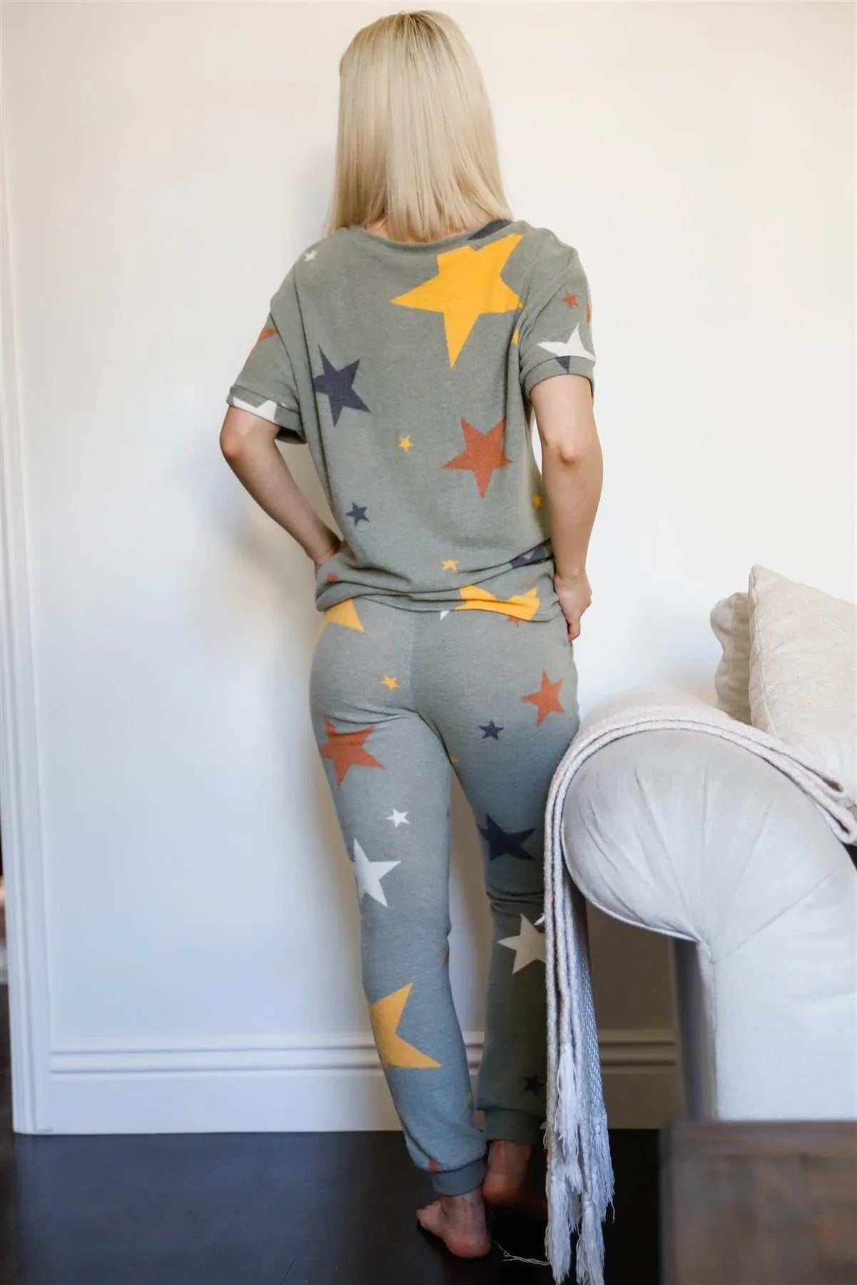 Sage Star Print Flannel Loose T-Shirt & Sweatpants Set /1-1-1