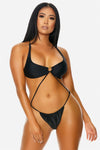 🖤 Item Features: Strappy one piece swimsuit features gold metal ring detail and drawstring gathered thong bottoms.