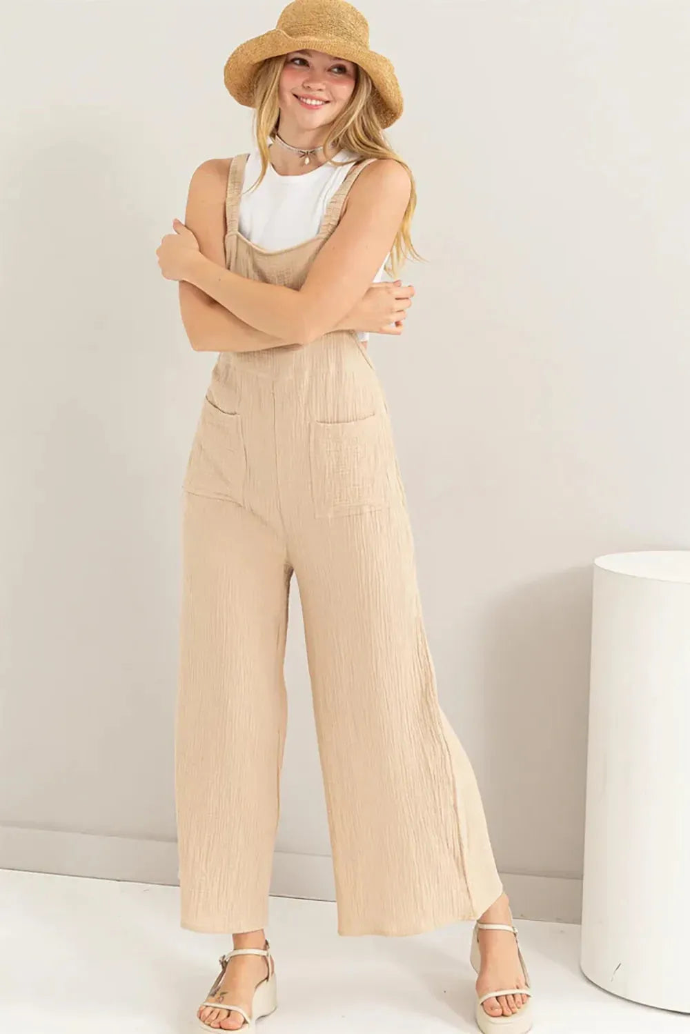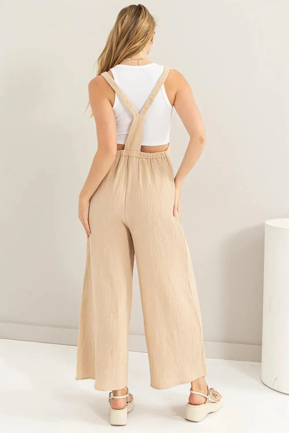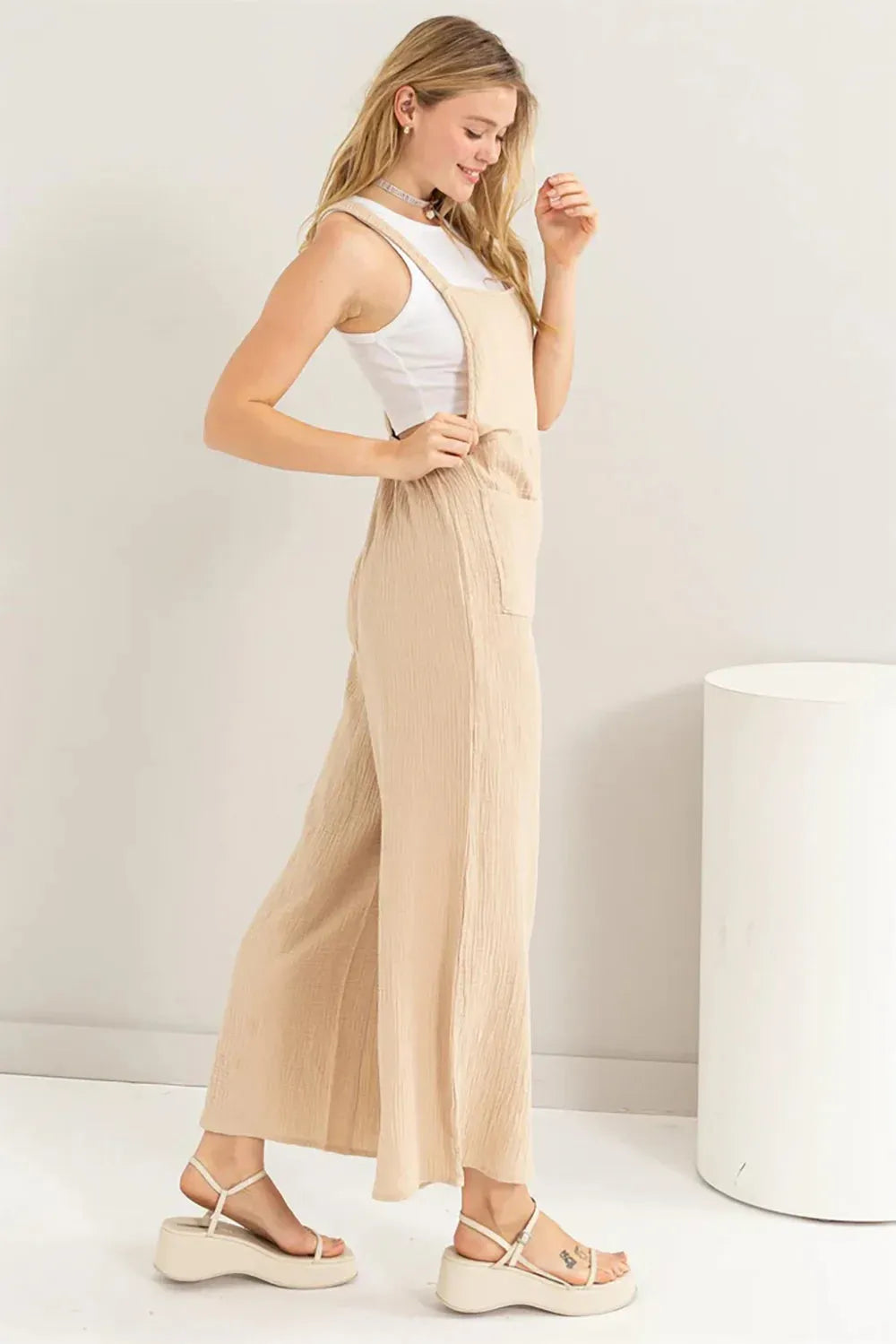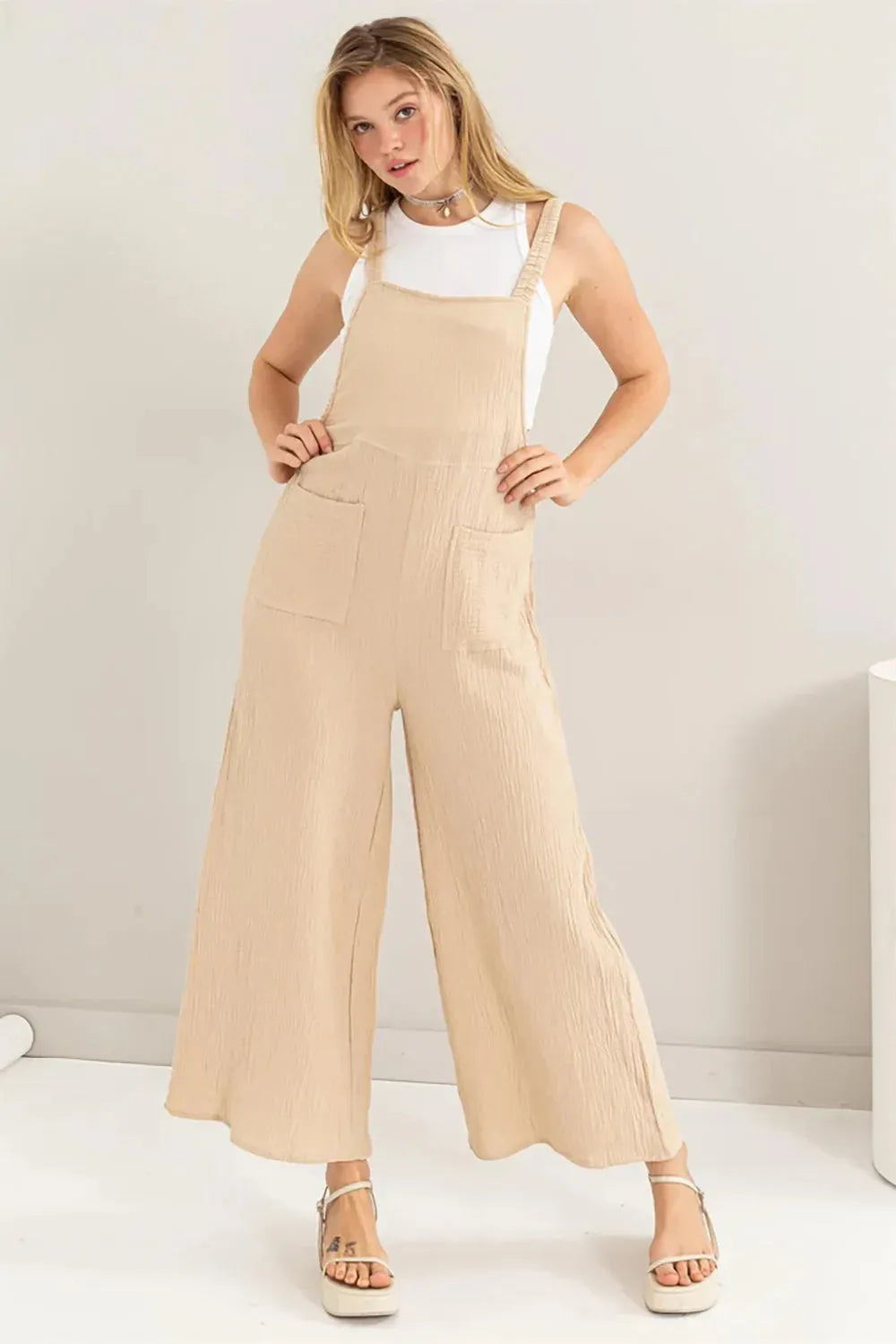Sand Cotton Gauze Wide Leg Adjustable Straps Pockets Overall Jumpsuit