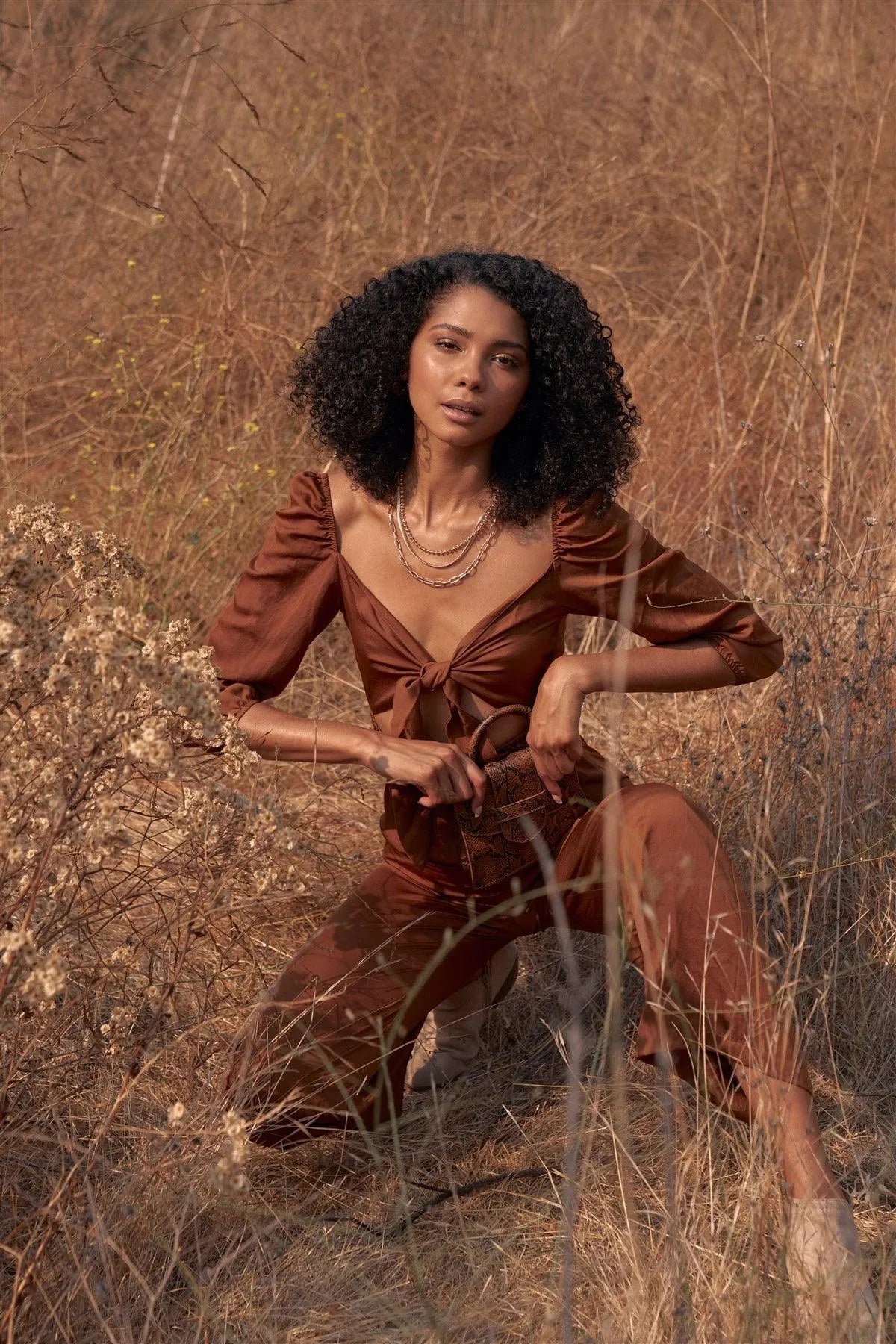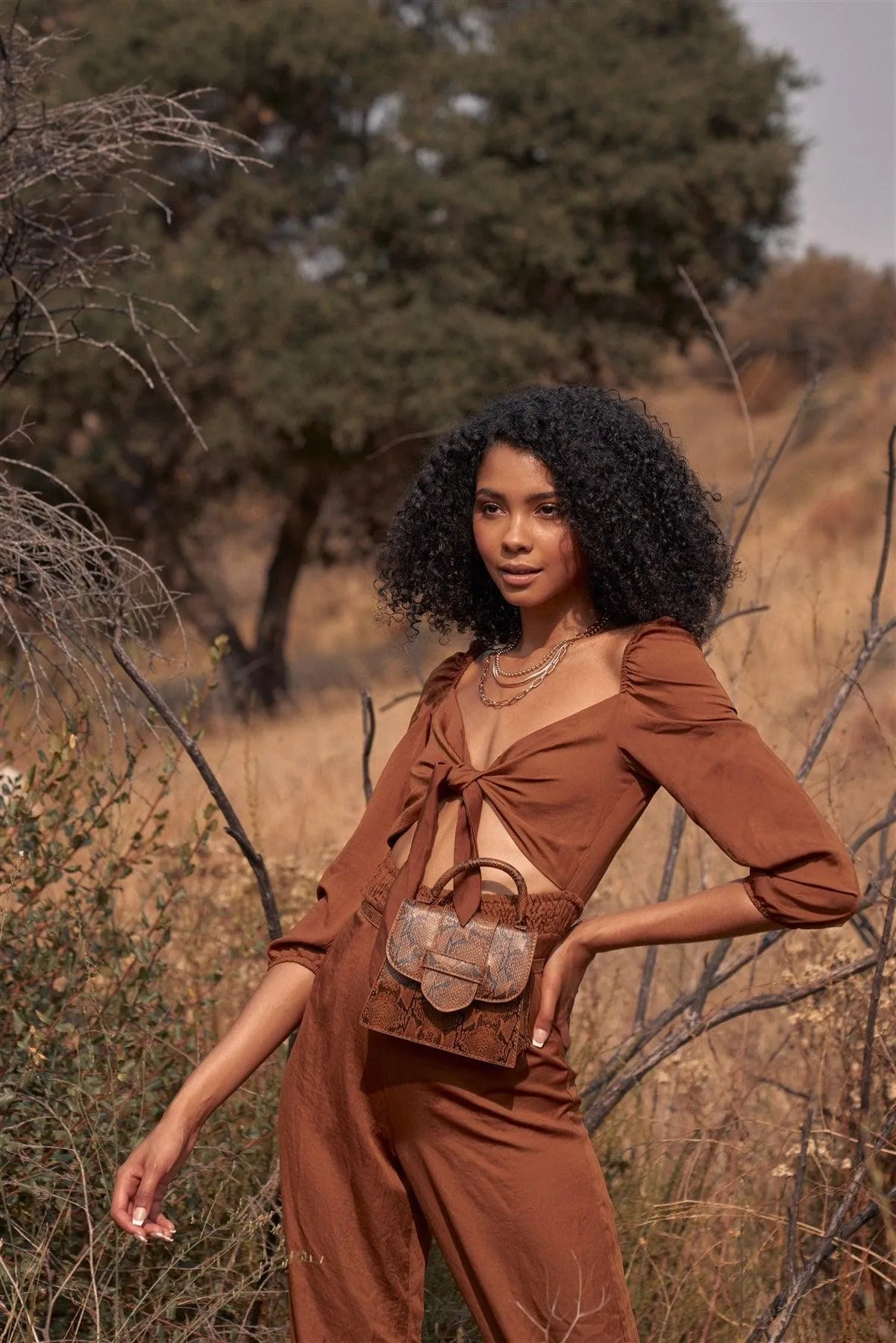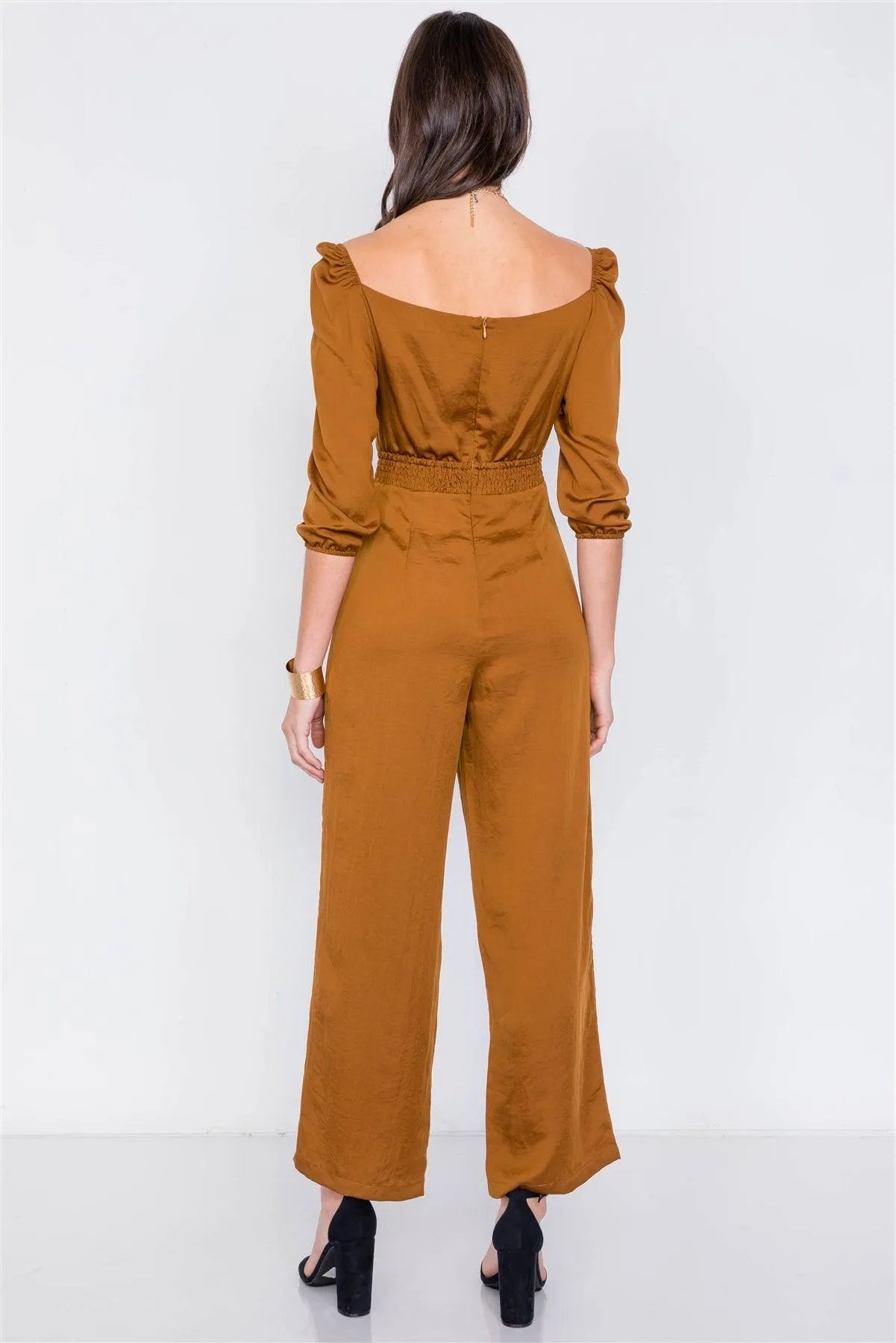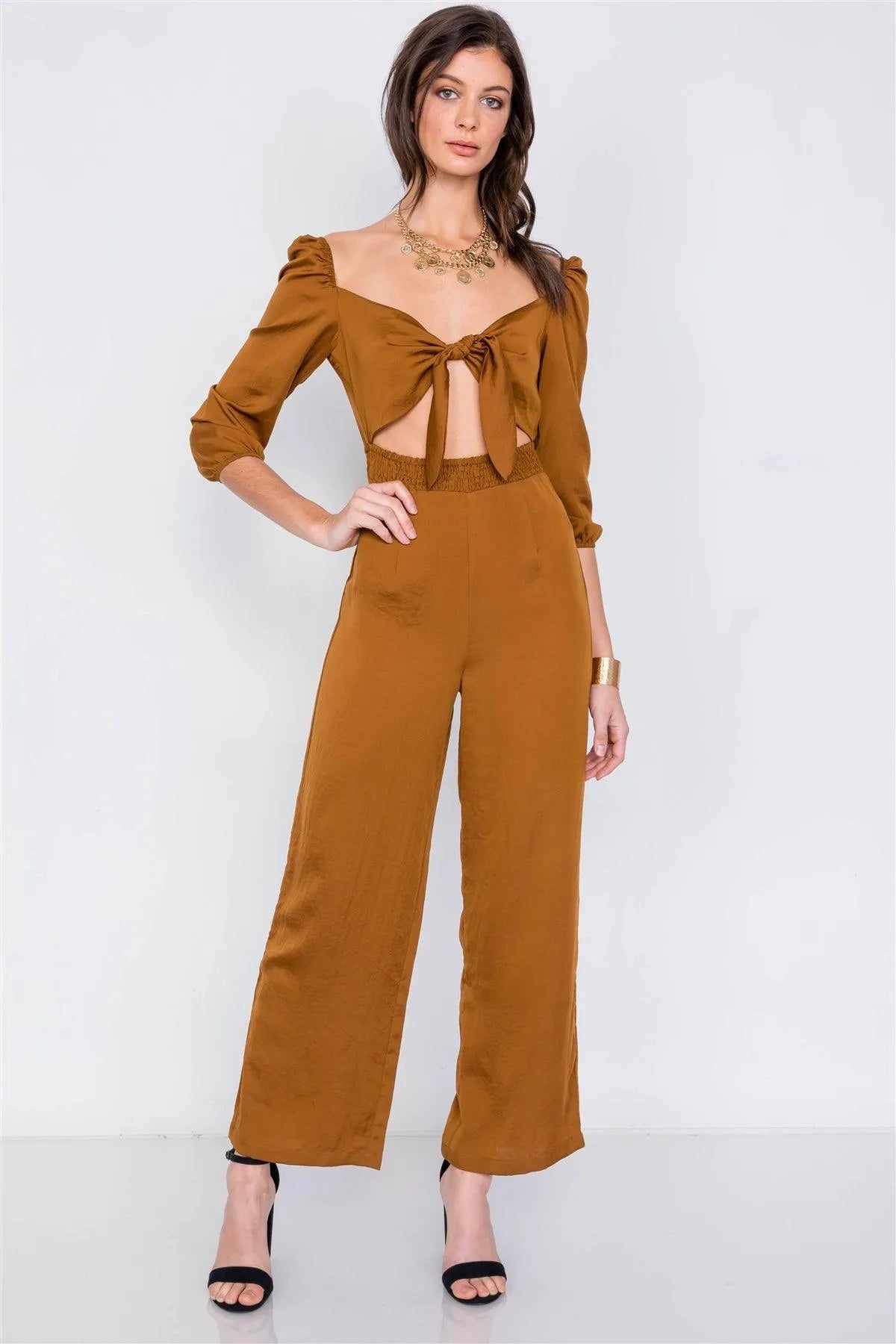 🖤 Item Features: Brown, satin, solid, center front cut-out bow wrap detail, elastic 3/4 sleeve cuff and shoulder, wide leg, ruched elastic waist band, unlined, non-stretch, boho, casual, chic, classic, vintage, fall/winter collection