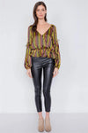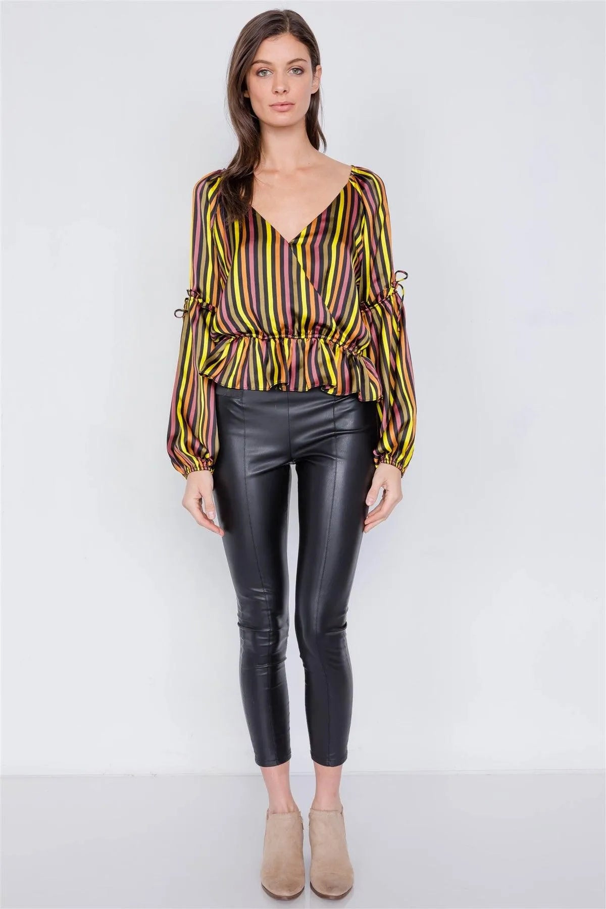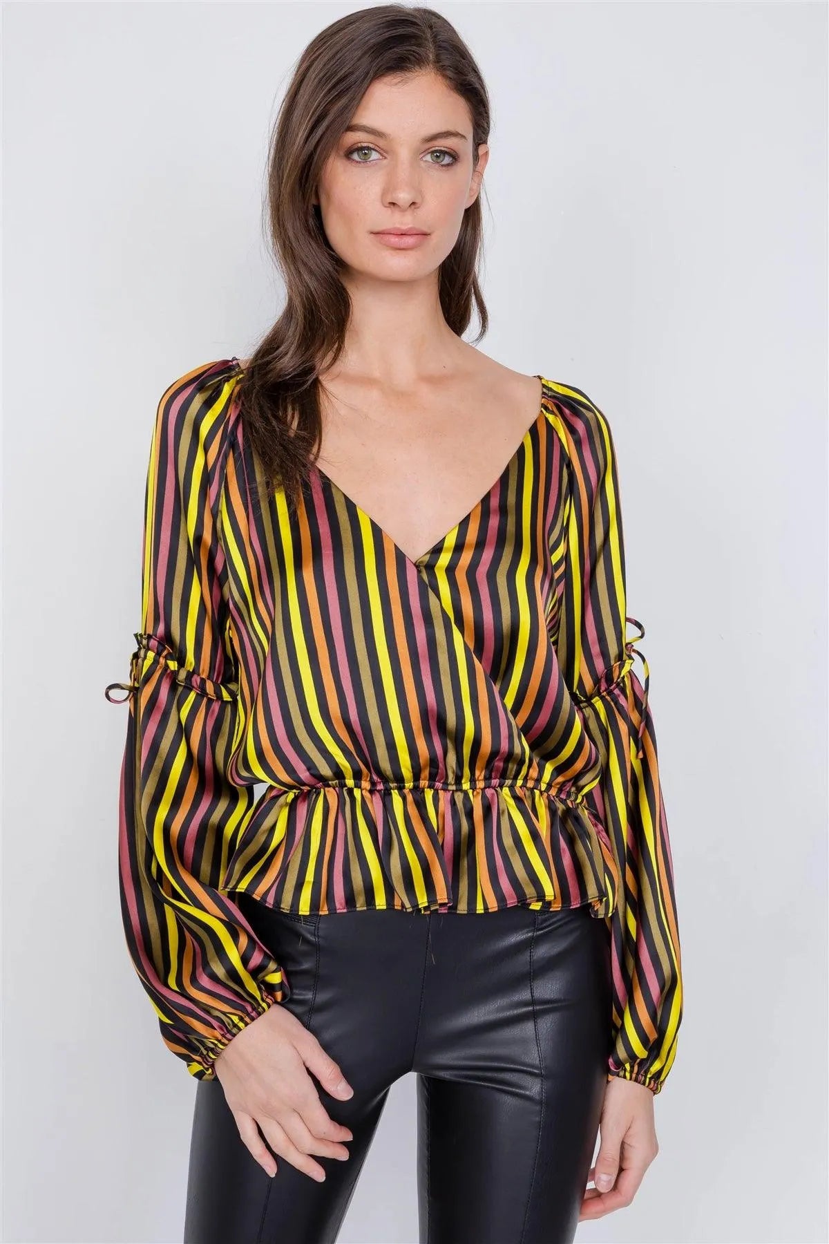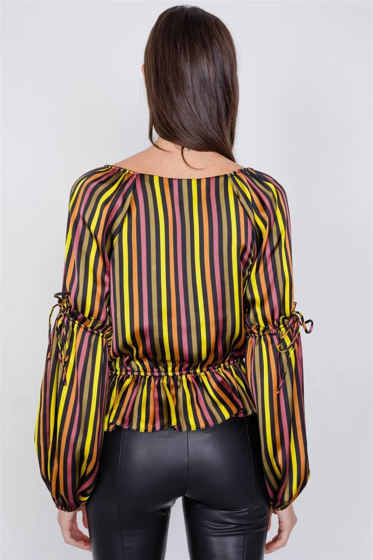 Satin Multi Stripe V-Neck Tiered Balloon Puff Sleeve Peplum Top /3-2-1