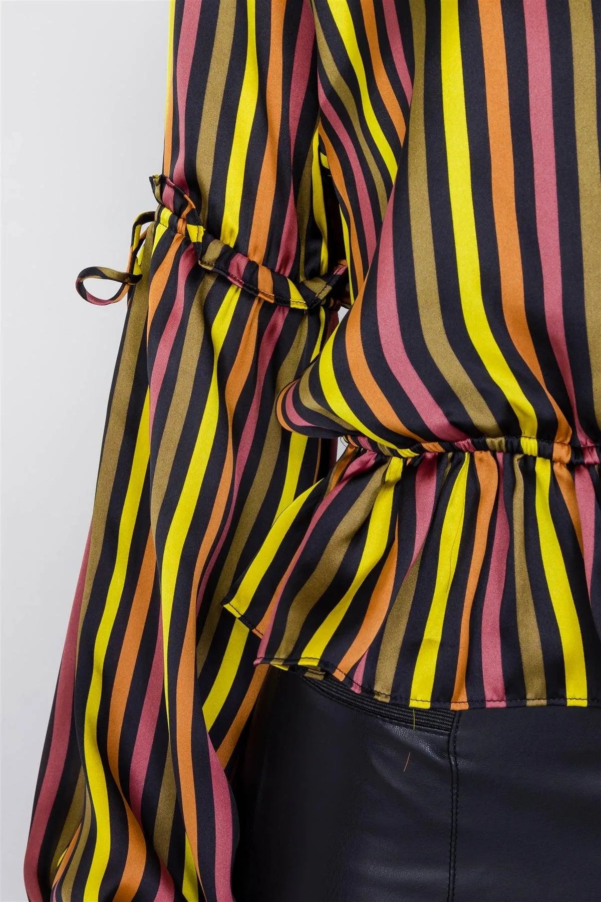 🖤 Top Features: Peplum top, V-neck, tiered puff sleeve, cinched elastic cuff, flounce tie trim sleeve, green yellow red orange and black stripes, satin, chic, classic, vintage, elastic shoulder, unlined, semi-stretch, lounge wear, fall/winter collection