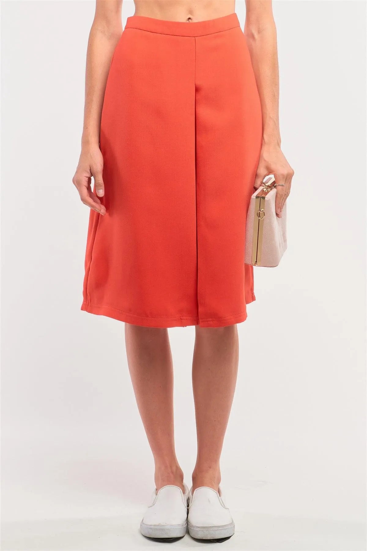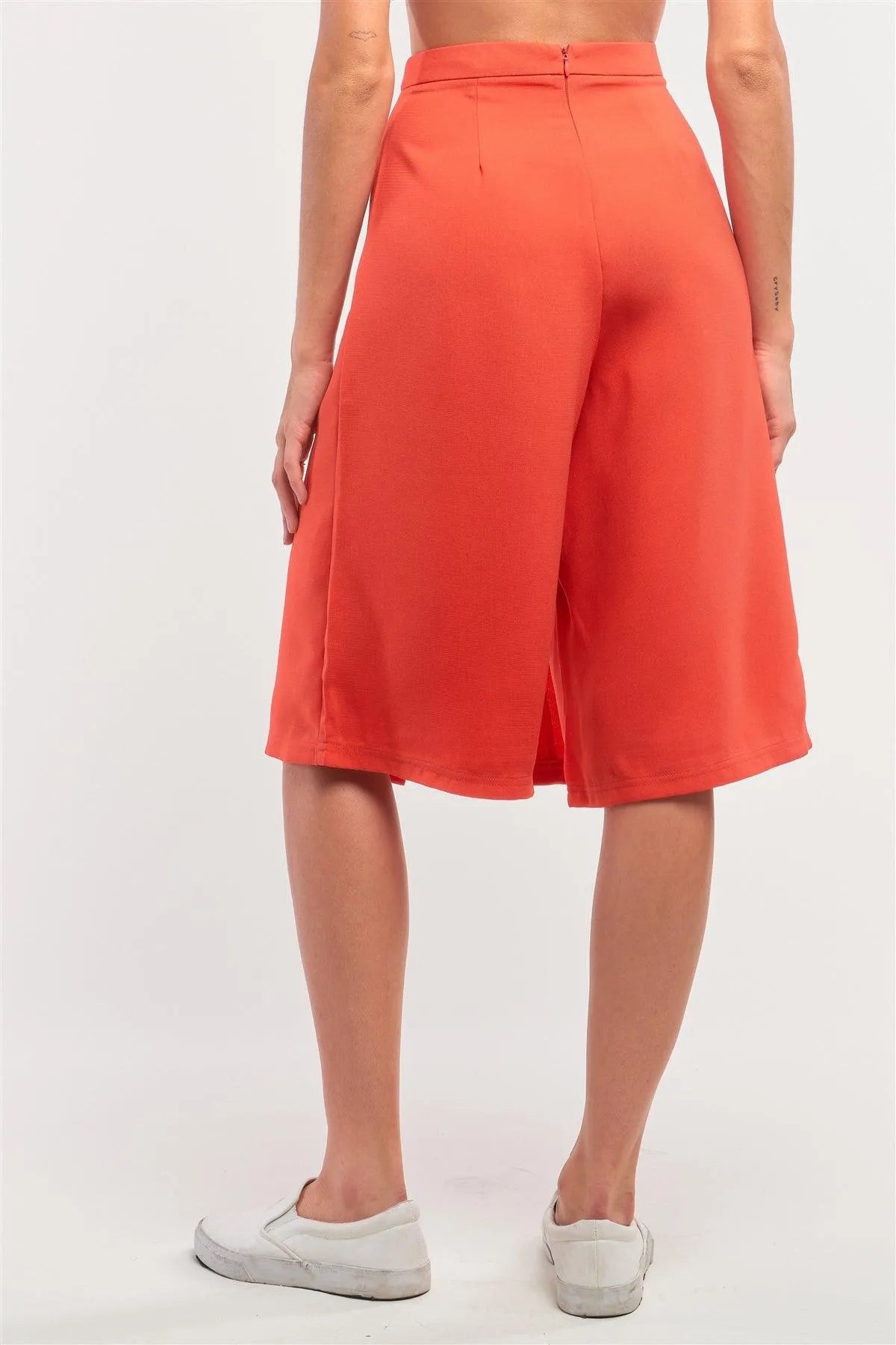 🖤 Item features: Scarlet red, solid, high waisted, pleated front, back zipper and hook&eye closure, wide leg, knee-length, short+skirt construction, regular fit, unlined, non-stretch, business casual, pop of color, stylish, office wear, statement item, all new fall/winter