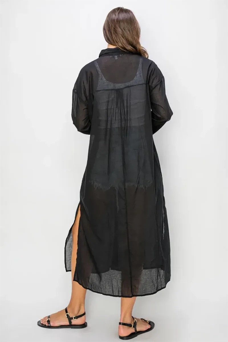 Introduce your boutique customers to the ultimate versatile beach essential with our lightweight sheer cover-up. This effortlessly chic shirt dress features a classic button-down design, convenient front pockets, and breezy side slits for easy movement. Perfect for layering over swimwear or pairing with summer basics, this semi-transparent showstopper in sophisticated black delivers both style and functionality for your fashion-forward clientele.