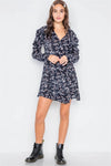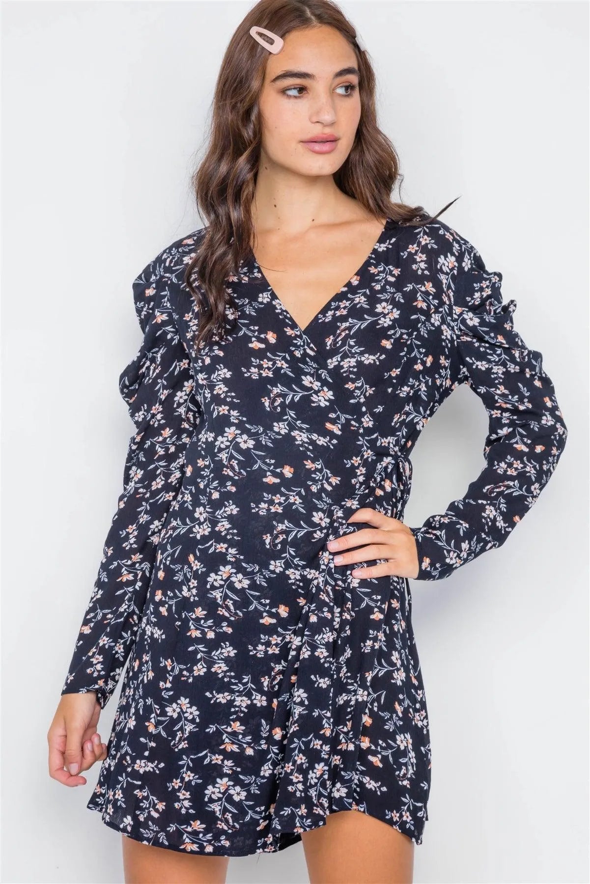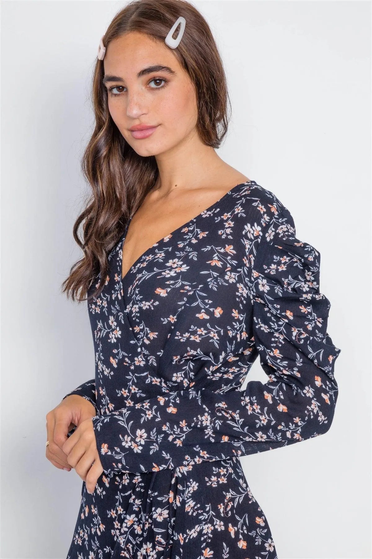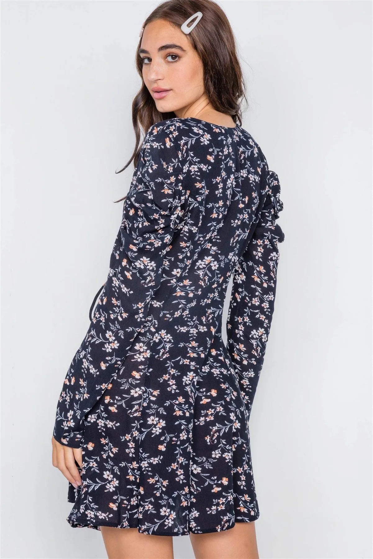 Sheer Navy Floral Cinched Ruffle Shoulder Mini Dress /2-2-2