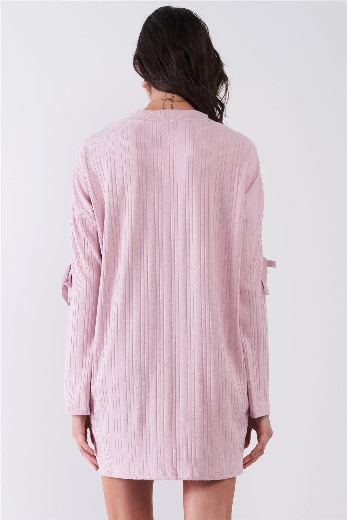 🖤Item Features: Shell pink, solid, ribbed, long sleeve with self-tie detail, mock neckline, loose fitting, mini length, unlined, non-sheer, stretchy, casual, cute, comfy, spring/summer collection