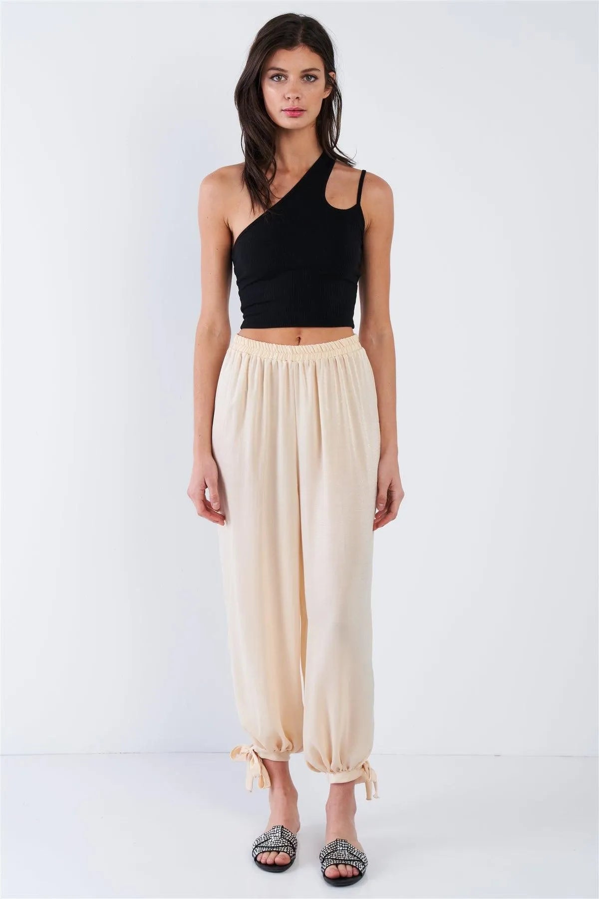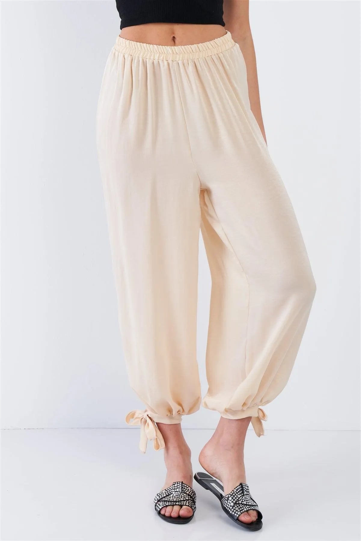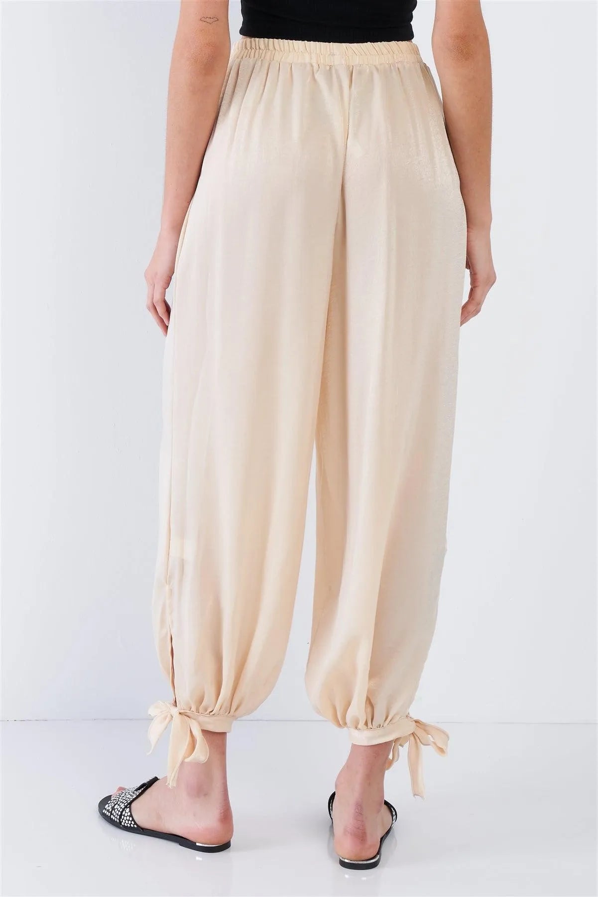 Pant Features: silk, yellow, casual, solid, self tie ankle cut out bow, elastic waist, chic, active, semi-sheer, unlined, stretchy.Model is 5'9 wearing a size Small ( Waist: 23.5", Bust: 32B, Hips: 36")Item Measurements: Length: 34.5" , Waist: 24"Item comes pre-packed True to size