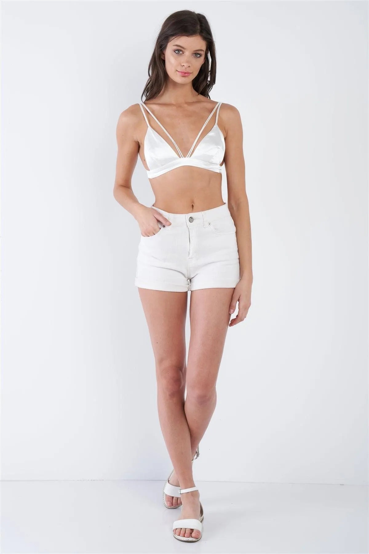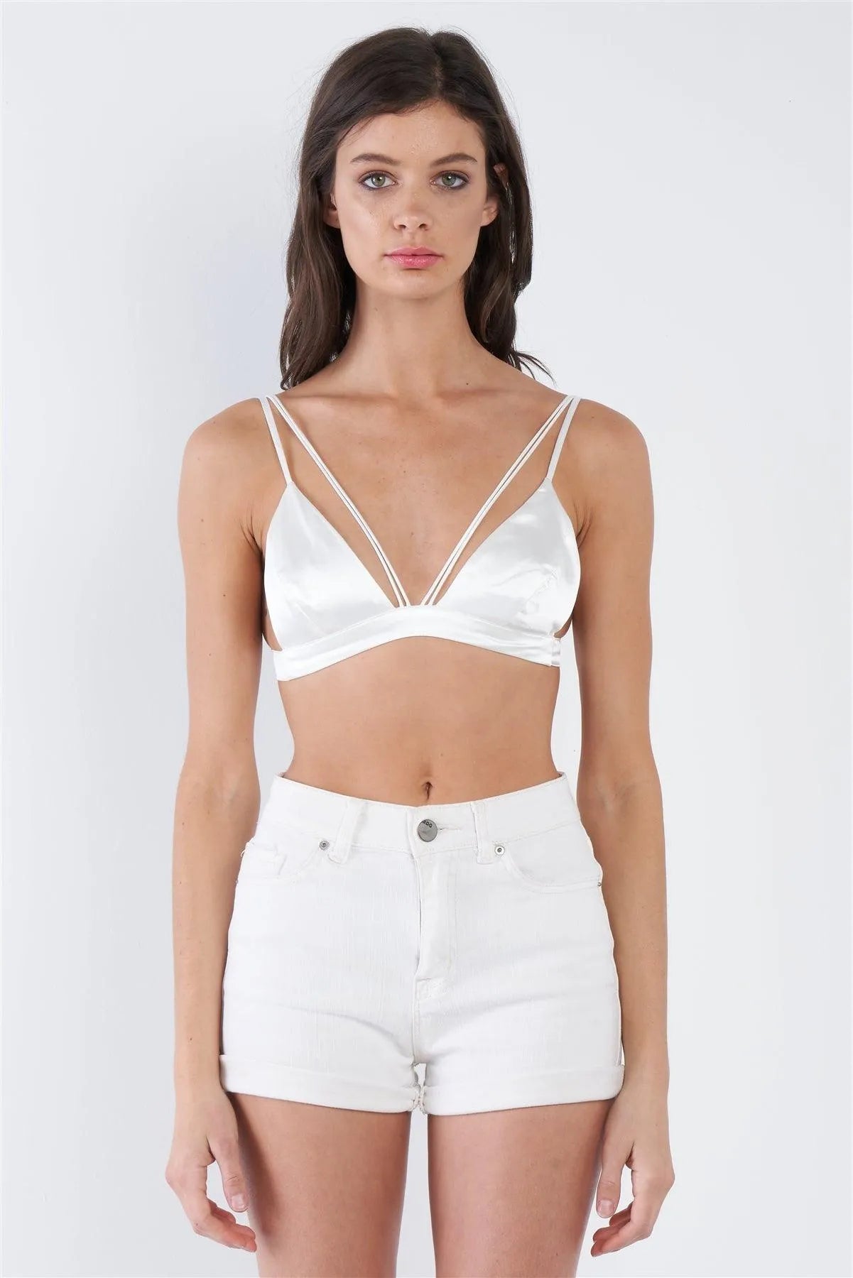 Bra Features: silk, solid, strappy, adjustable cami straps, back adjustable clasp closure, stretchy, lined.