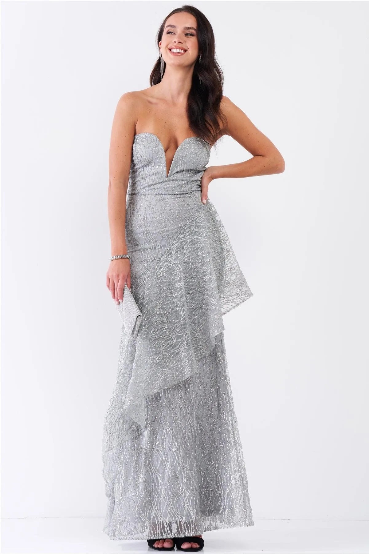 Frost Queen Silver Glitter Strokes Sleeveless Sweetheart Neckline Drape Trim Maxi Dress /3-2-1